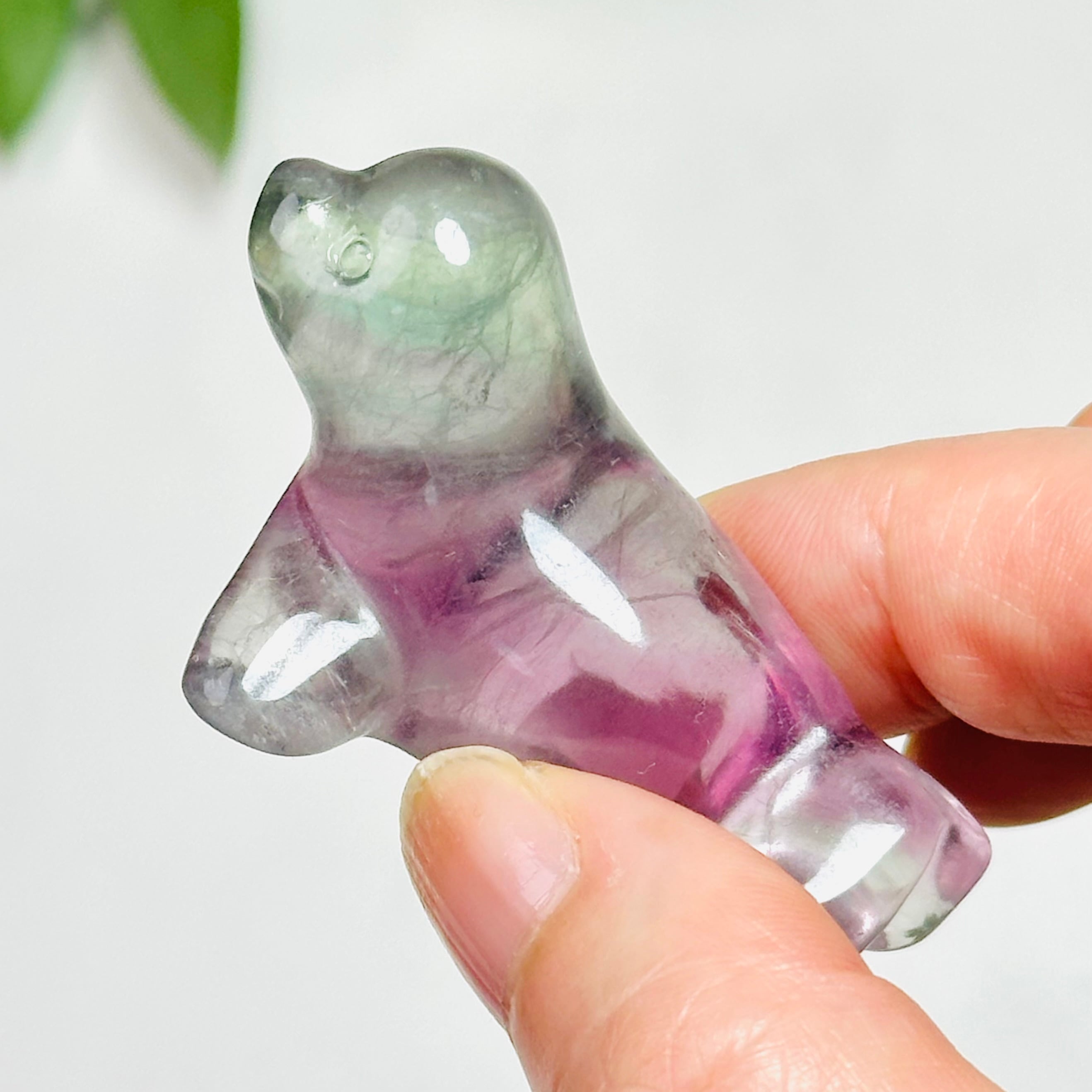 透明感あふれるグリーンとパープルが美しいフローライトのアシカさん。愛らしいフォルムと天然石ならではの優しい輝きは、眺めているだけで心が癒されます。光にかざすとグラデーションが浮かび上がり、お部屋に幻想的な彩りを添えてくれます。