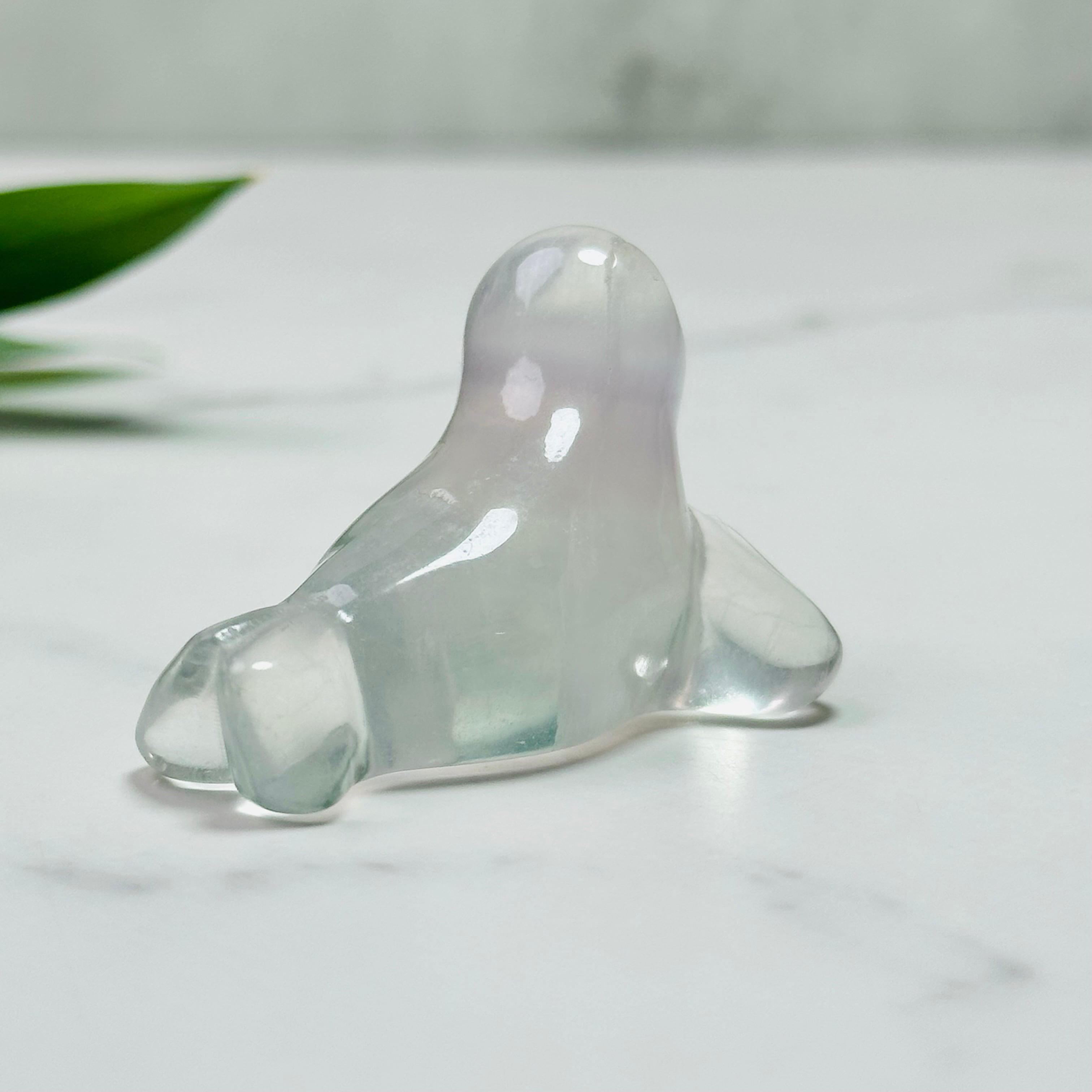 透明感あふれるグリーンとパープルが美しいフローライトのアシカさん。愛らしいフォルムと天然石ならではの優しい輝きは、眺めているだけで心が癒されます。愛らしいフォルムと天然石ならではの優しい輝きは、眺めているだけで心が癒されます。光にかざすとグラデーションが浮かび上がり、お部屋に幻想的な彩りを添えてくれます。