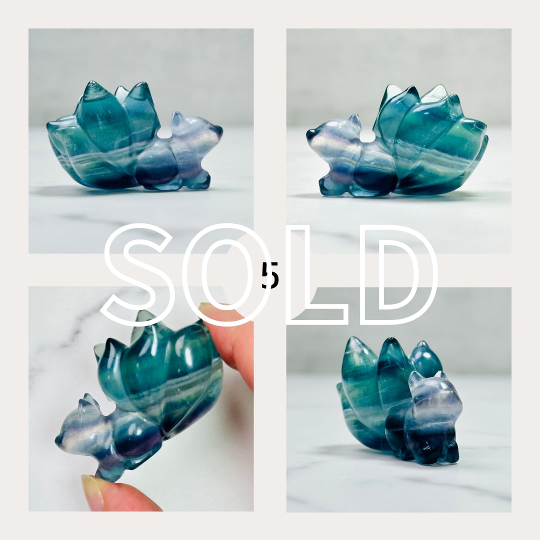 ボリュームのある豊かな尻尾がとても可愛らしい九尾の狐です。キャンディフローライトの美しい色彩と縞模様が魅力で、角度によって表情が変わり、またその美しいグラデーションで楽しませてくれます。大人可愛い天然石オブジェとして、ギフトにもおすすめです。