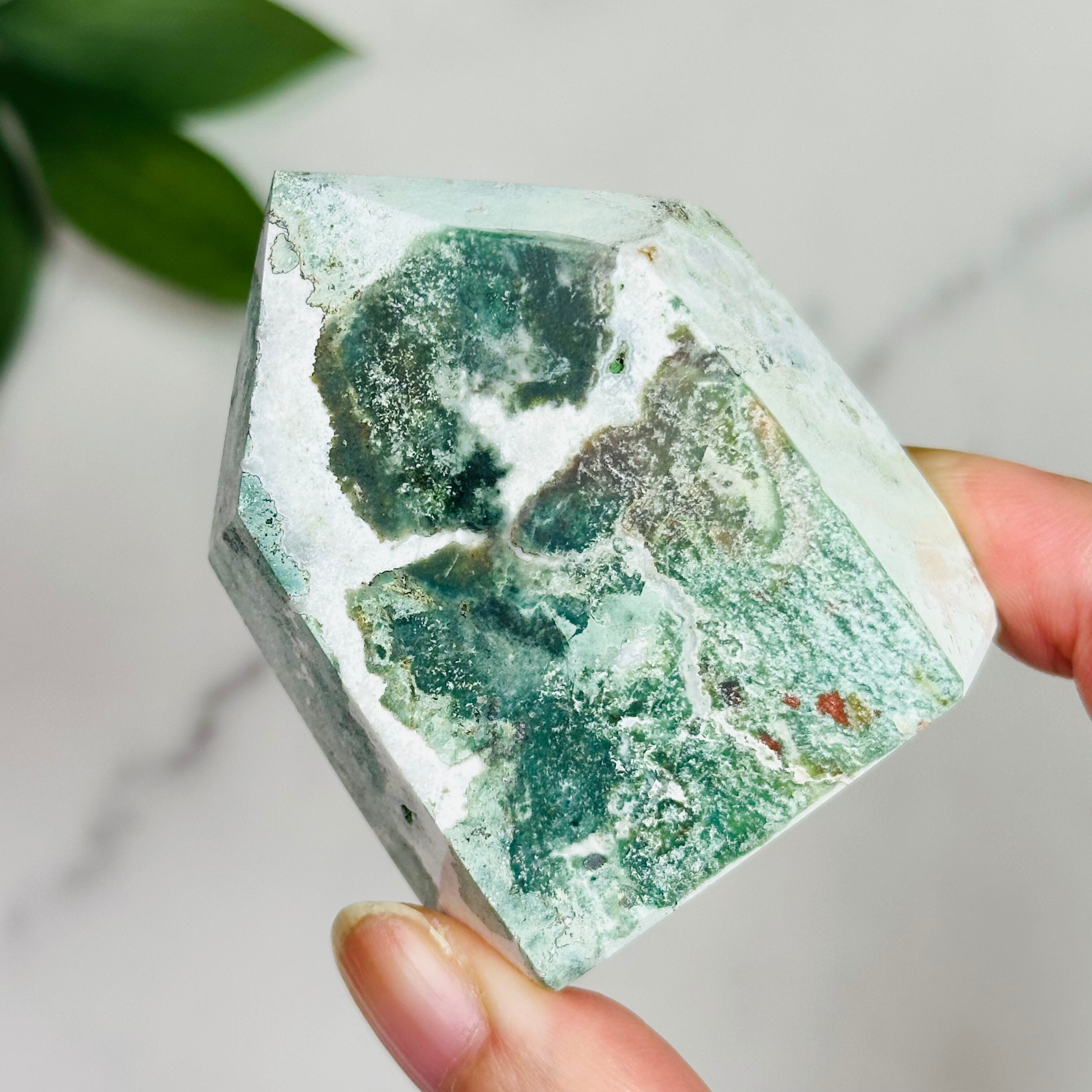 淡い色彩が溶け合うような模様が美しいユニコーンジャスパーのタワー。まるで幻想的なアートを閉じ込めたかのような模様は、ひとつとして同じものがなく、自然が生み出す唯一無二の魅力を感じられます。六角柱の形状はすっきりとした存在感を放ち、お部屋やデスクに飾るだけで癒しのインテリアになります。