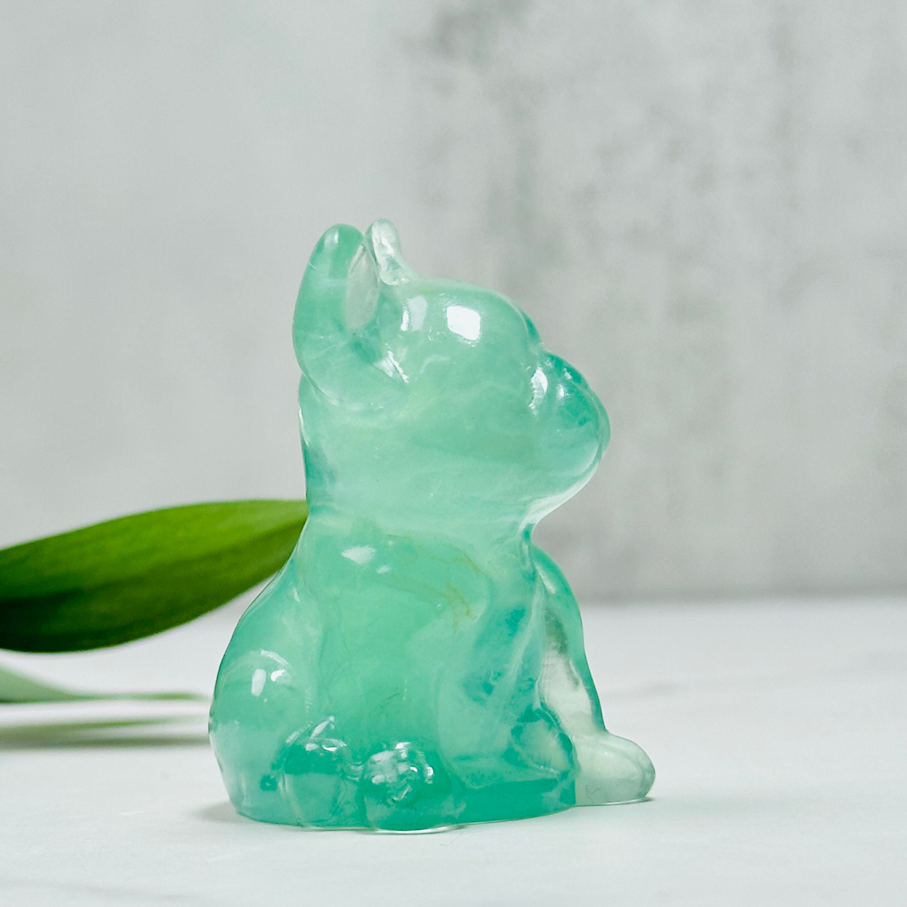 透明感のあるグリーンが美しいフローライトを丁寧に彫刻したフレンチブルドッグ。丸みを帯びたフォルムと愛らしい表情が特徴で、眺めているだけで心が和みます。天然石ならではの優しい色合いは光を受けるとさらに際立ち、お部屋をナチュラルで癒しの空間に彩ります。リビングや玄関、デスクの上に置けば、可愛い存在感と上品さを同時に楽しめるインテリアに。犬好きな方への贈り物にもぴったりのアイテムです。