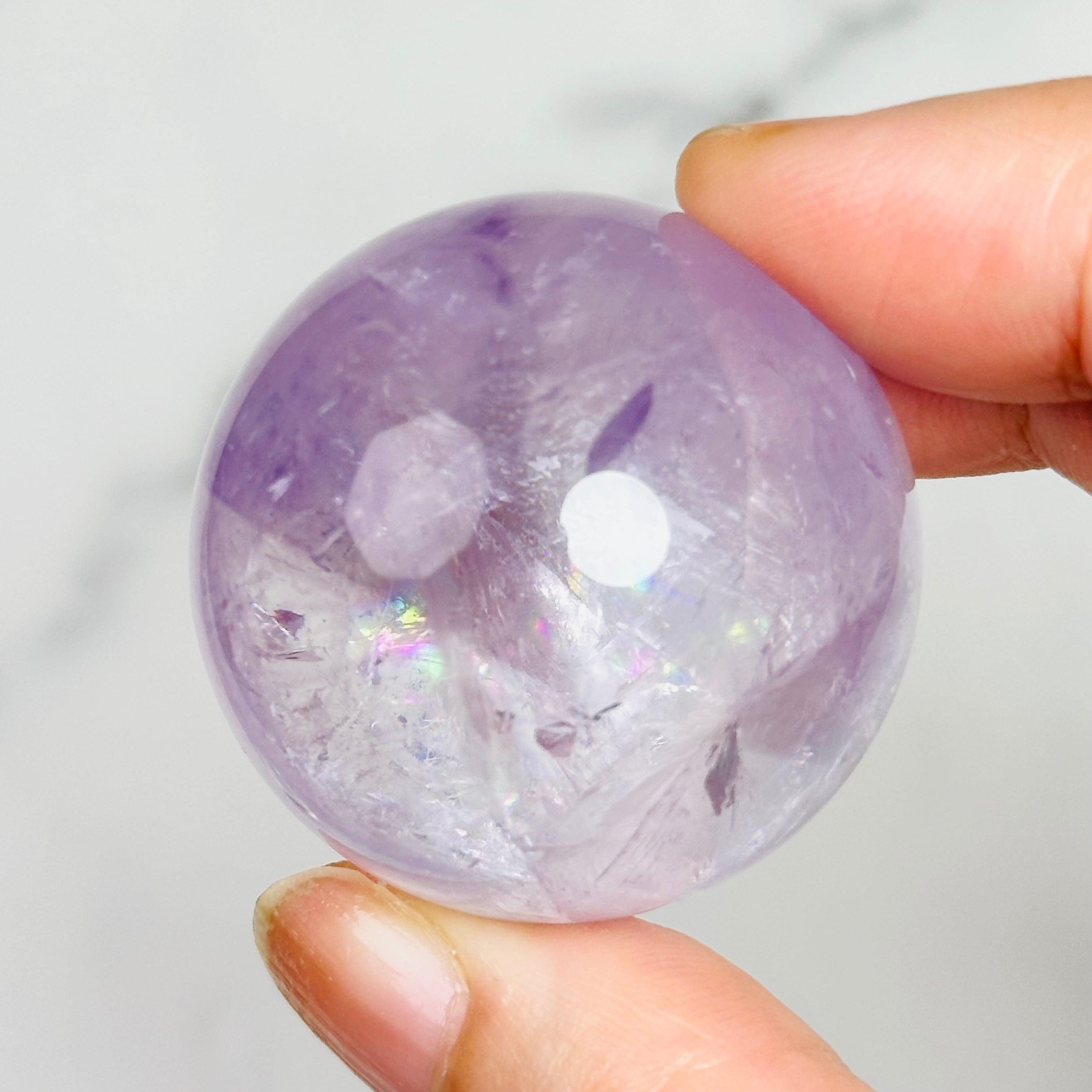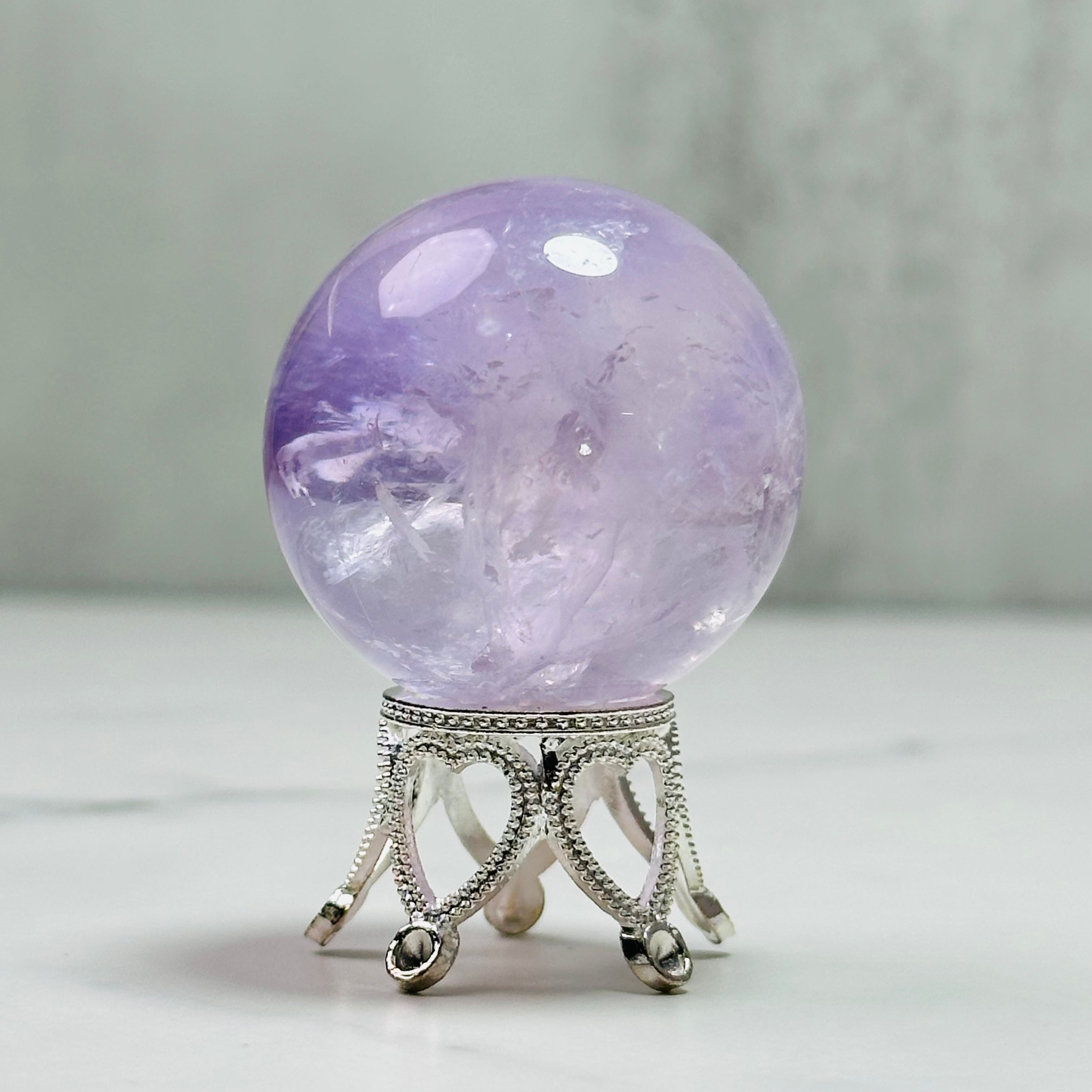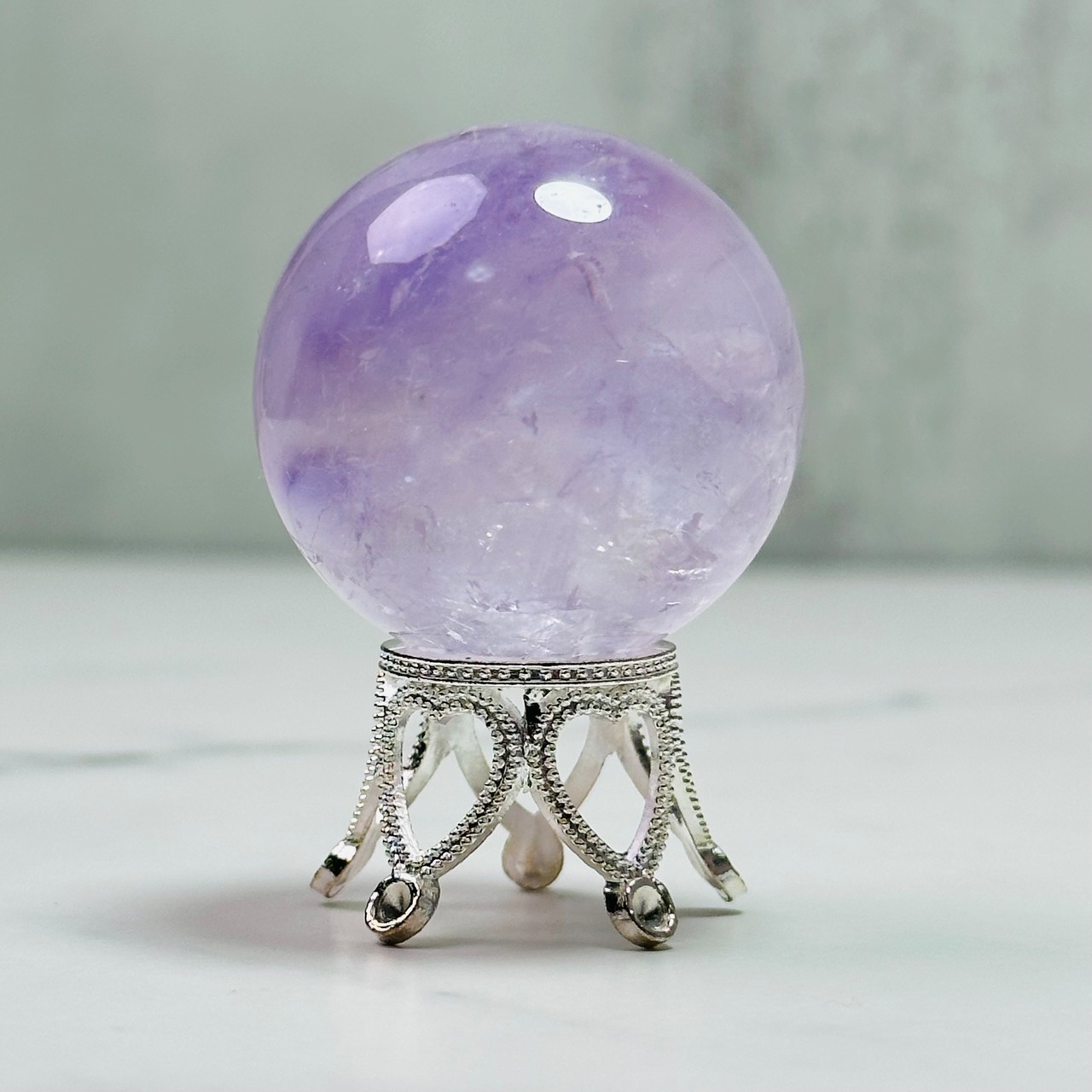 優しいラベンダーカラーが美しいアメジストスフィア。可愛らしいサイズでデスクや玄関、ベッドサイドなどに飾れば空間を上品に彩ってくれます。丸みのあるフォルムは柔らかな印象を与え、日常に取り入れやすいインテリアストーンです。