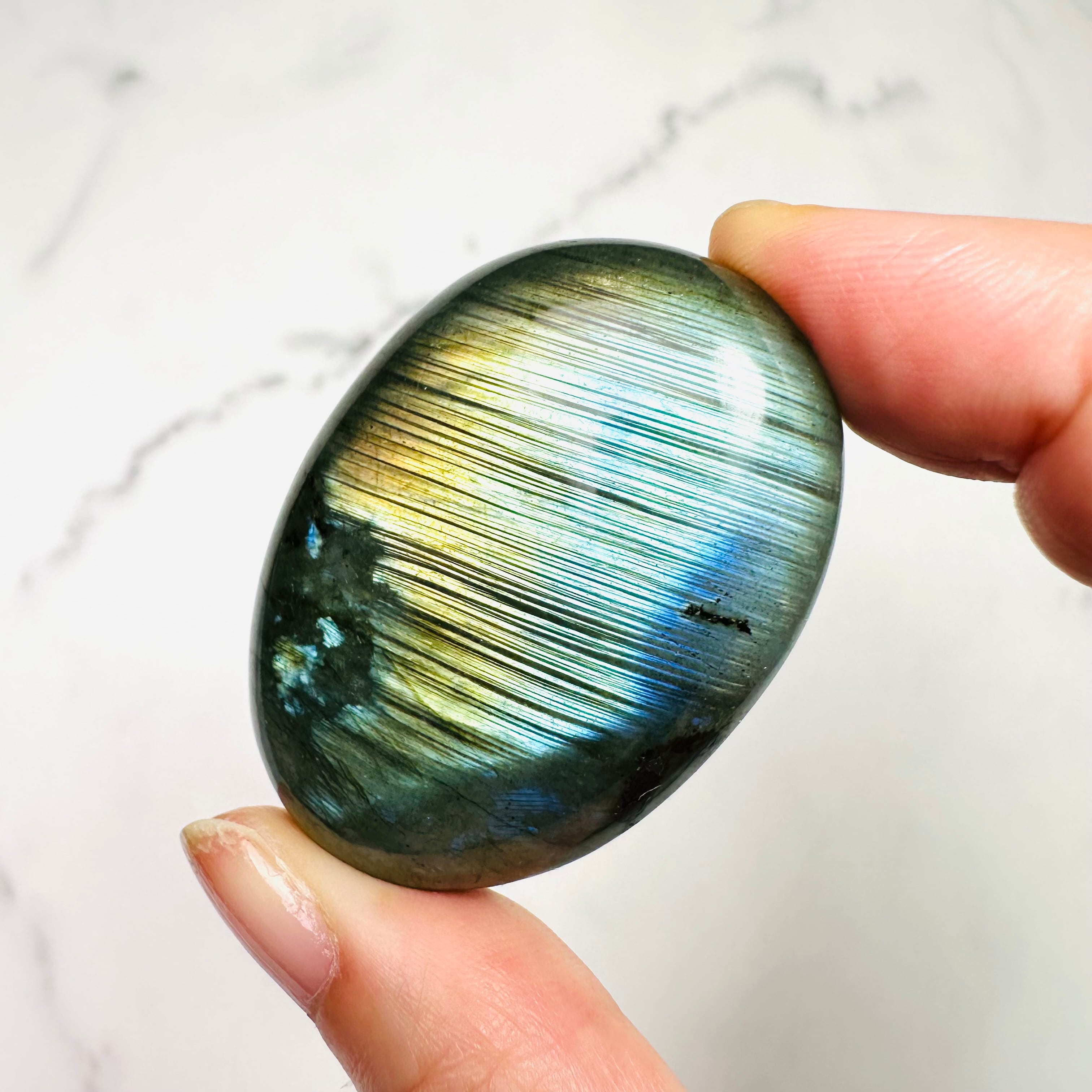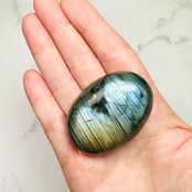 美しいシラーが角度によって輝きを変える、幻想的なラブラドライトのパームストーン。細かなゴールドラメが散りばめられ、まるで星雲を閉じ込めたようなミステリアスな魅力を放ちます。手に取ればその存在感と輝きに思わずうっとり。お部屋のインテリアや瞑想のアイテムとしてもおすすめです。