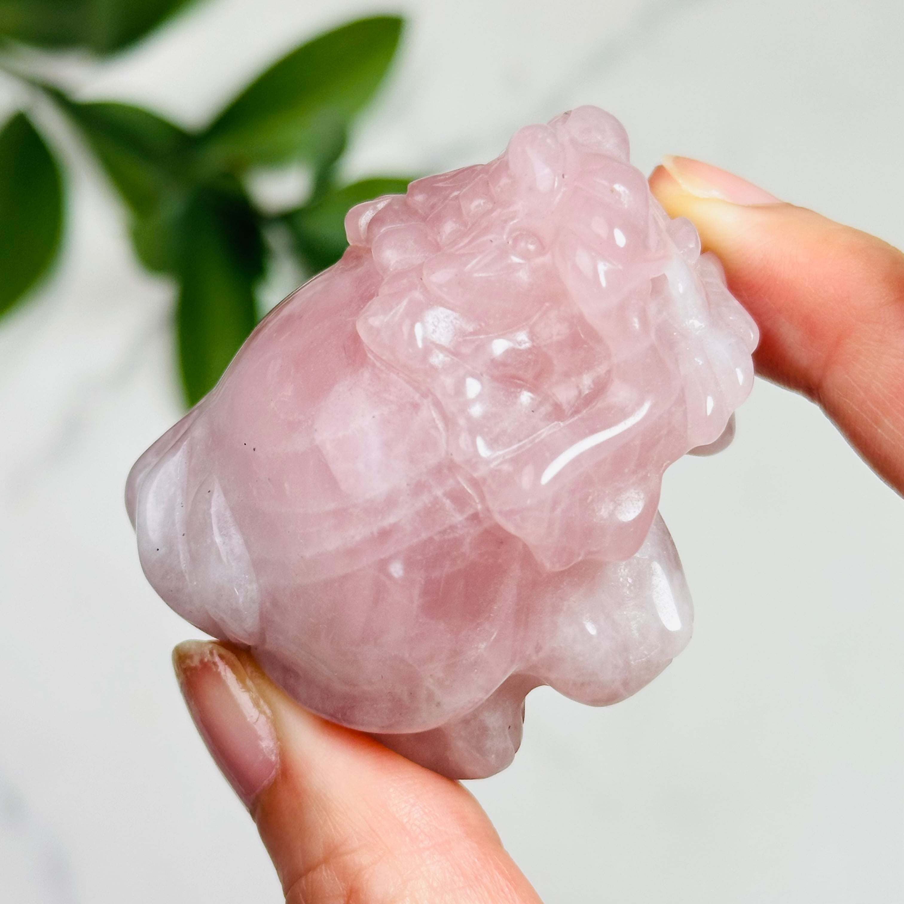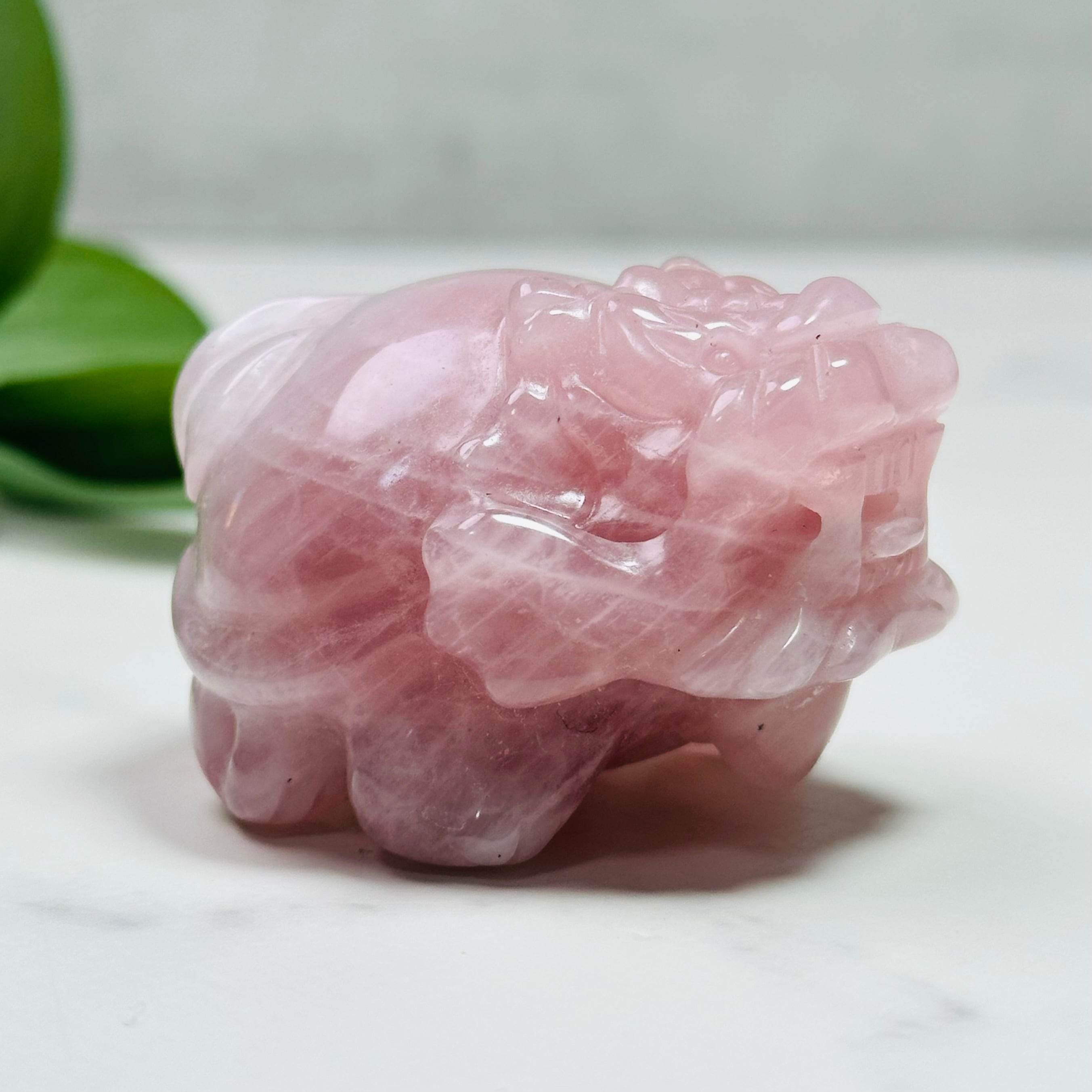 発色のいいピンクのローズクォーツロングイ(龍亀)さん。龍の力強さと亀の安定を併せ持つ縁起のいいアイテムです。丸みのあるフォルムは見ているだけで心を和ませてくれます。玄関やリビング、デスク周りに置いて癒しのエネルギーを受け取ってください。