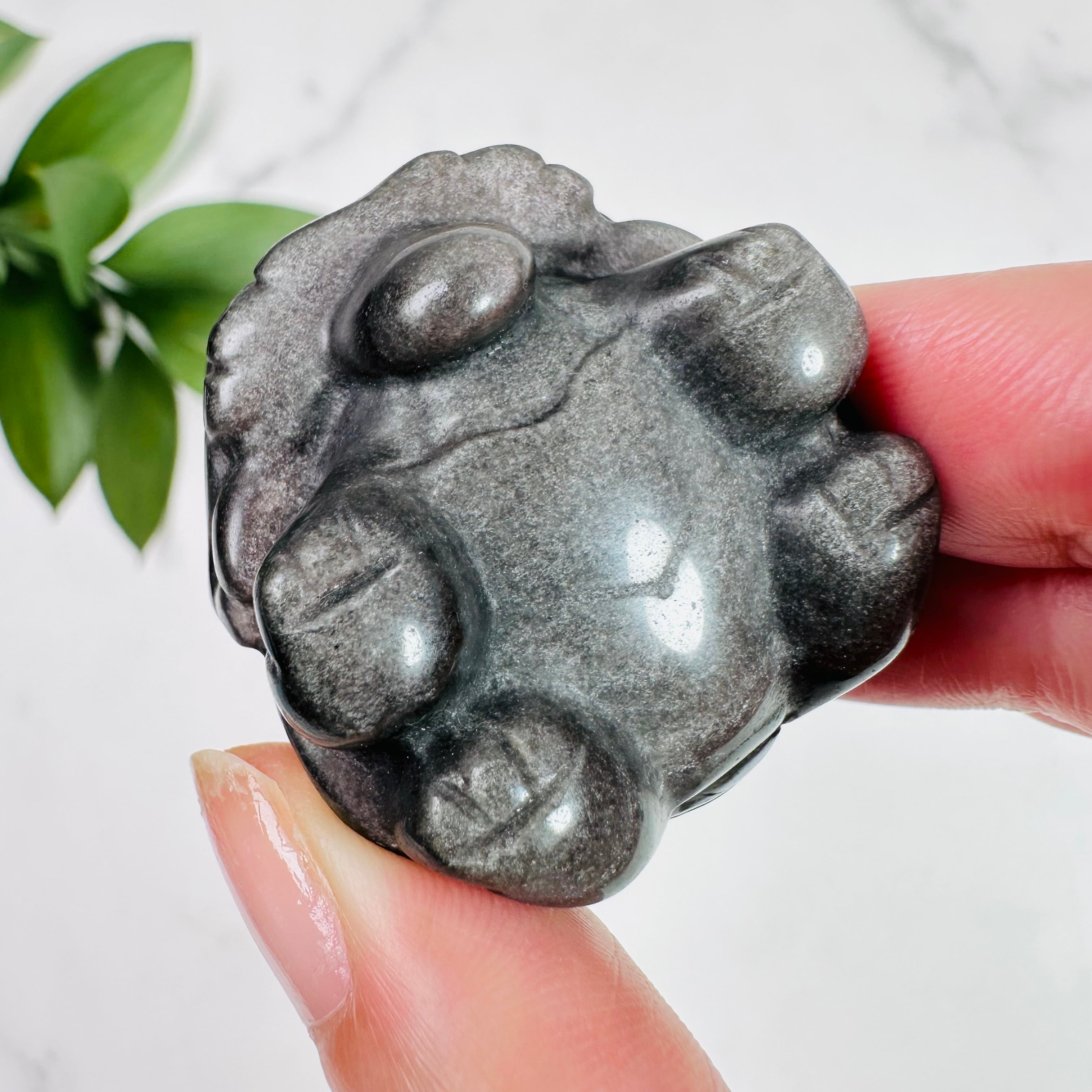 深いブラックの中に銀色の光がきらめくシルバーオブシディアンのロングイ(龍亀)さん。ロングイは龍の力強さと亀の安定を併せ持つ縁起のいいモチーフです。見る角度によって浮かび上がるメタリックな輝きが神秘的な存在感を放ちます。玄関やリビングに飾れば空間を凛と引き締め、上品でモダンな印象をもたらします。男性への贈り物としても喜ばれる人気の天然石オブジェです。