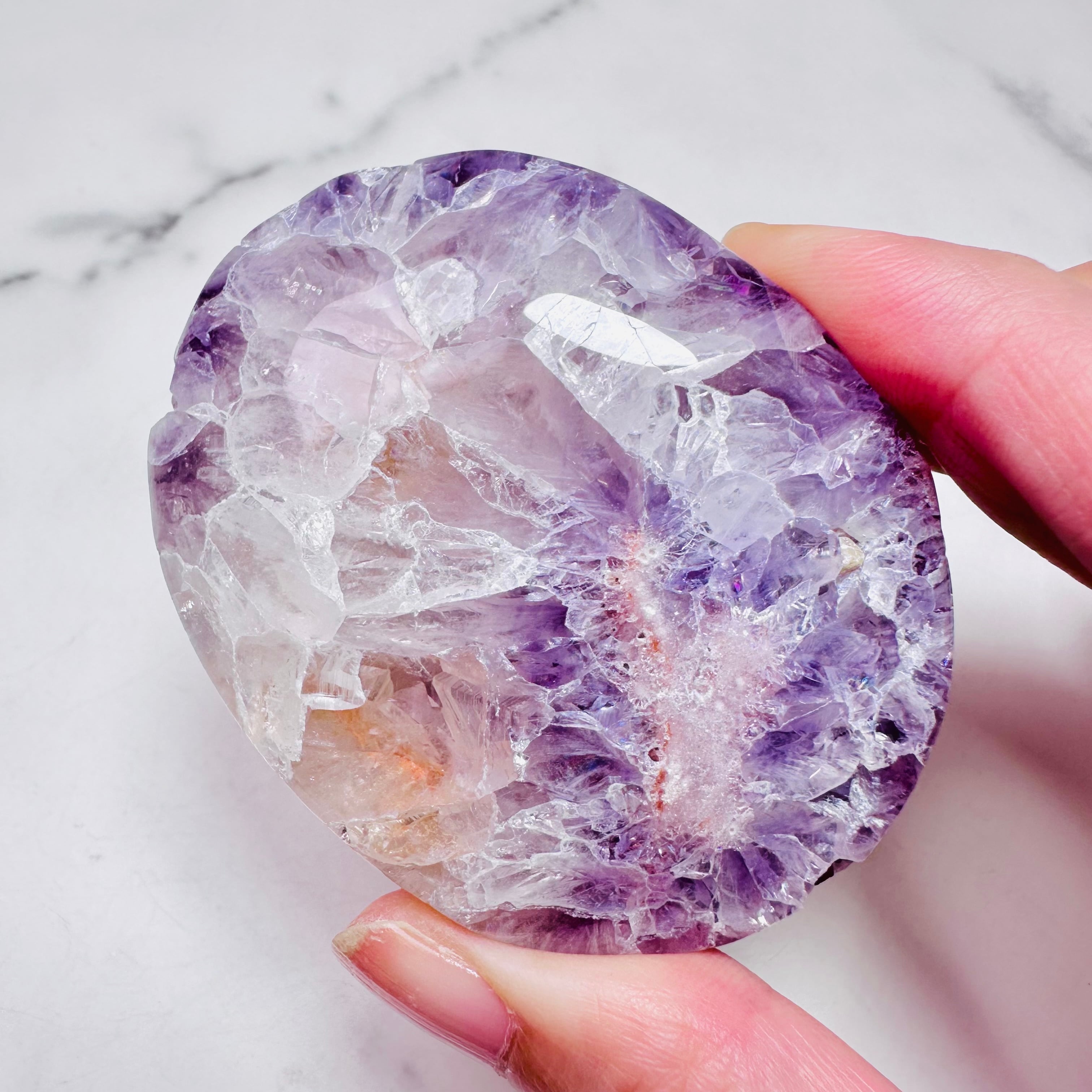 淡いピンクやラベンダー色が美しいピンクアメジストを丁寧に磨き上げたパームストーン。手にすっぽりと収まるサイズ感で、滑らかな質感が心地よく、眺めているだけで穏やかな気持ちにしてくれます。光に透けると幻想的に輝き、インテリアとしても存在感抜群。デスクや寝室、玄関に飾れば、空間を優しく包み込む癒しのアクセントになります。大切な方へのギフトにもおすすめのアイテムです。