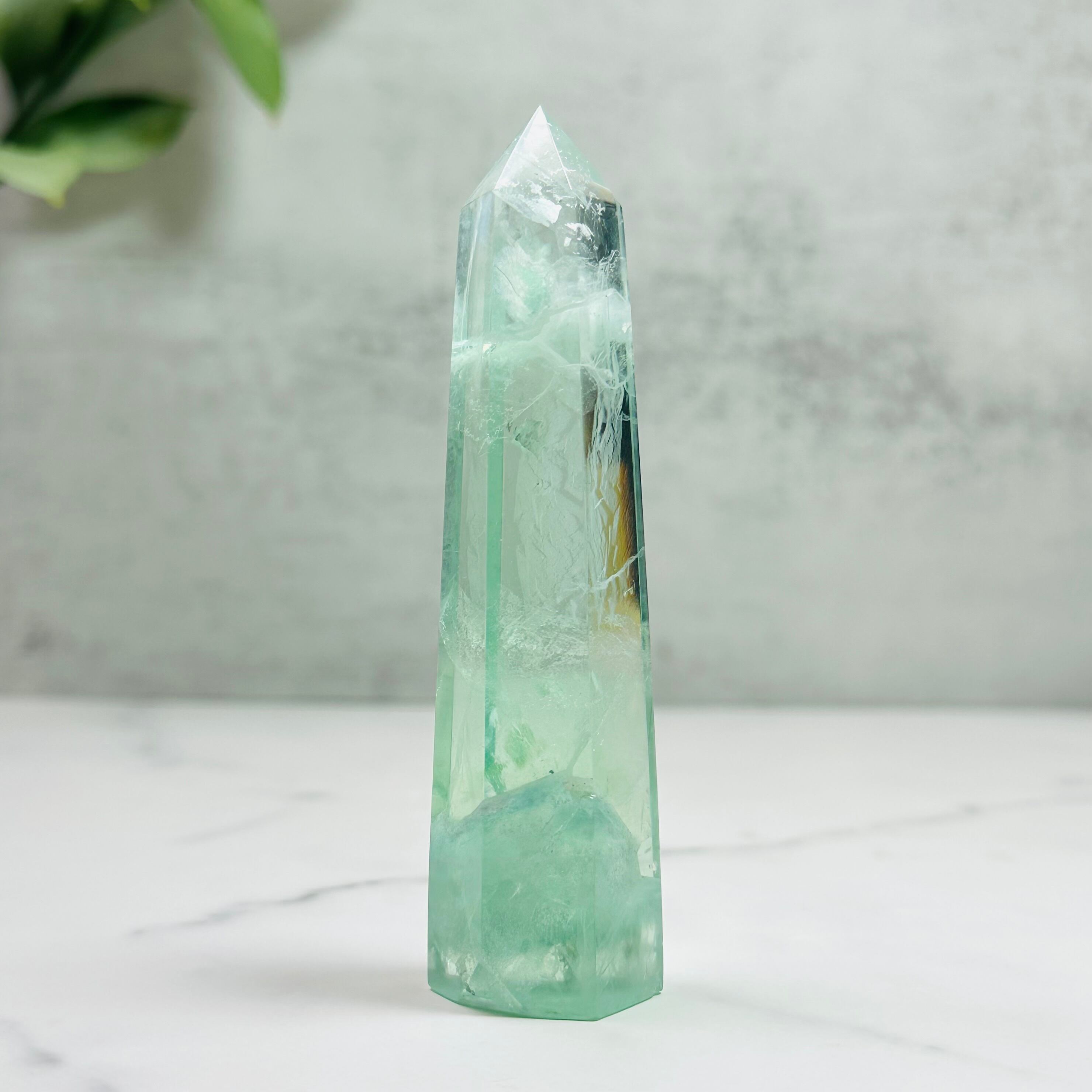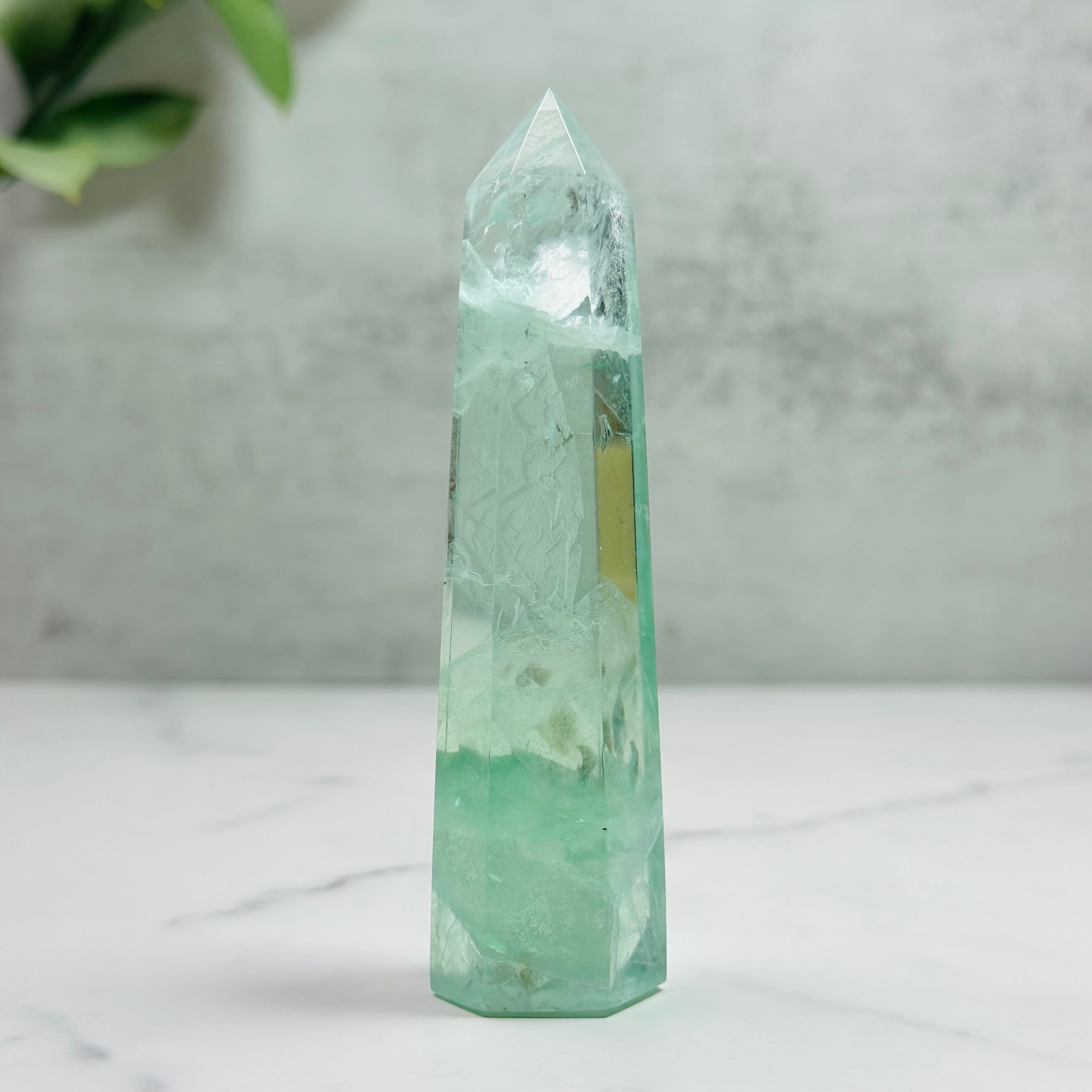 澄んだグリーンが美しいフローライトタワー。透明感のある輝きと優しい色合い、綺麗な虹が魅力で、お部屋に清らかな癒しの空間を演出します。デスクやリビング、玄関に飾れば、穏やかな気持ちで過ごせる特別なひとときをもたらしてくれます。インテリアやギフトとしてもおすすめの天然石アイテムです。