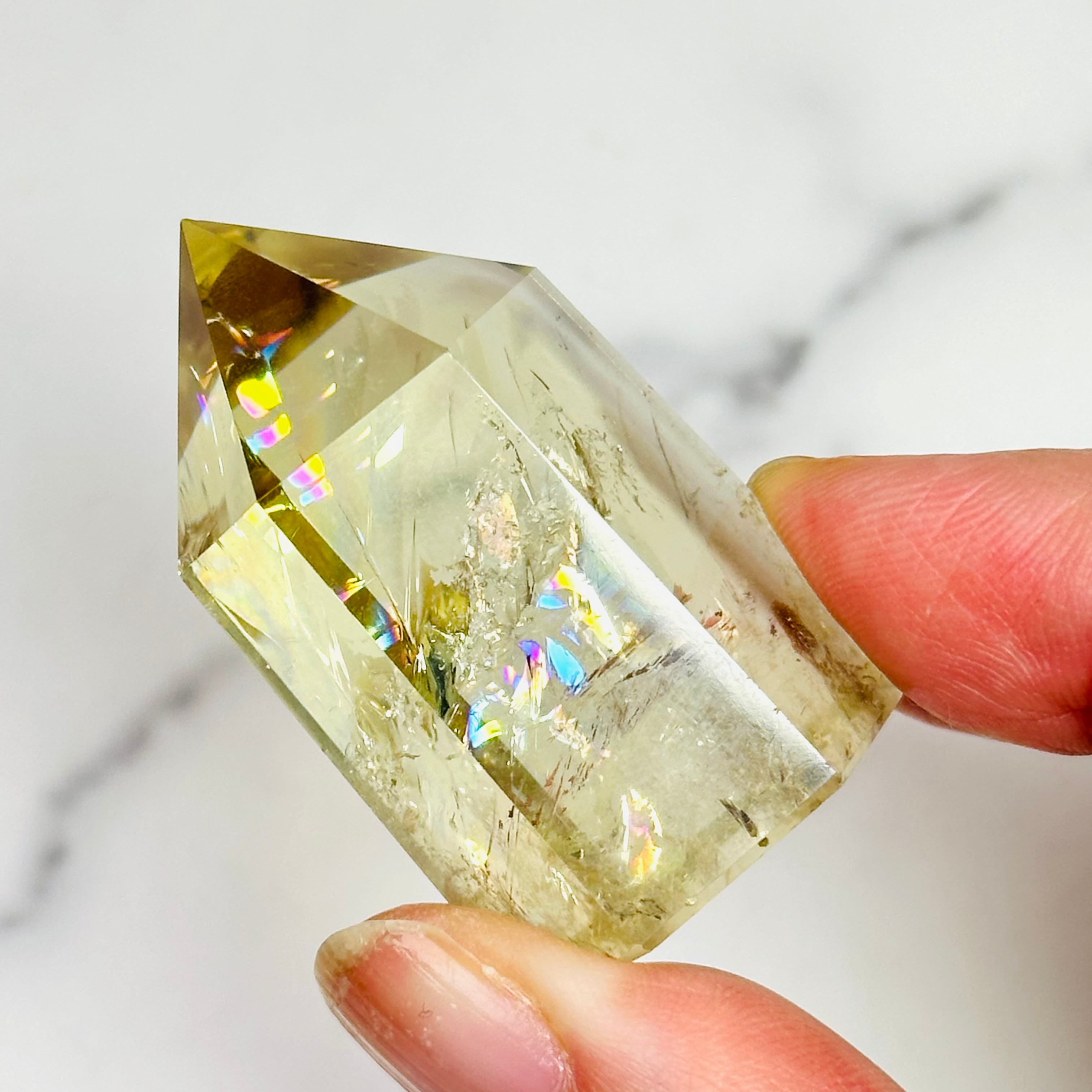 黄金色の輝きが美しいシトリンタワー。透明感のあるイエローが光を受けてやわらかくきらめき、飾るだけでお部屋を明るくポジティブな雰囲気にしてくれます。リビングや玄関、デスクに置くと華やかなアクセントになり、開運アイテムとしても人気の高い天然石です。