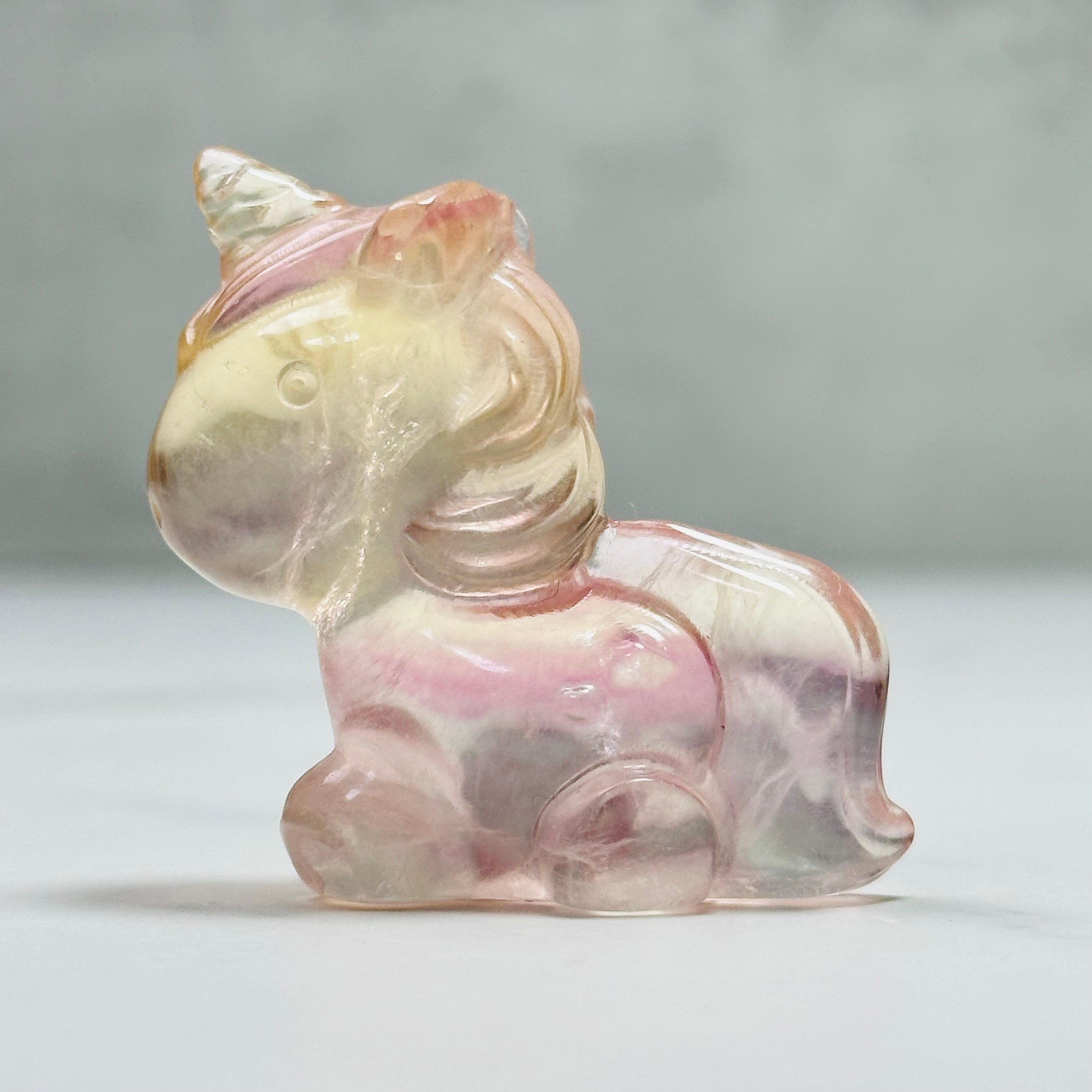 綺麗な色合いが魅力のキャンディフローライトのベイビーユニコーン。透き通るような光と丸みのある優しいフォルムが、お部屋に可愛い癒しの雰囲気をプラスします。片方の腰には小さな星があしらわれています。デスクや棚に飾れば、空間を華やかに彩り、見ているだけで心がほぐれるアイテムです。