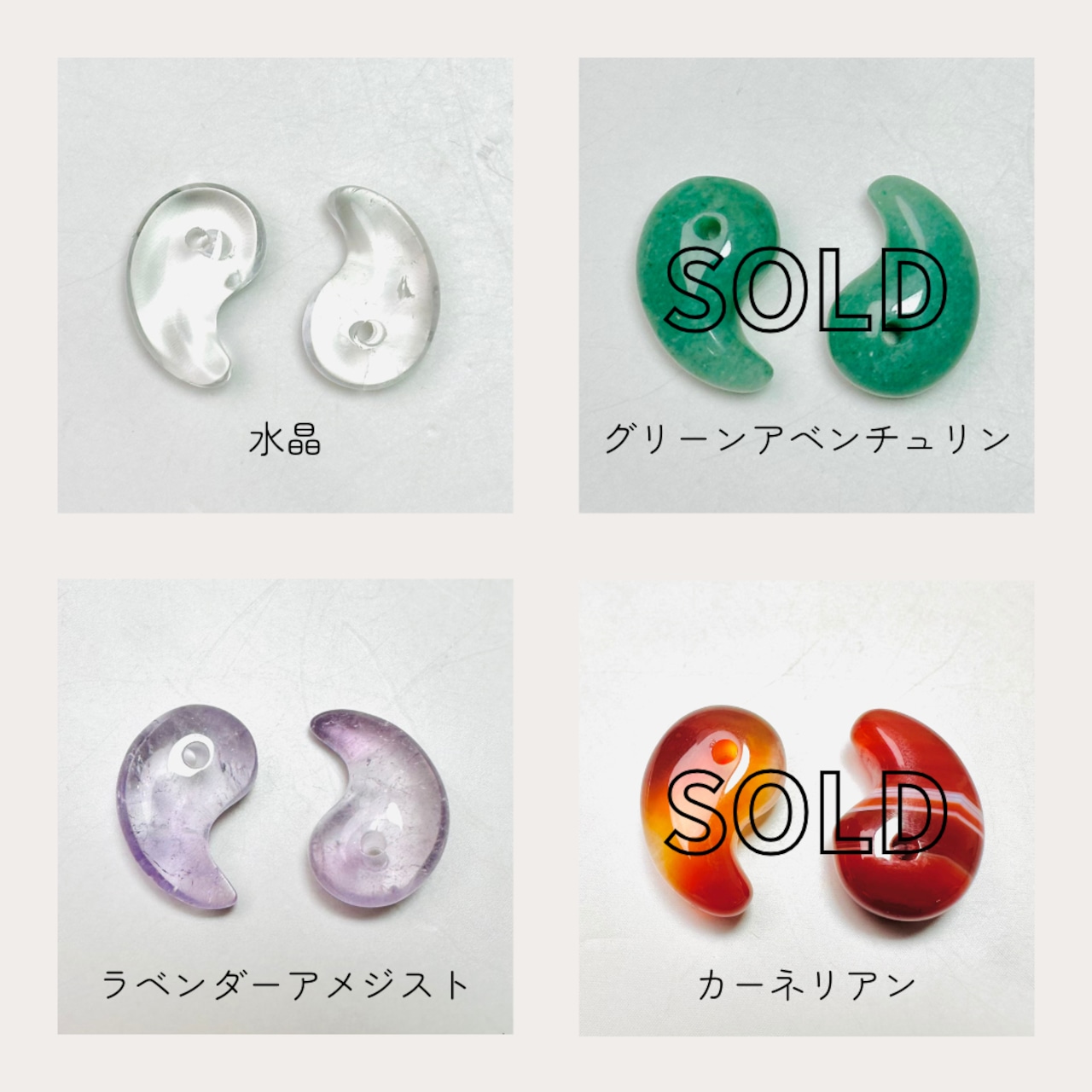 色とりどりの天然石でつくられた勾玉コレクション。ローズクォーツやアメジスト、アベンチュリンなど、個性豊かな石たちがそろいました。どの勾玉も、手のひらに馴染む丸みのあるフォルムで、身につける人の心をやさしく包み込みます。お気に入りの石を選んで、自分だけの癒しのお守りを見つけてください。