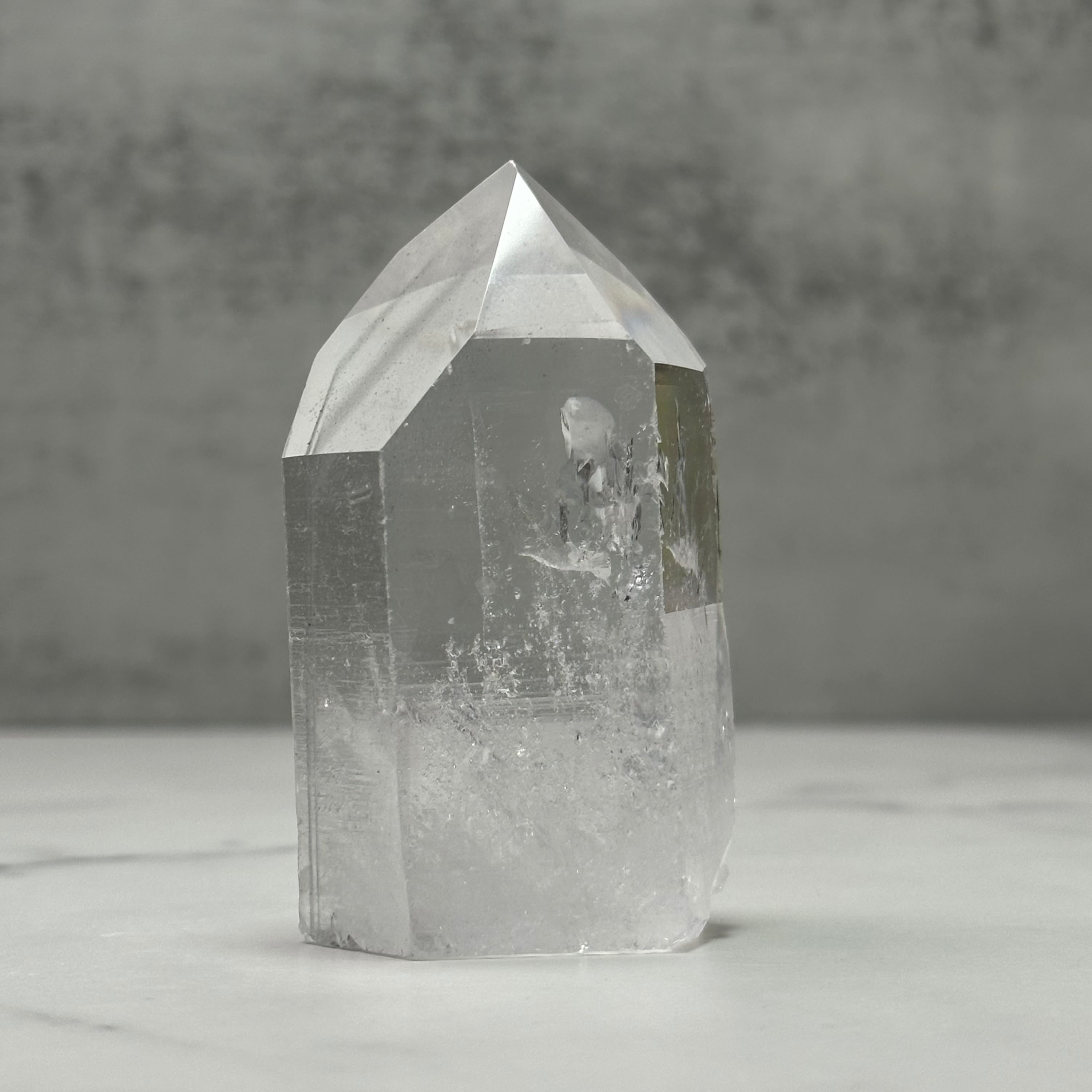透明な水晶の中に、黒い影のような層が浮かび上がるブラックファントムクォーツタワー。奥行きのある模様がまるで小さな世界を閉じ込めたようで、煌めく虹を内包したその姿は、眺めるほどに引き込まれる美しさがあります。タワー形状はインテリアとしても存在感があり、デスクや棚に置くだけでスタイリッシュな雰囲気を演出。モノトーンのカラーが大人っぽく、お部屋を引き締めるアクセントにもぴったりです。