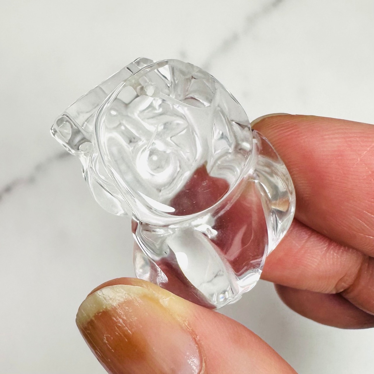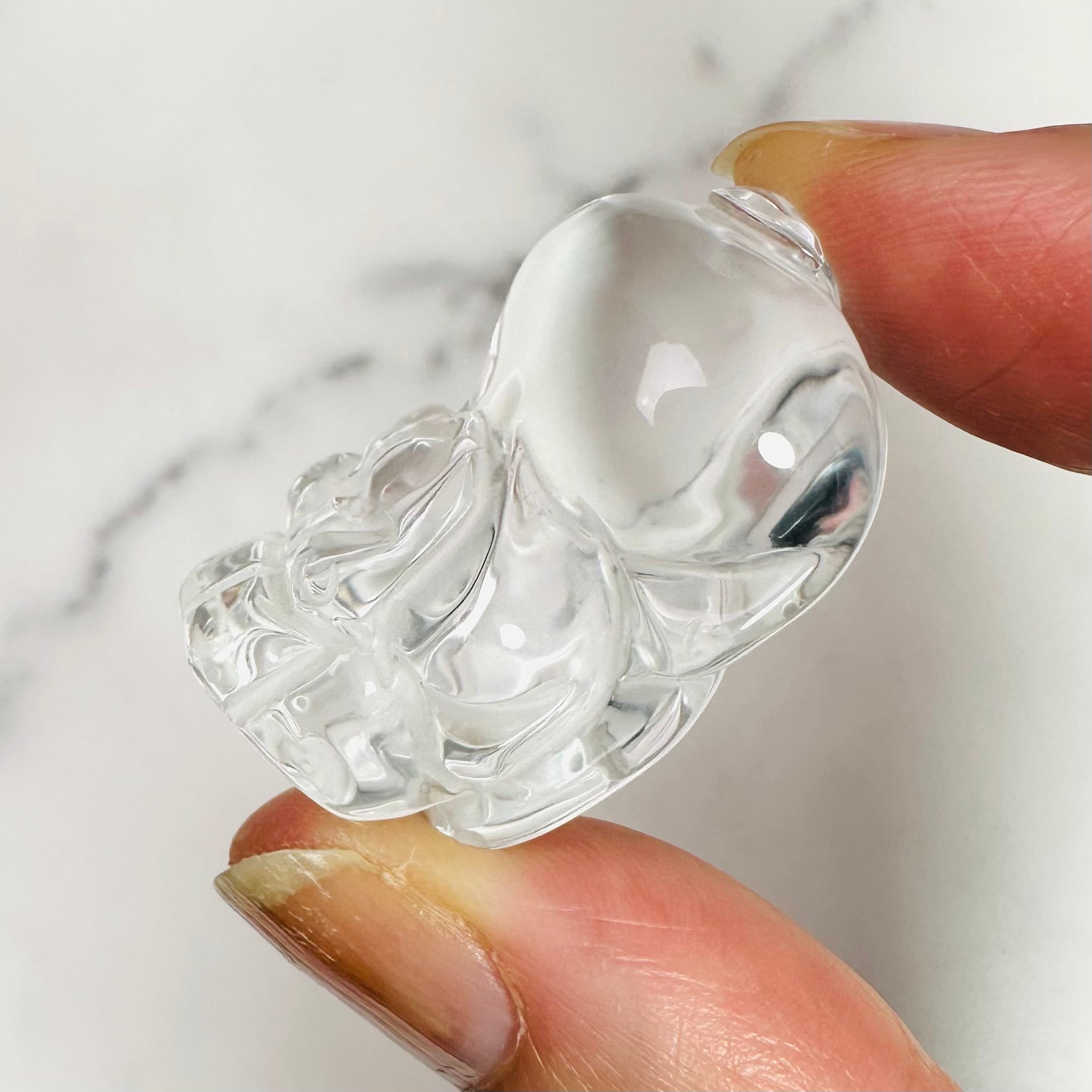 透明感あふれるクリアクォーツの貔貅さん。澄んだ清らかな輝きです。手のひらに収まる小さめサイズで、デスクや玄関などのちょっとしたスペースにも飾りやすいアイテムです。