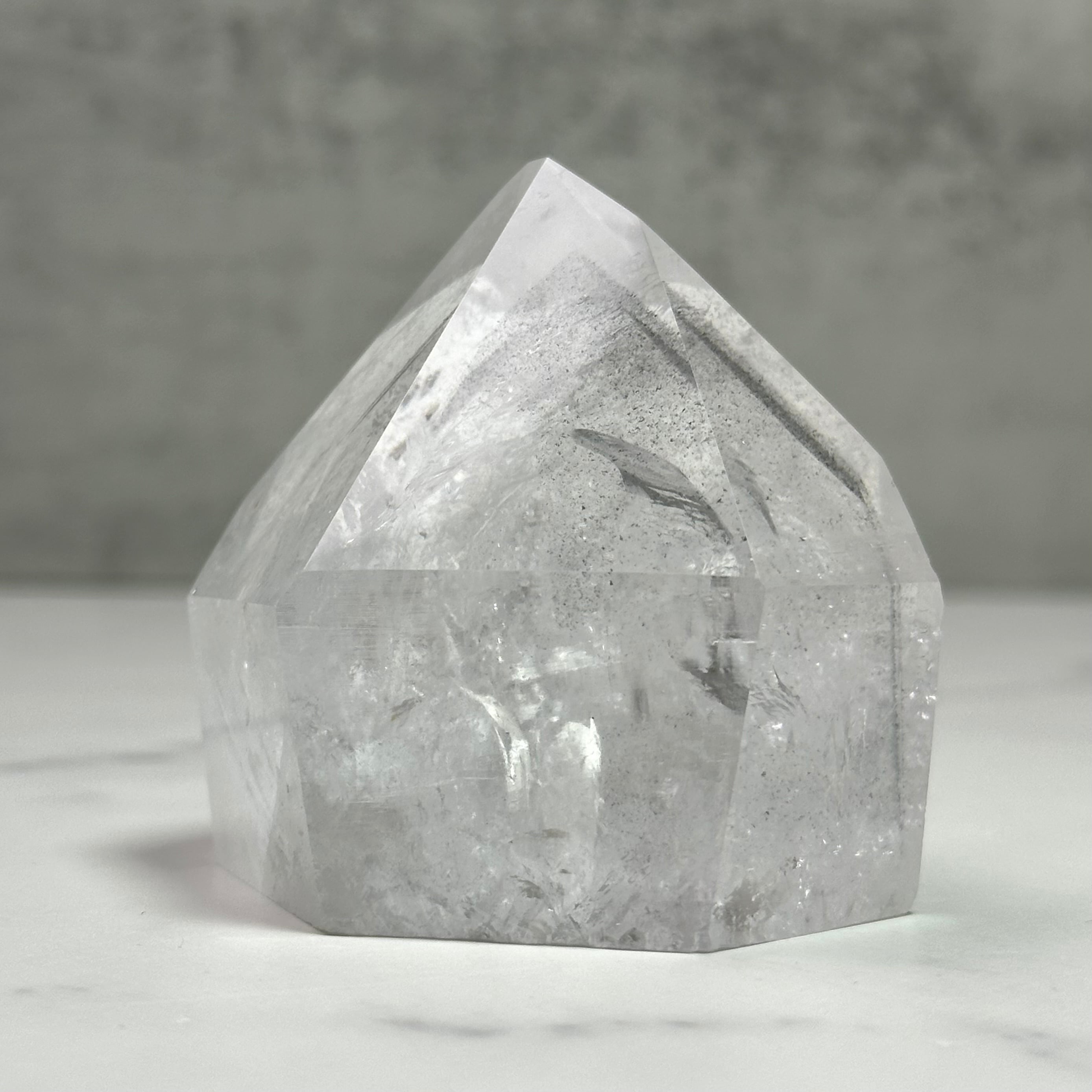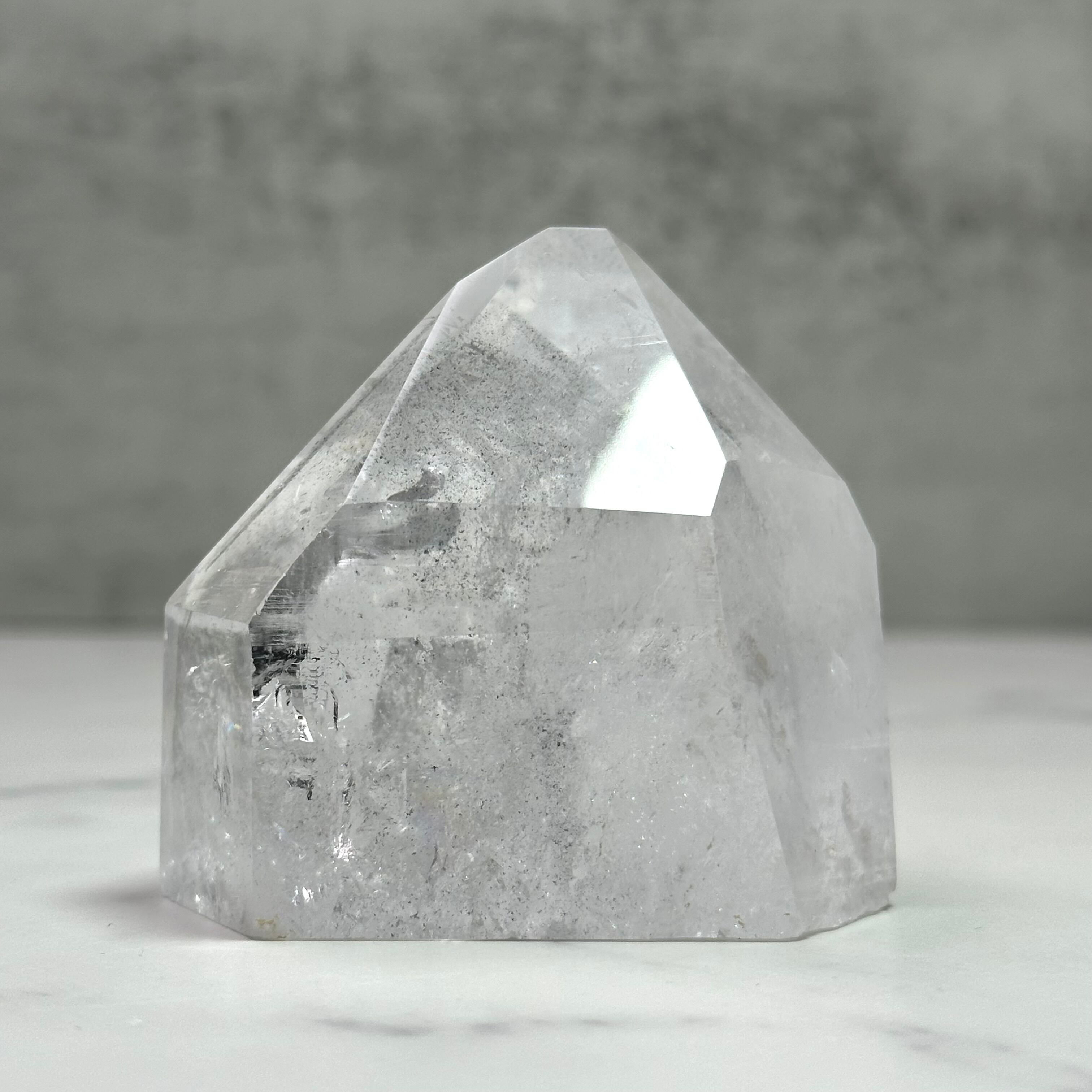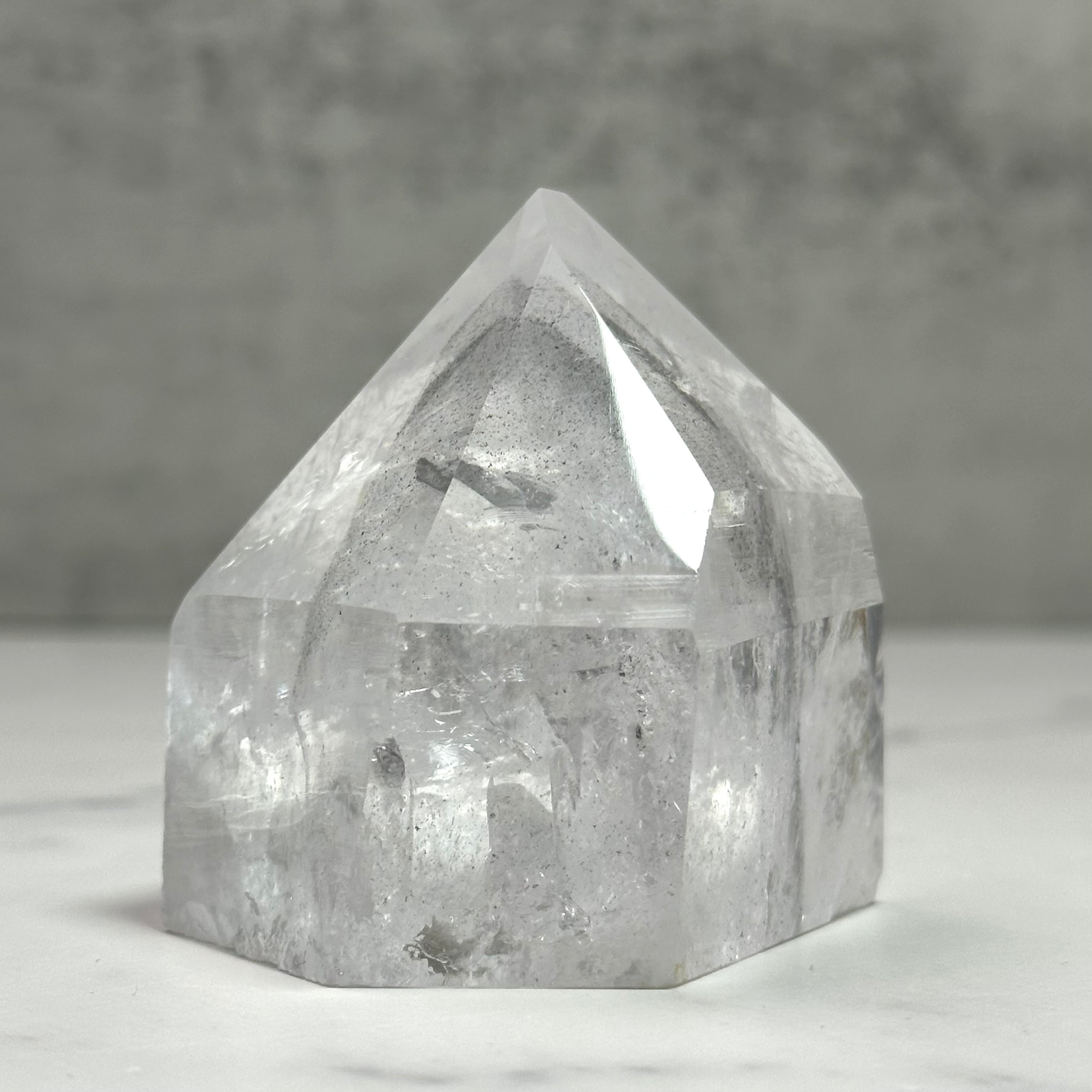 透明な水晶の中に、黒い影のような層が浮かび上がるブラックファントムクォーツタワー。奥行きのある模様がまるで小さな世界を閉じ込めたようで、煌めく虹を内包したその姿は、眺めるほどに引き込まれる美しさがあります。安定感のあるタワー型でインテリアとしてしっかりとした存在感があります。