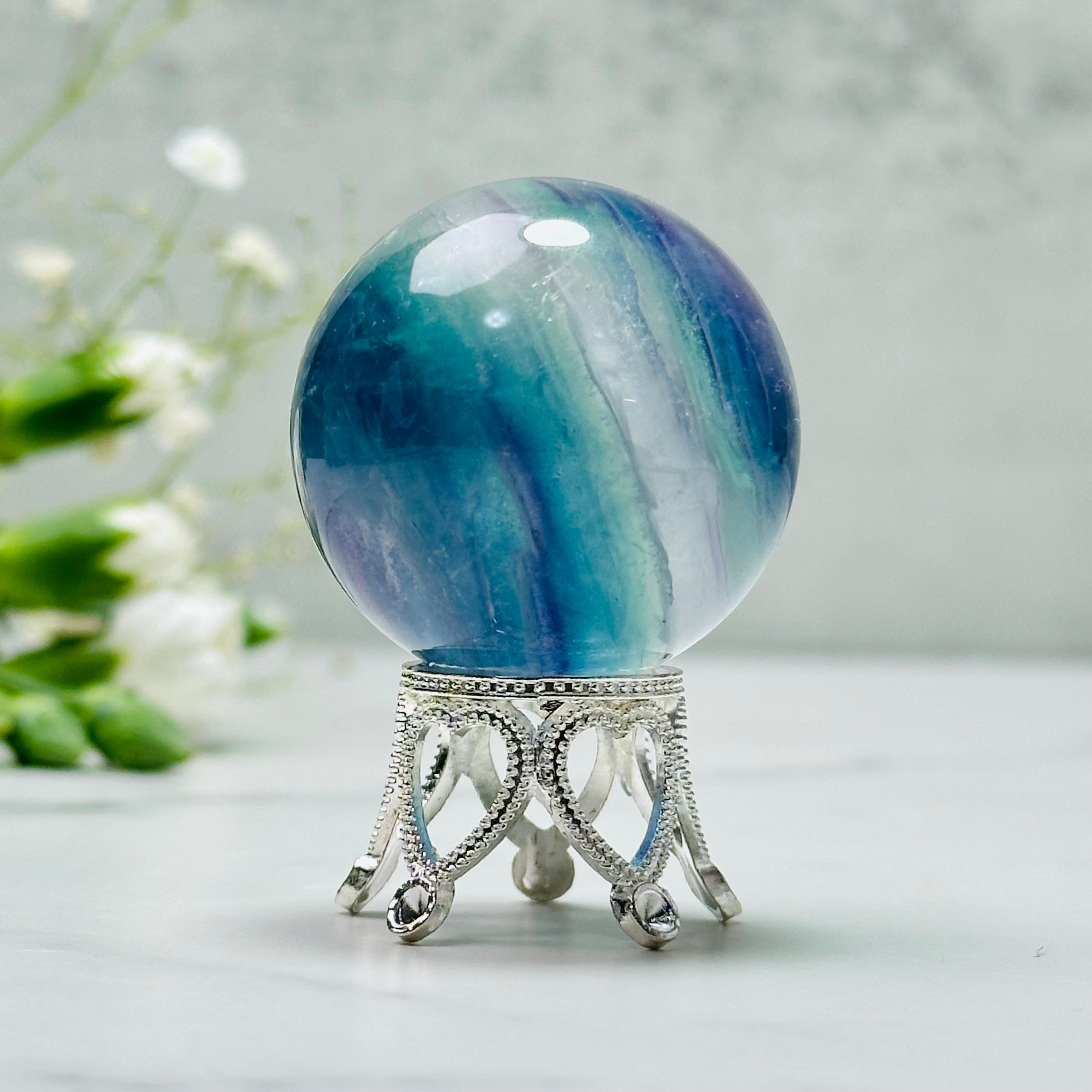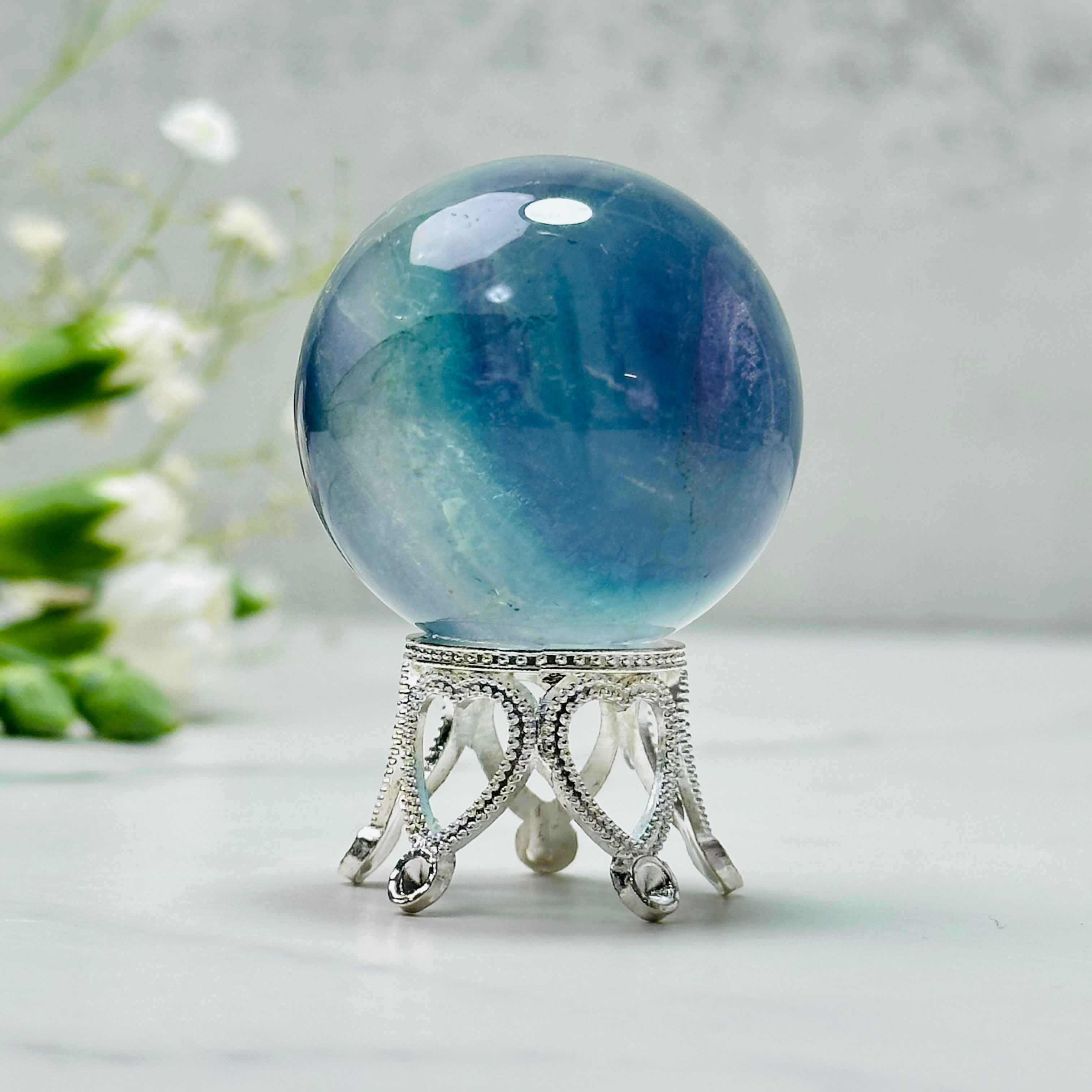 神秘的な色合いが美しいブルーフローライトのスフィア。光の角度や背景によって色の濃淡や輝きが変わり、手に取るたびに違った表情を見せてくれます。飽きずにずっと眺めていられるアイテムです。