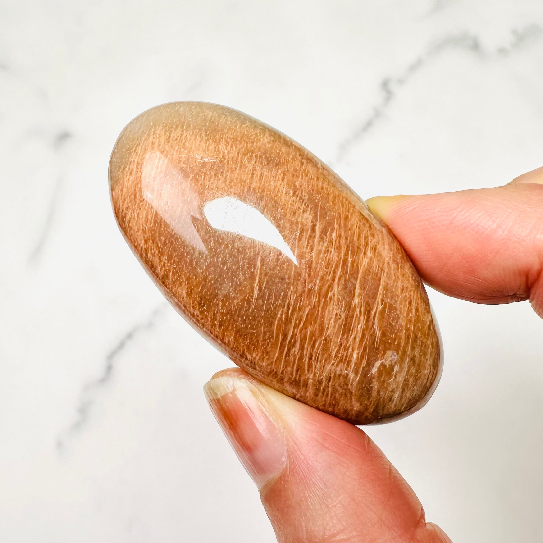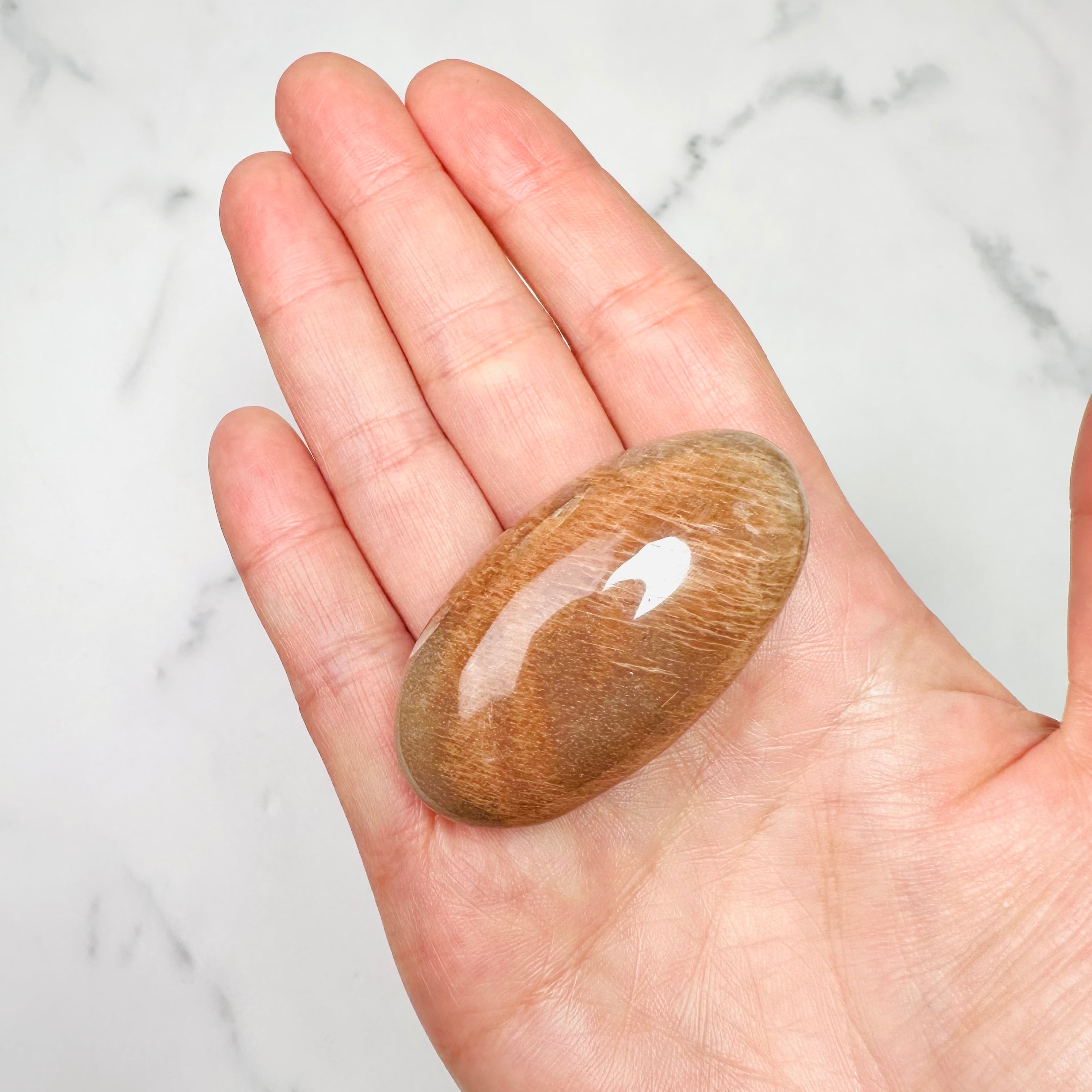 優しい色合いのオレンジムーンストーンです。側面にシラーが白くキラキラと輝きます。心地よい触り心地で手のひらによく馴染みます。