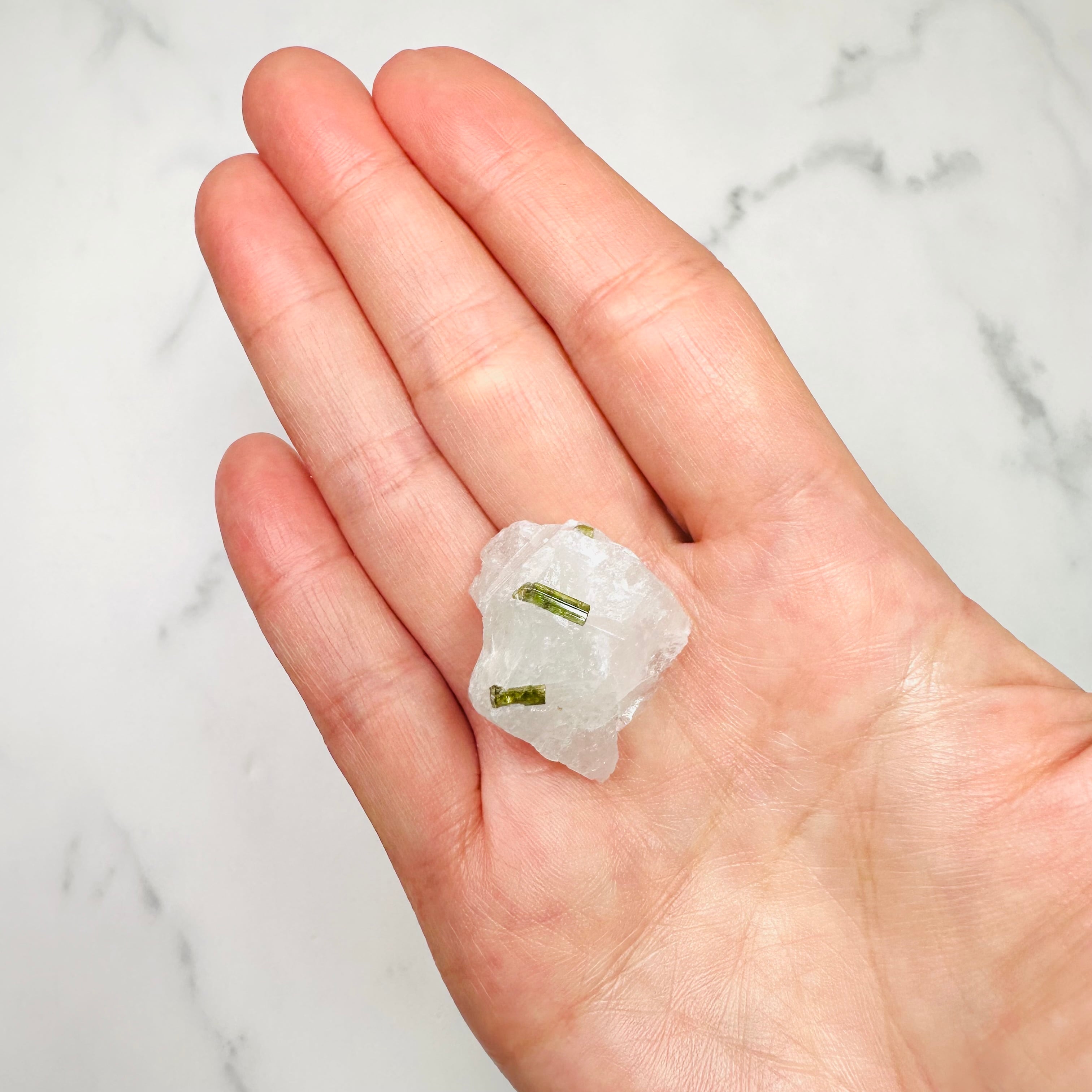 透明感あるグリーンが綺麗なグリーントルマリン。自然そのままのラフな質感が魅力で、茶柱のような姿が可愛らしいアイテムです。手のひらに収まるサイズで、デスク周りや小さな棚にそっと置くだけで、お部屋に落ち着きのある雰囲気をプラス。コレクションとしても楽しめる天然石です。