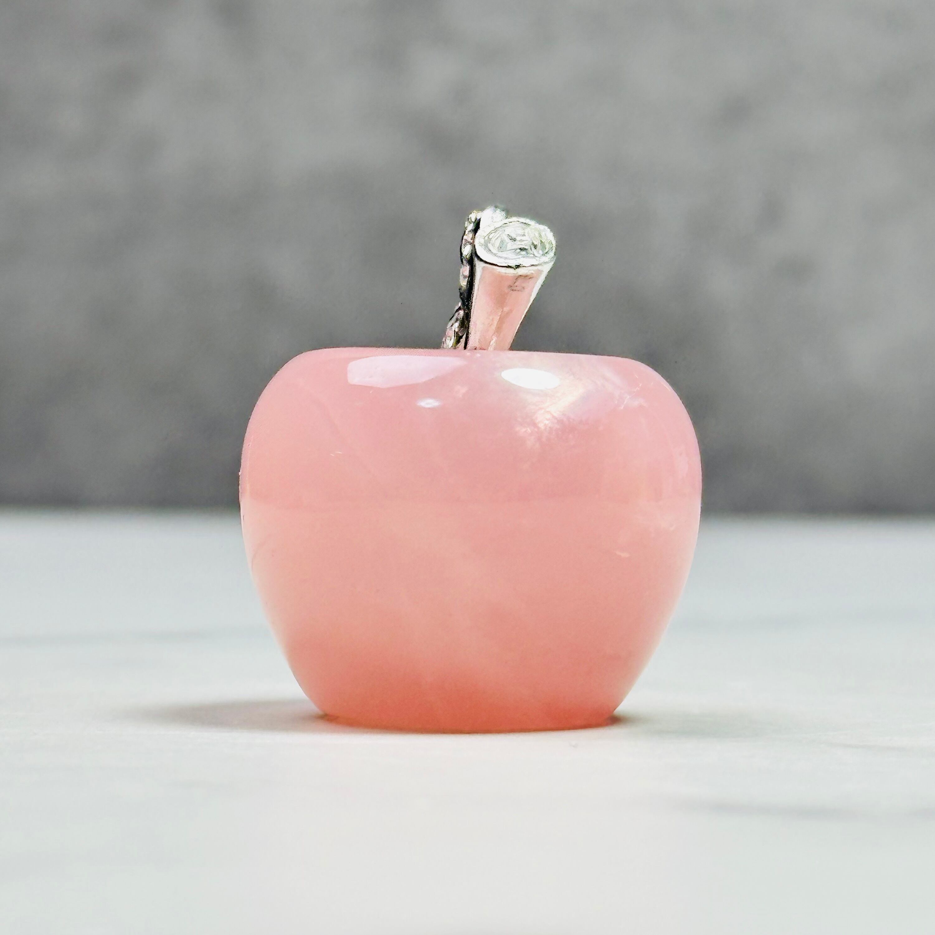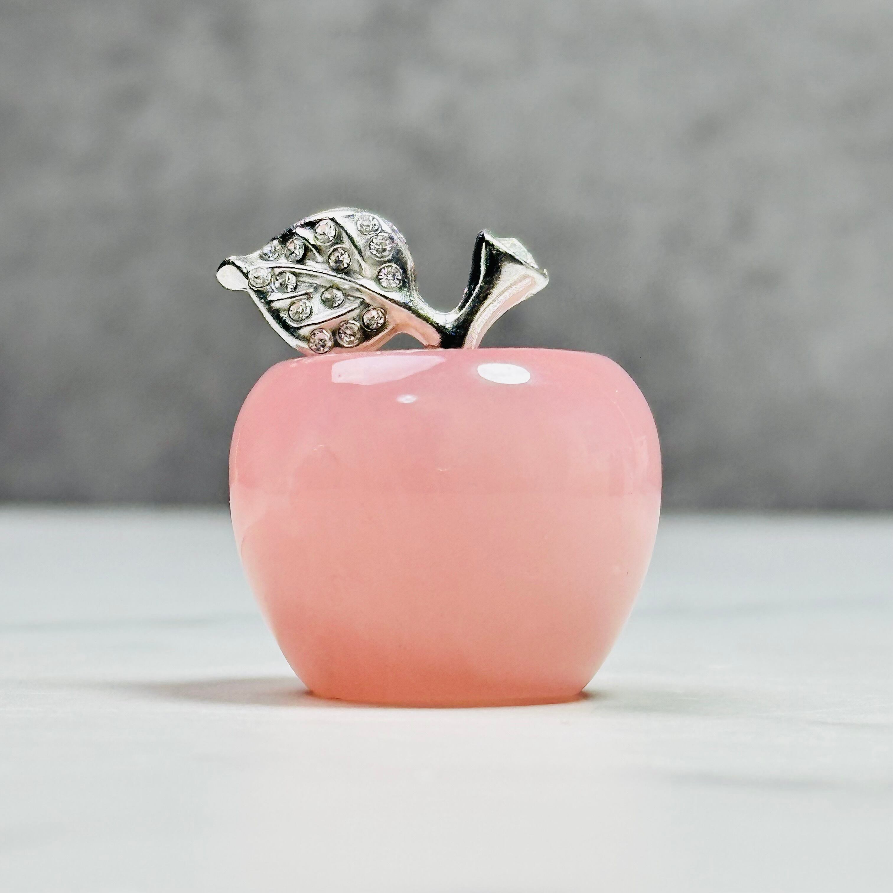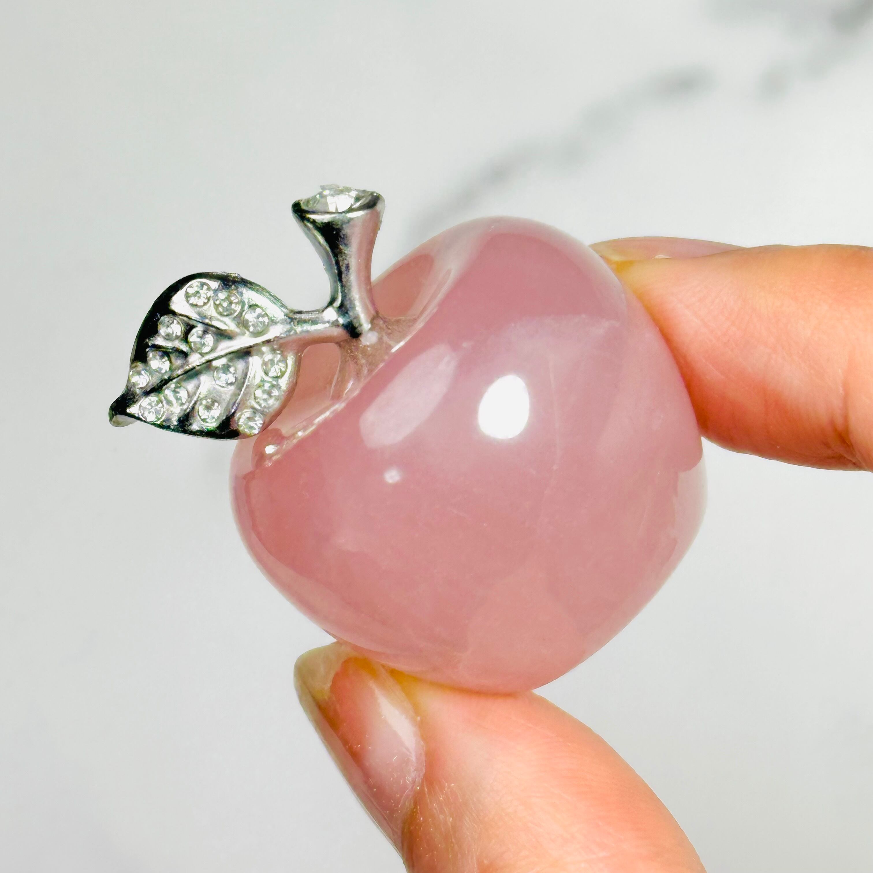 コロンとした形とピンク色が可愛いローズクォーツのりんごです。軸の先と小さな葉っぱにはラインストーンが付いています。インテリアとしてキッチンや寝室に飾る他、プレゼントとしても喜ばれそうです。ローズクォーツは愛と癒しの象徴とされ、心を穏やかに落ち着かせる効果があります。