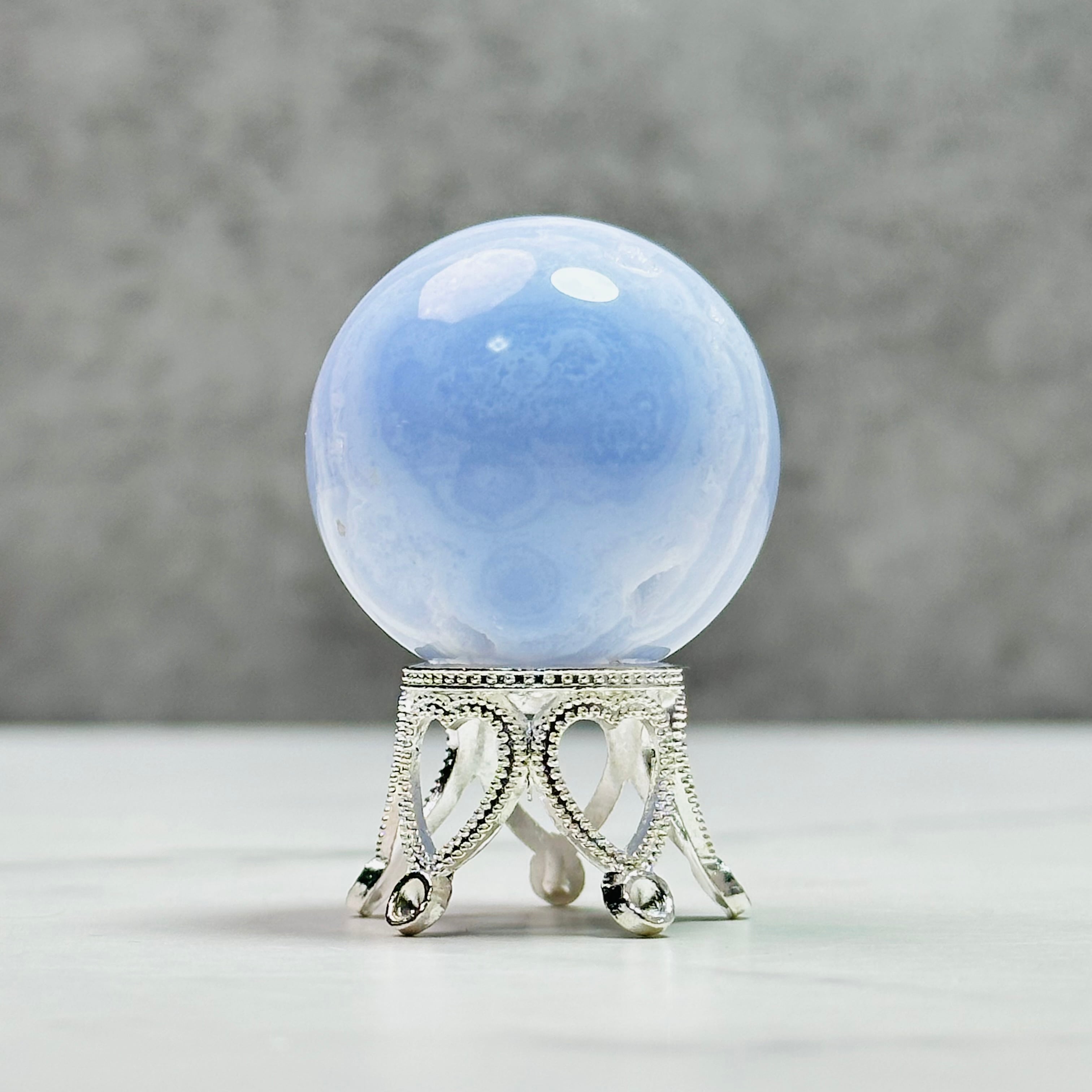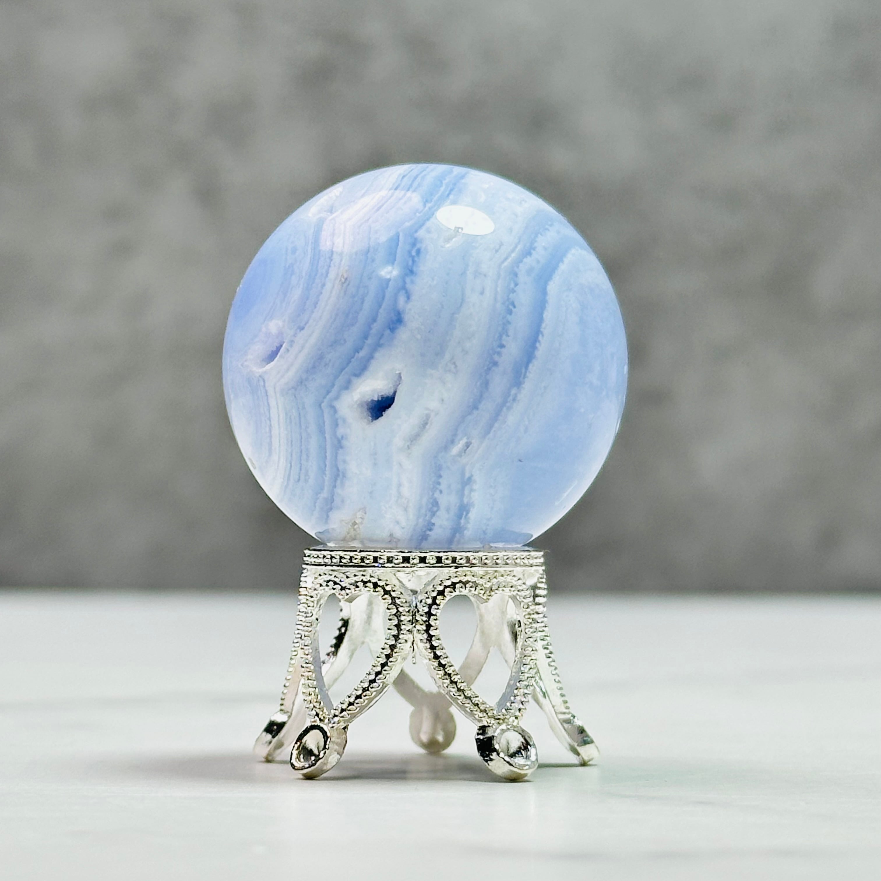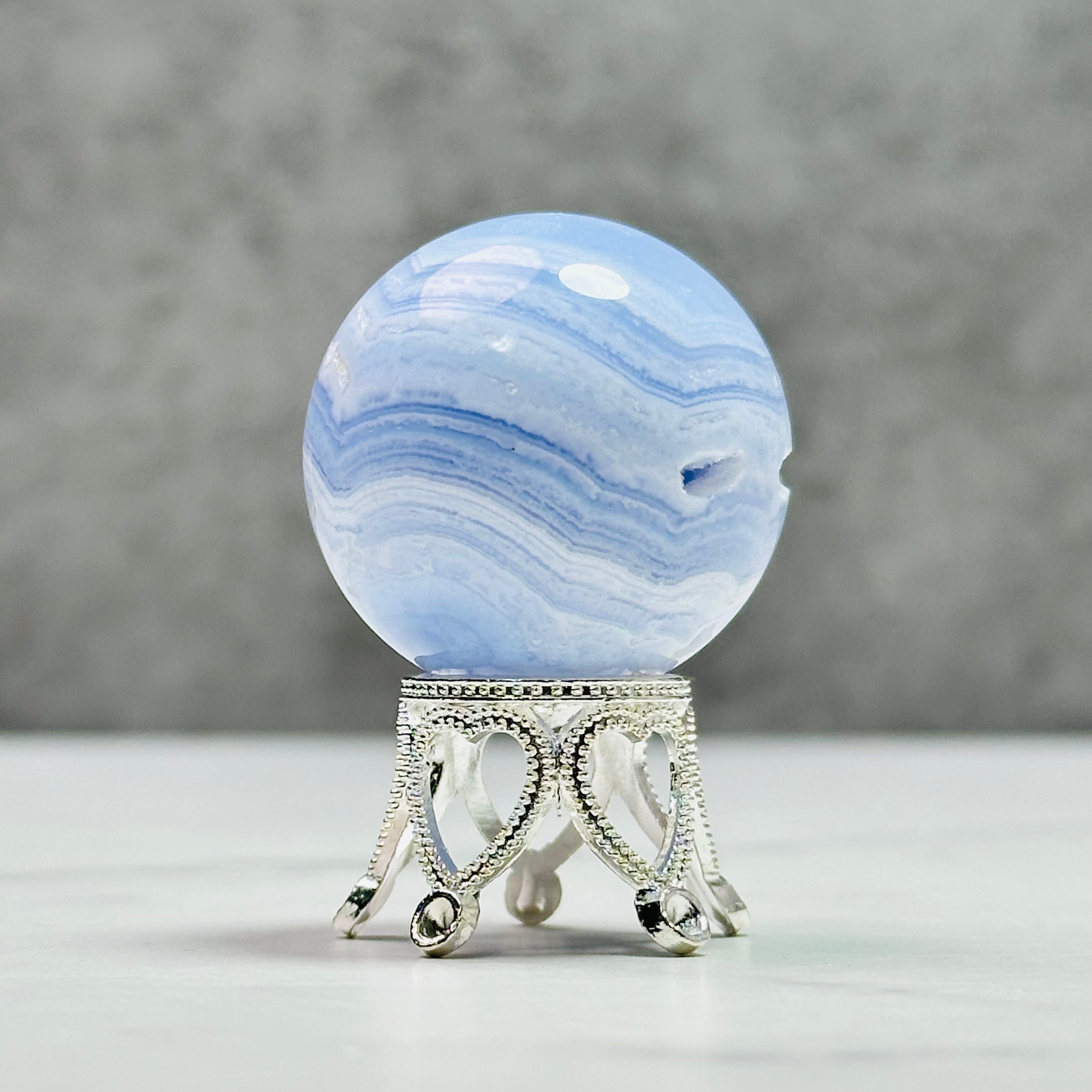 優しい癒しのサックスブルーと繊細な縞模様がレースが特徴のブルーレースアゲートスフィア。トップのドゥルージーがとても綺麗に入っています。ほんのり透け感があって甘く可愛らしい印象です。小さくても高価なことでも知られ、実際に手に取ってみるとその価値がわかります。他にはない、高貴で繊細で儚い美しさは、この石だけの魅力だろうと納得するのです。