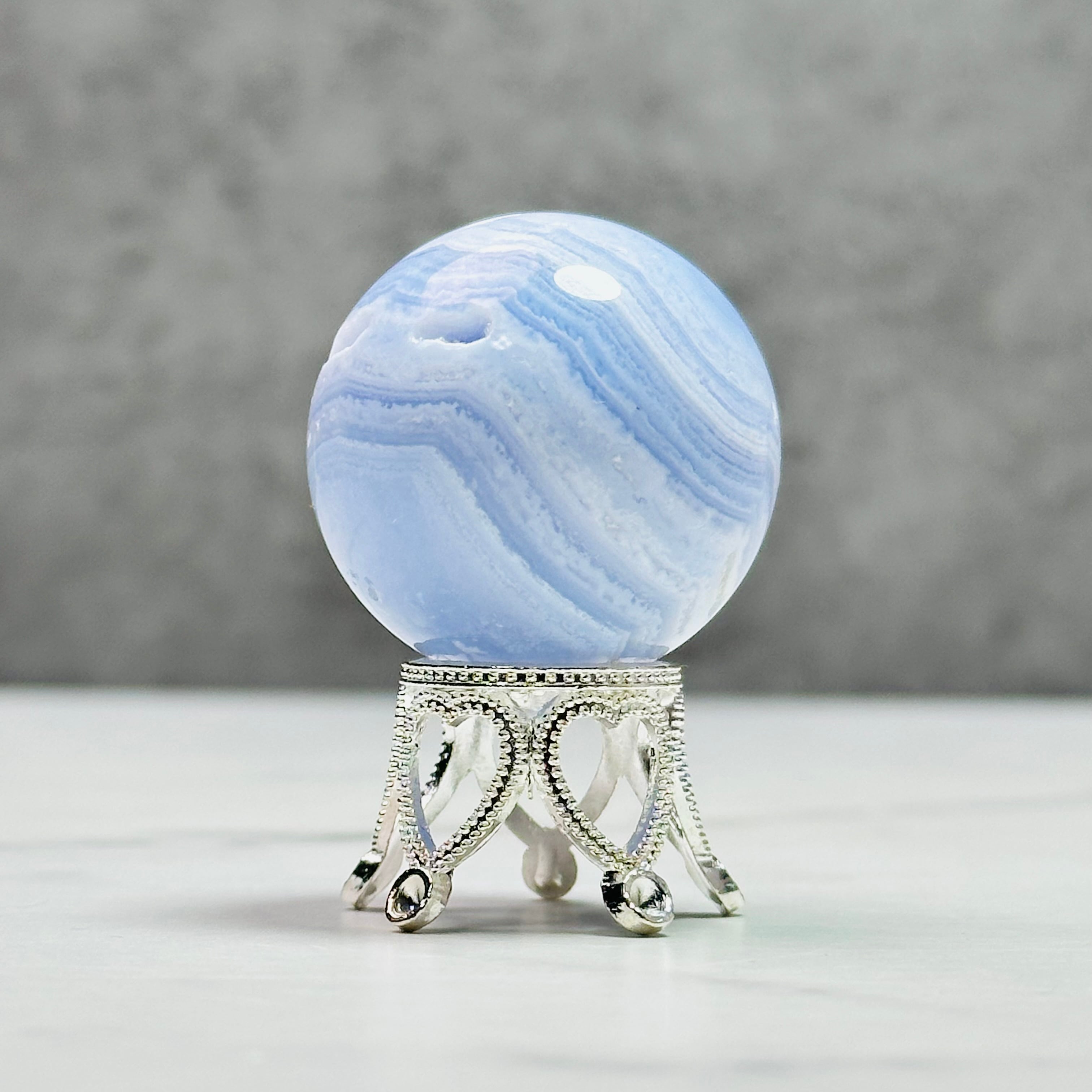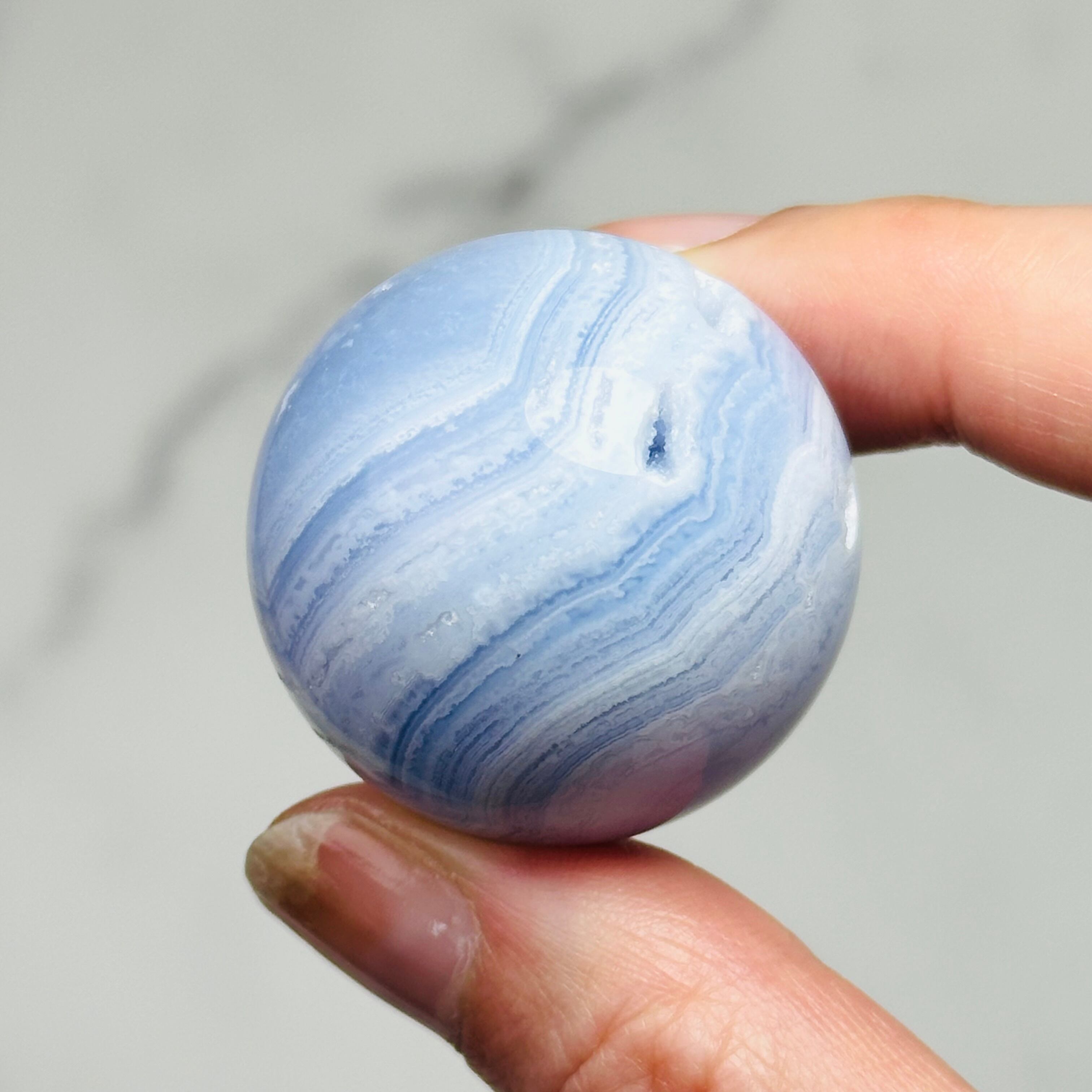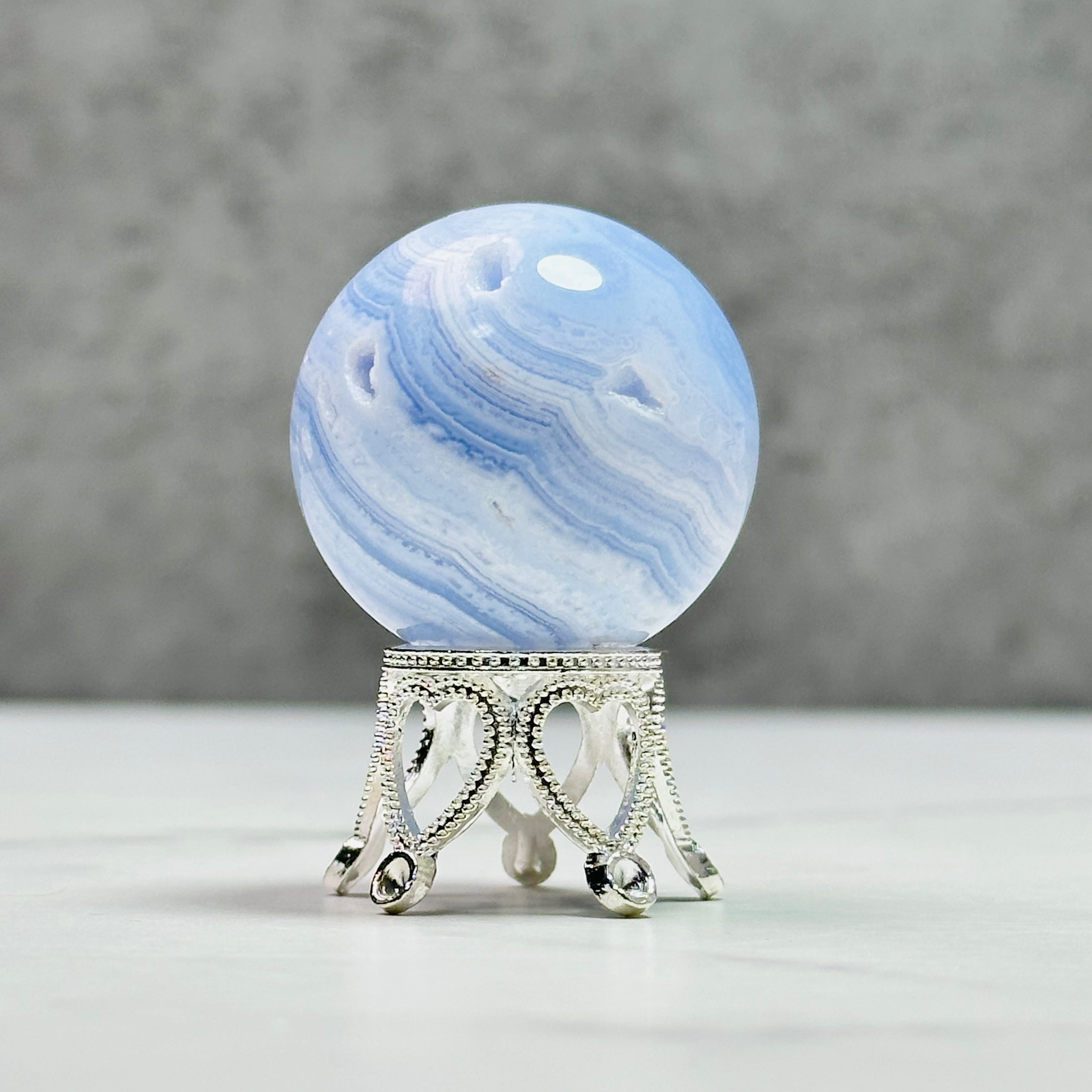 優しい癒しのサックスブルーと繊細な縞模様がレースが特徴のブルーレースアゲートスフィア。トップのドゥルージーがとても綺麗に入っています。ほんのり透け感があって甘く可愛らしい印象です。小さくても高価なことでも知られ、実際に手に取ってみるとその価値がわかります。他にはない、高貴で繊細で儚い美しさは、この石だけの魅力だろうと納得するのです。