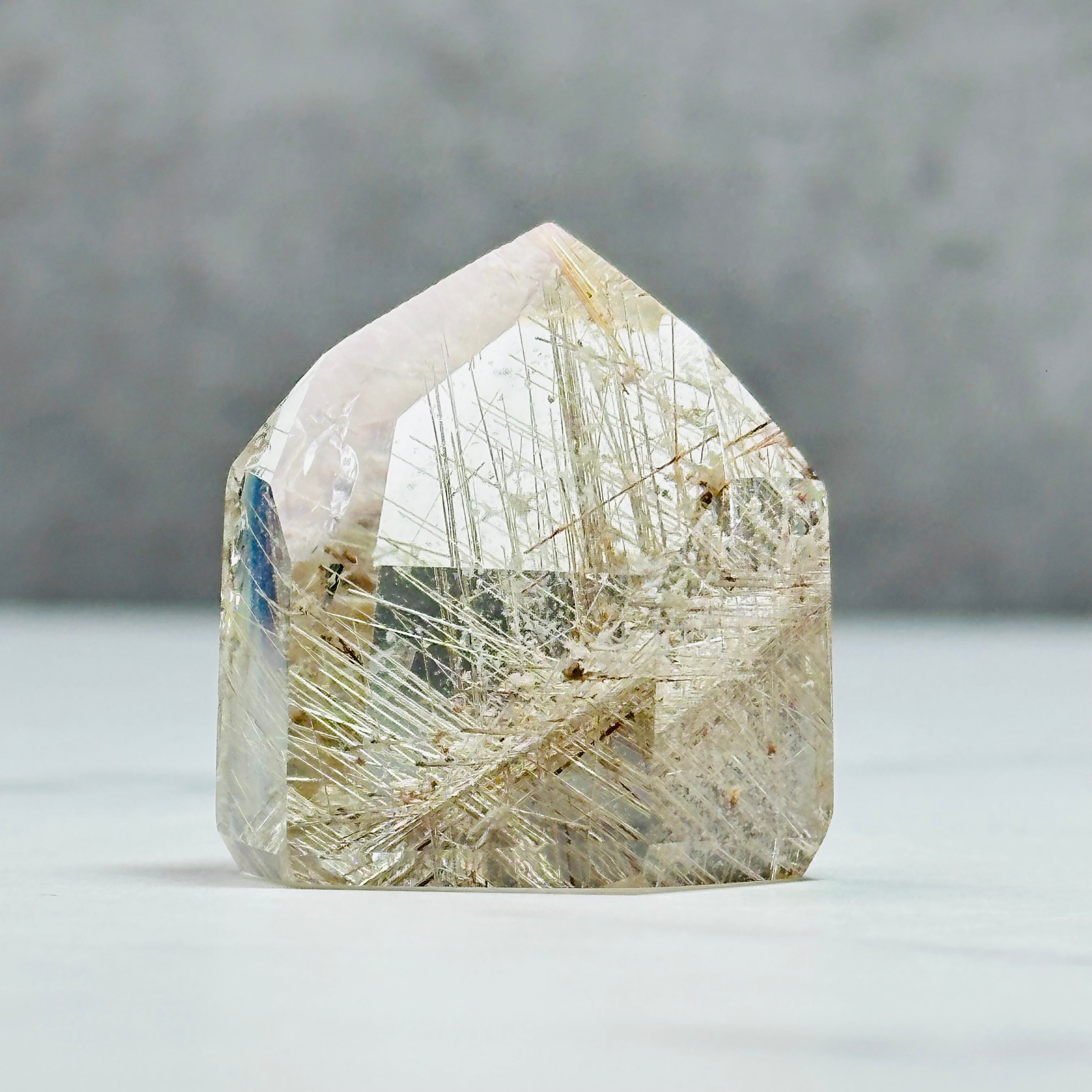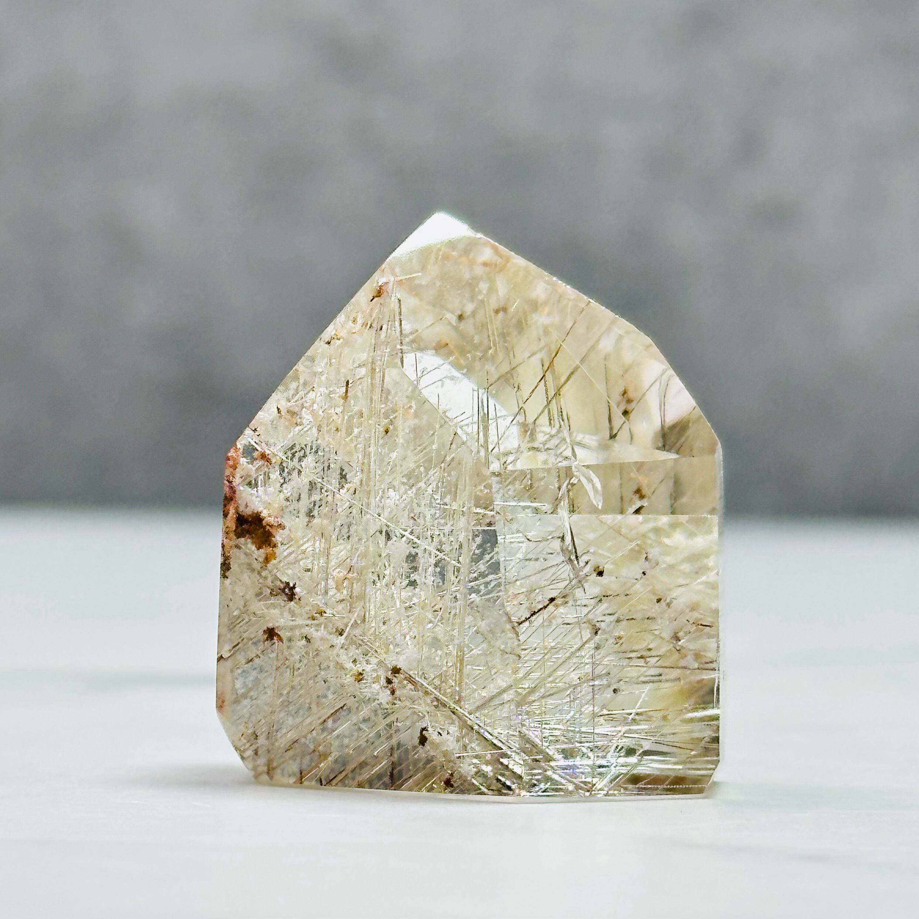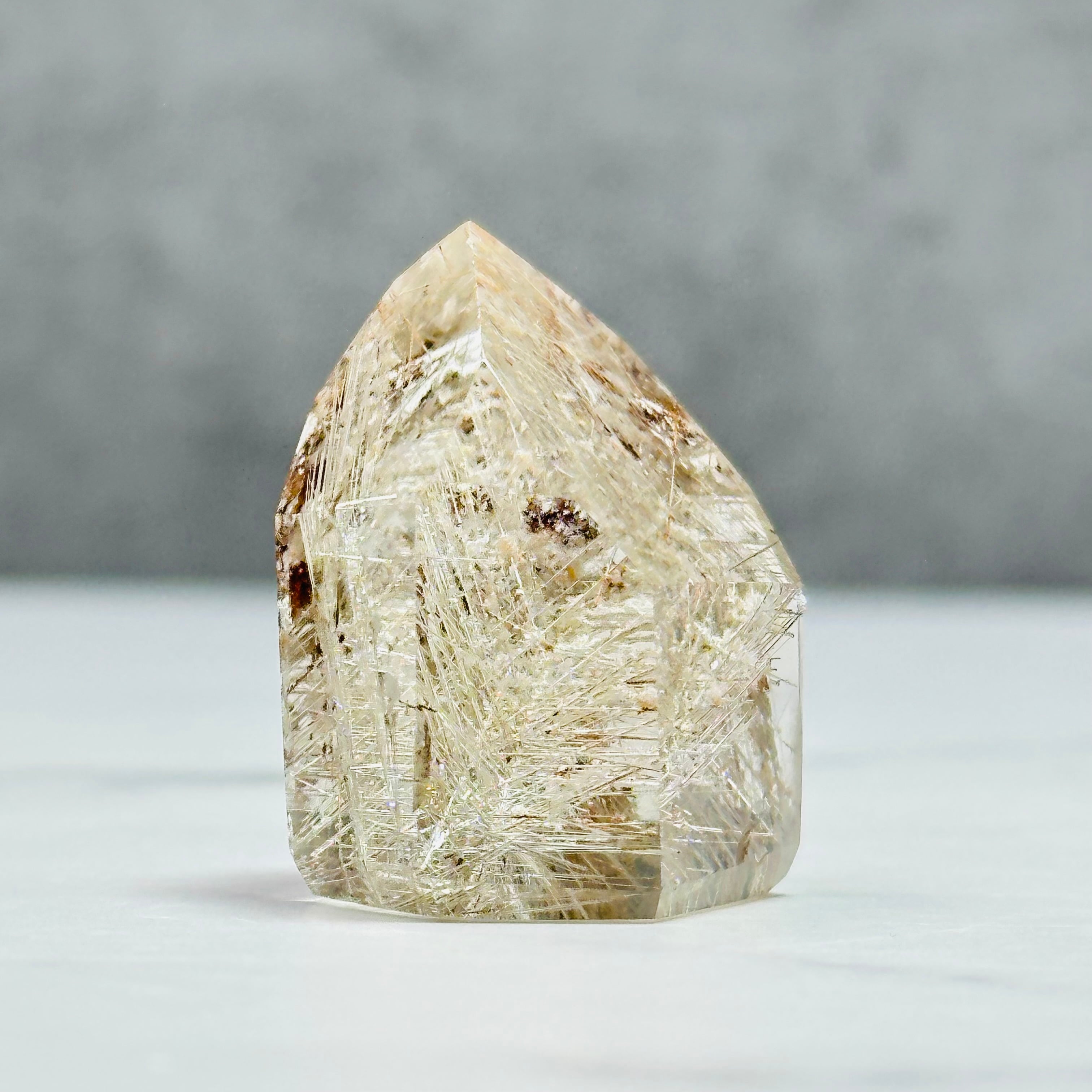 水晶の中に黄金色の針状結晶(ルチル)が閉じ込められたルチルクォーツのタワーです。凛として真っ直ぐ伸びたルチルがたっぷりと含まれています。ルチルクォーツは、直感力や洞察力を高め、自信と決断力を与えて幸運をもたらしてくれます。夢や目標に向かって頑張る方、より一層の成功を求める方にお守りとして最適です。