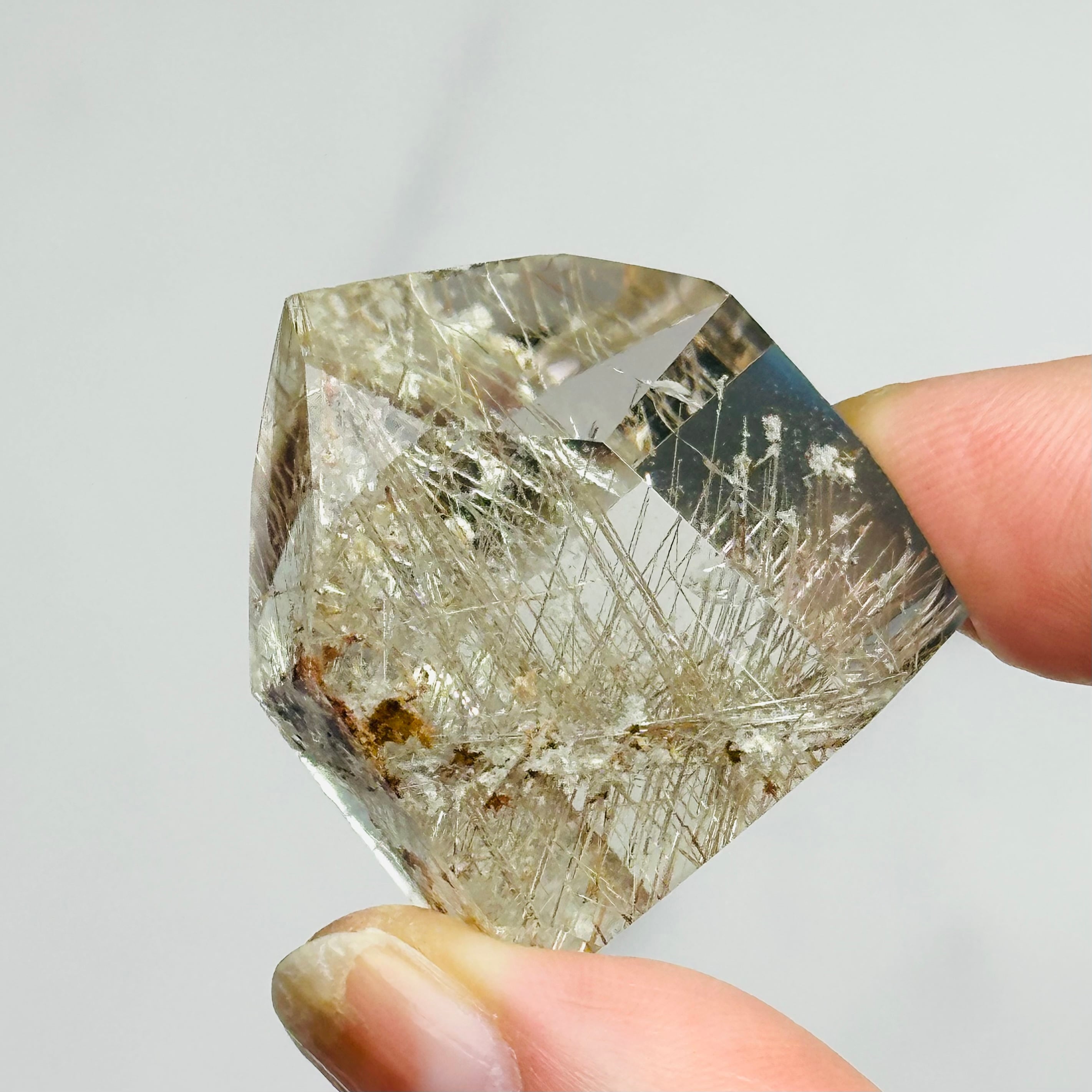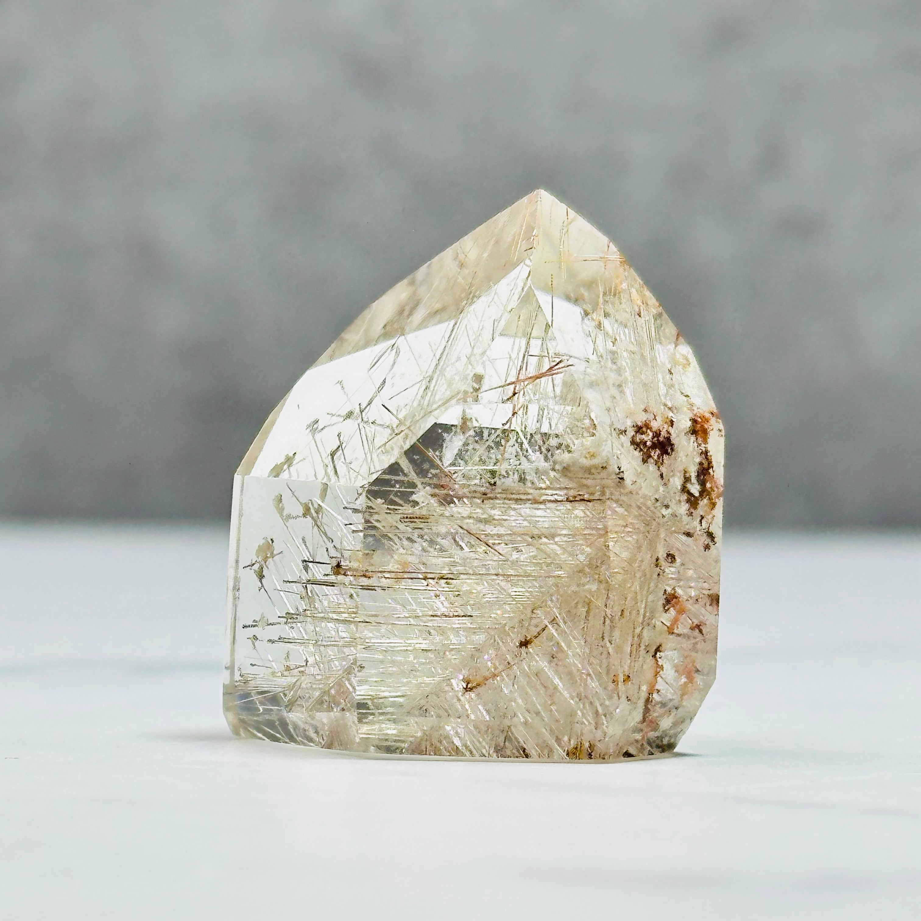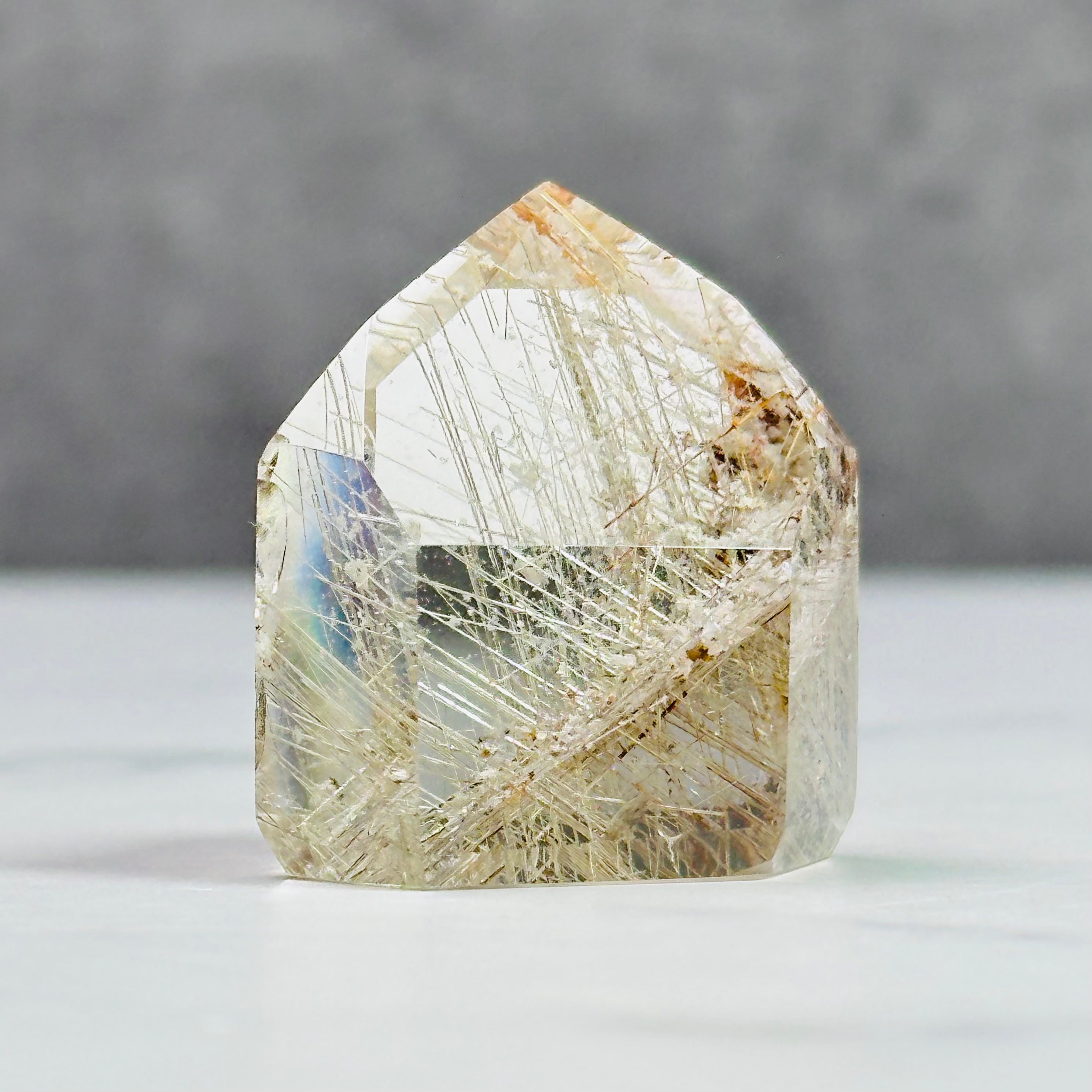 水晶の中に黄金色の針状結晶(ルチル)が閉じ込められたルチルクォーツのタワーです。凛として真っ直ぐ伸びたルチルがたっぷりと含まれています。ルチルクォーツは、直感力や洞察力を高め、自信と決断力を与えて幸運をもたらしてくれます。夢や目標に向かって頑張る方、より一層の成功を求める方にお守りとして最適です。