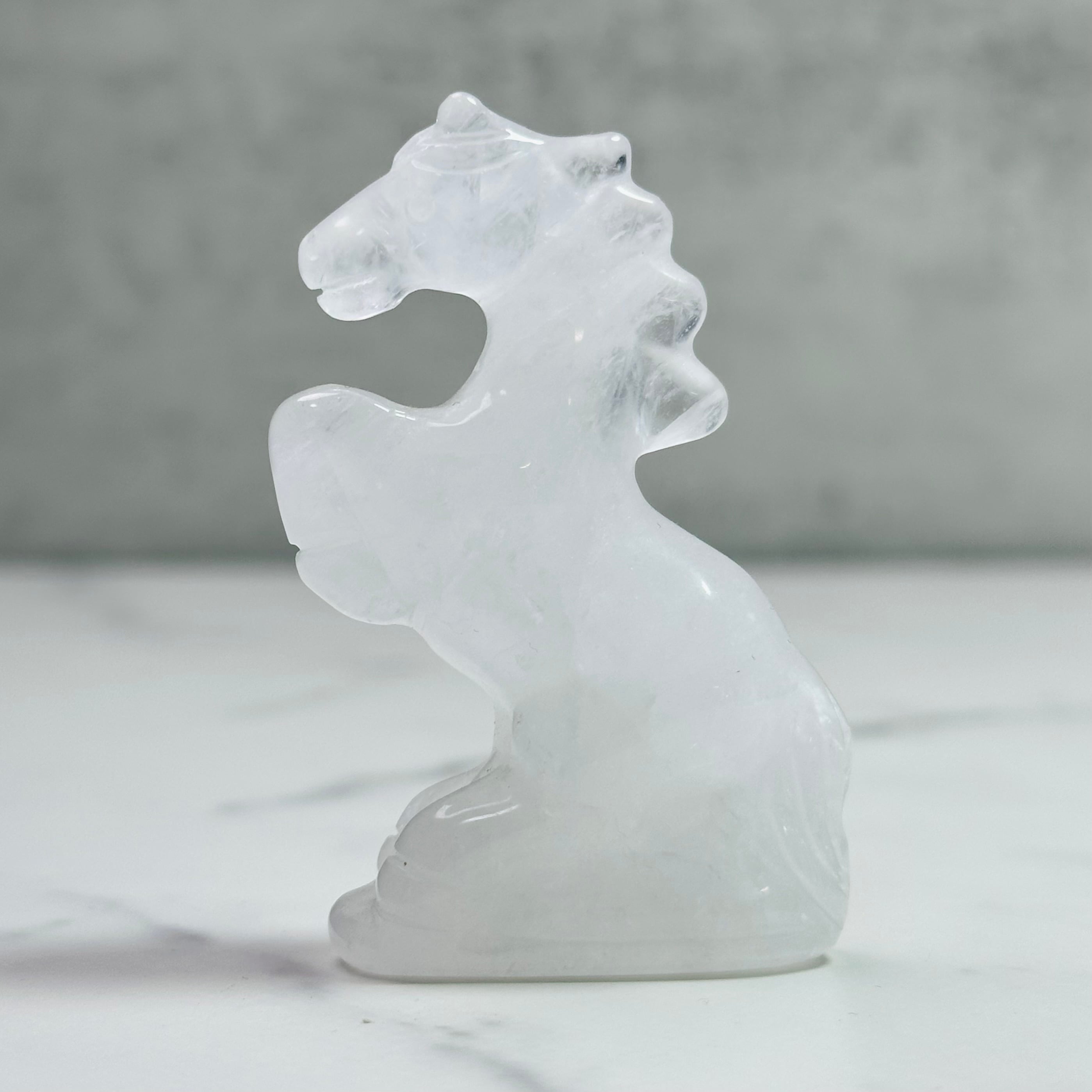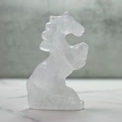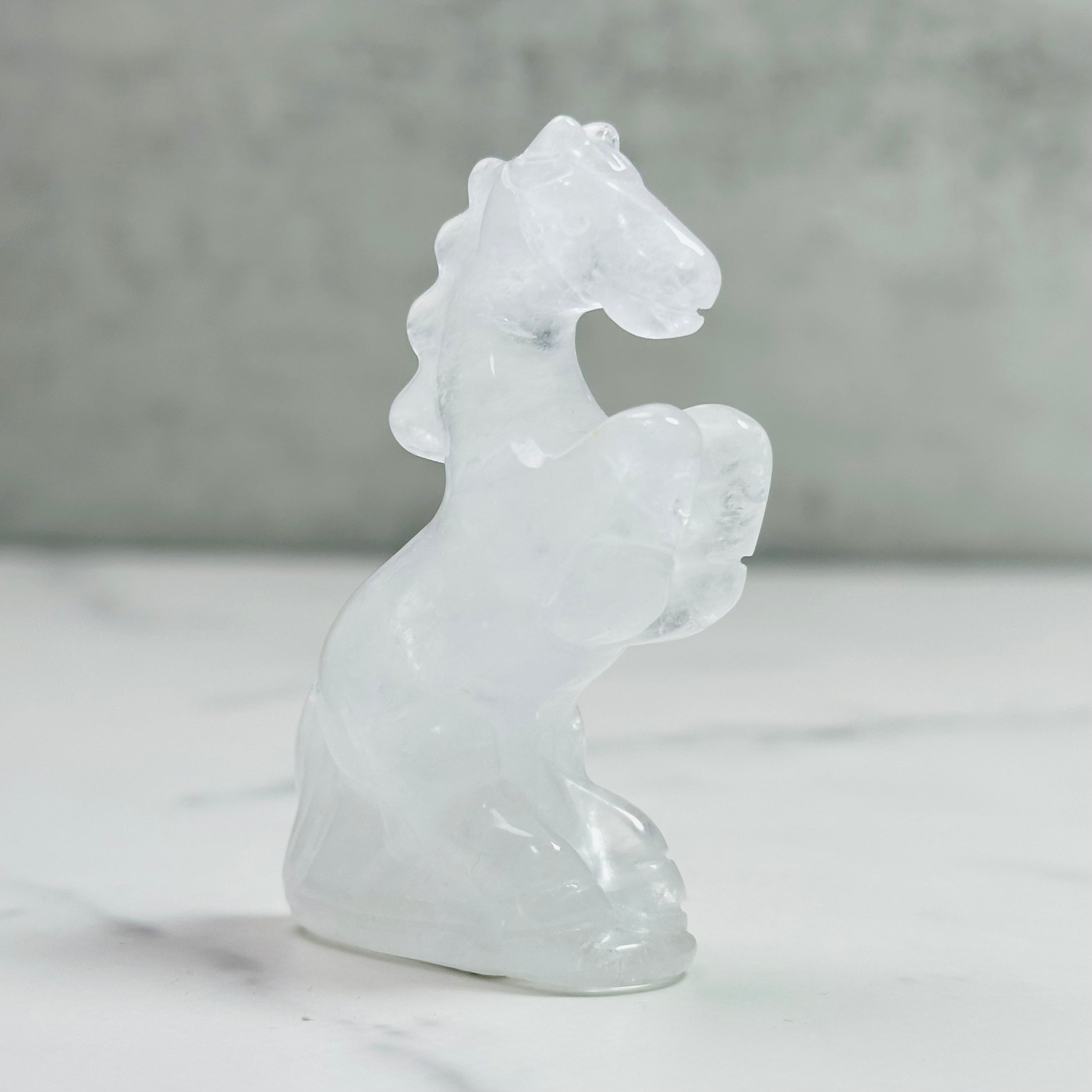 水晶を丁寧に彫刻した馬のオブジェ。前足を高く掲げた姿が印象的で、お部屋に凛とした清らかさをもたらします。来年の干支「午」は前向きなエネルギーを感じさせ、頑張る人の背中を押ししてくれることでしょう。ミルキーな質感はやさしく光を受け止め、お部屋に穏やかな明るさをもたらします。希望に満ちた新しい一年の象徴としてお迎えください。