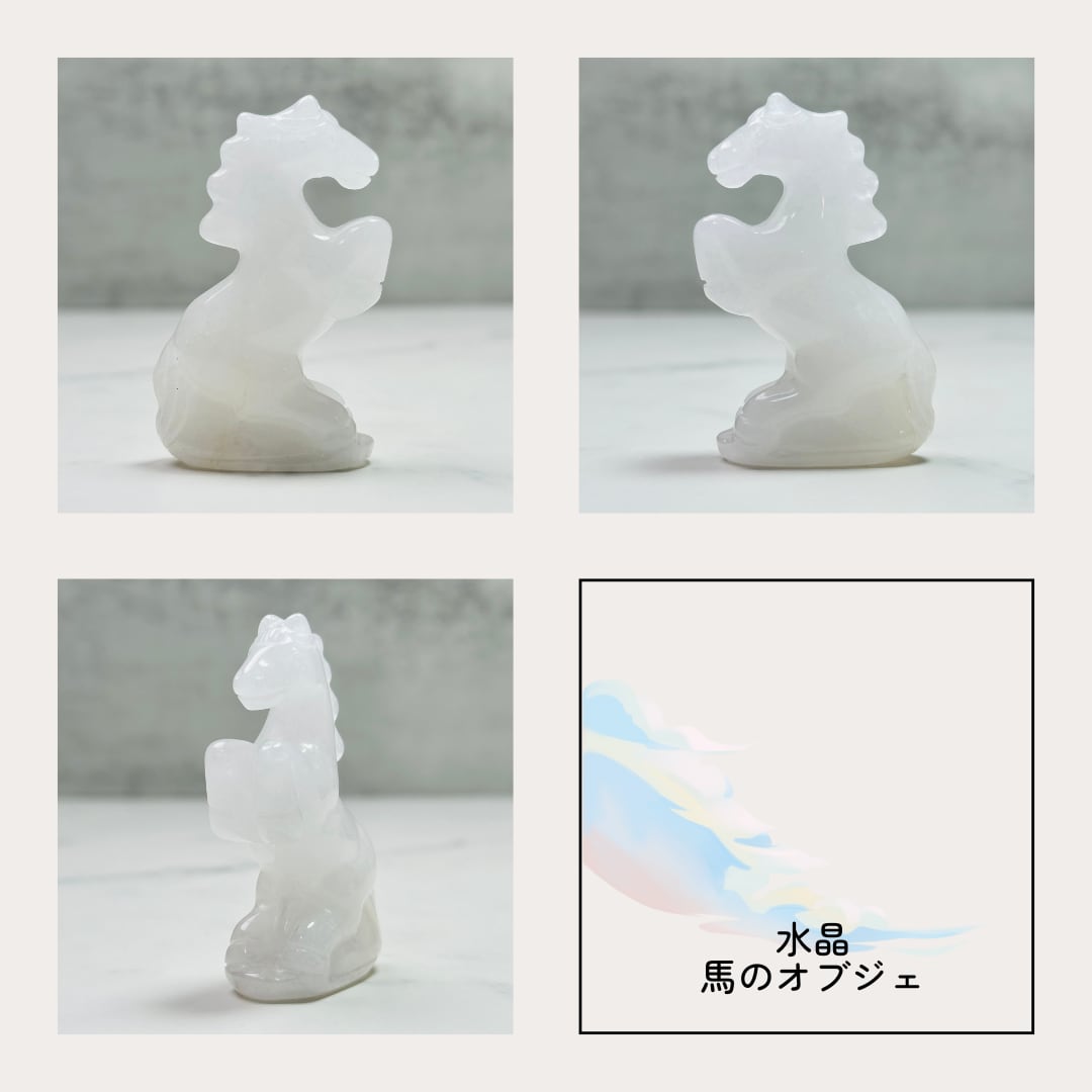 水晶は「万能の石」として世界中で古くから愛されてきた天然石です。「浄化」や「調和」を象徴し、装飾品や工芸品としても幅広く利用されています。馬のモチーフは「成功」「上昇」「勢い」の象徴とされ、努力や夢を応援する存在としても人気があります。