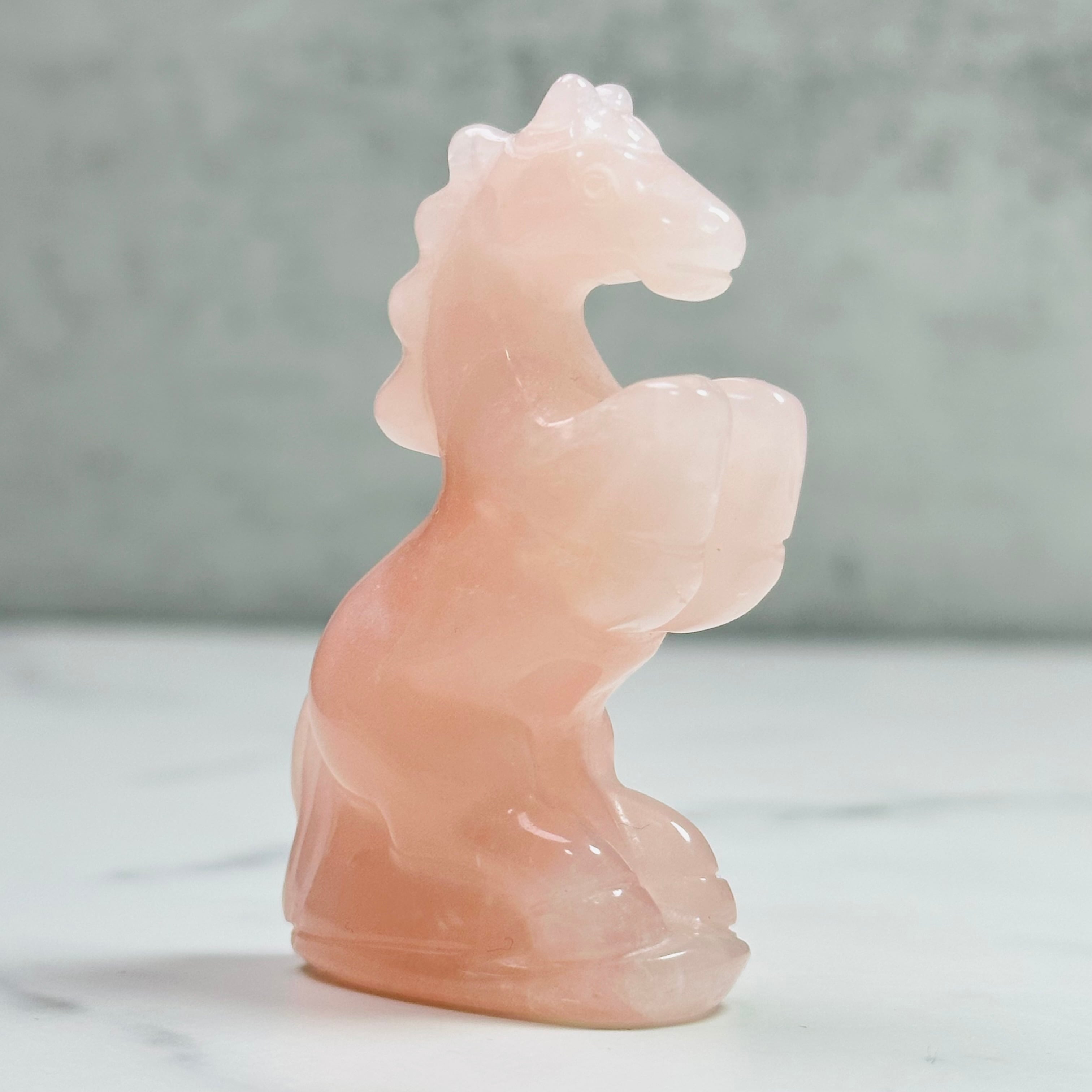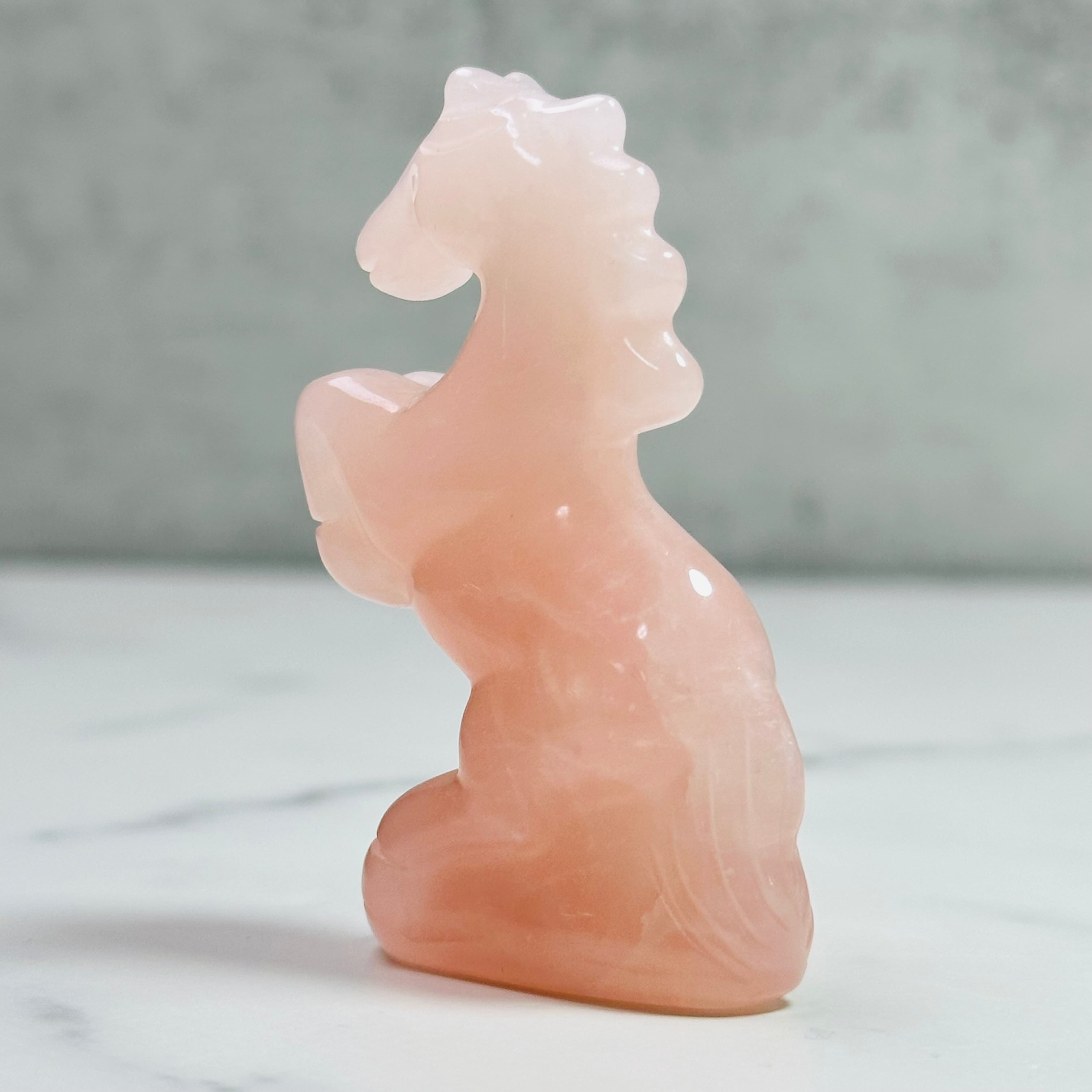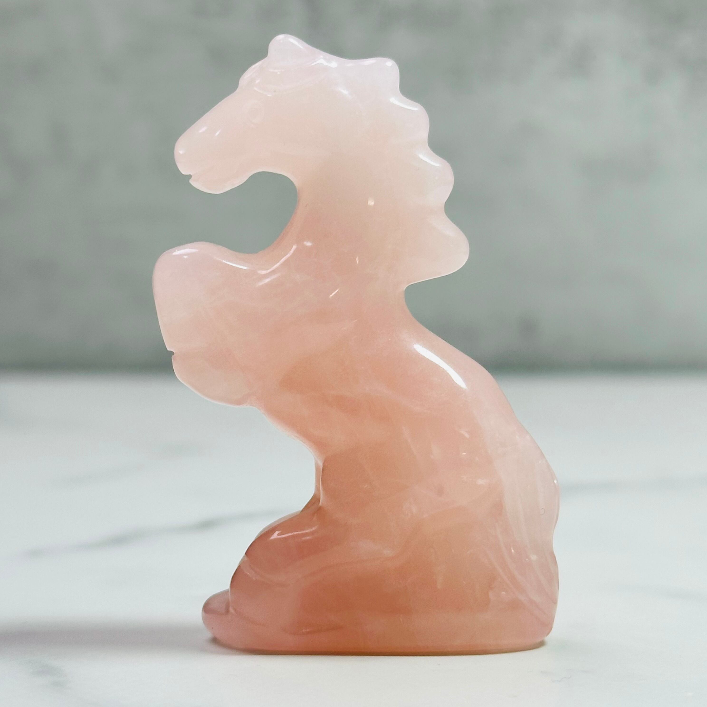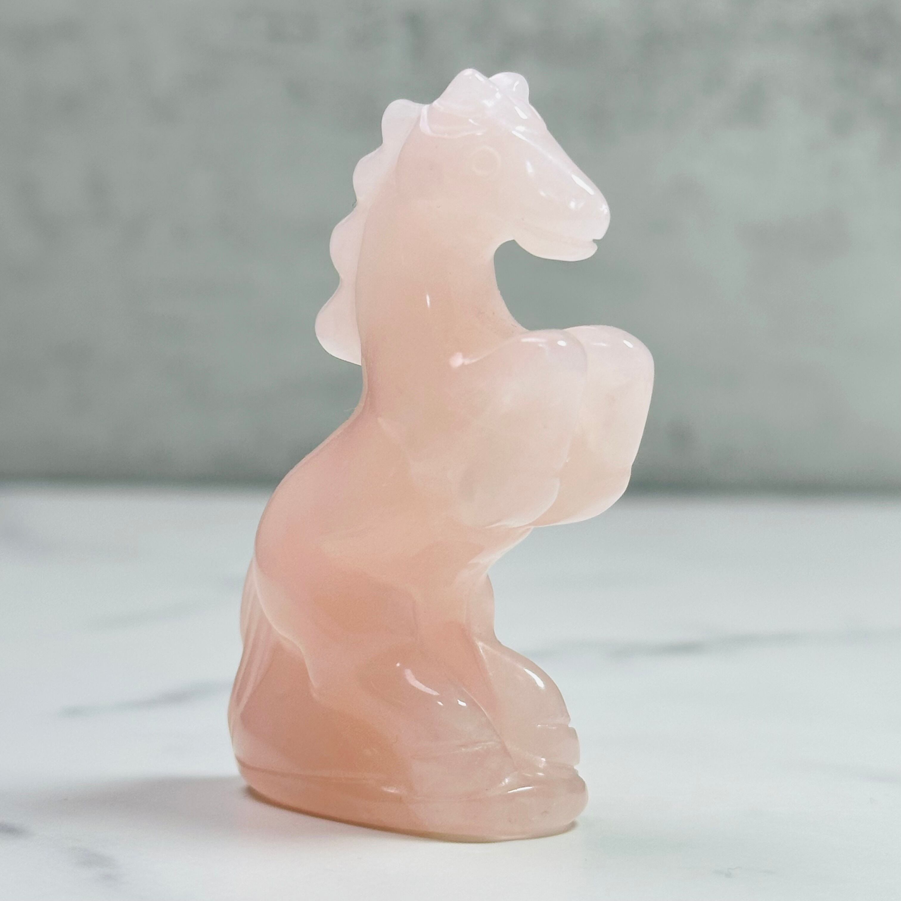 ローズクォーツを丁寧に彫刻した馬のオブジェ。前足を高く掲げた姿が印象的で、お部屋に凛とした清らかさをもたらします。来年の干支「午」は前向きなエネルギーを感じさせ、頑張る人の背中を押ししてくれることでしょう。やさしく光を受け止め、お部屋に穏やかな明るさをもたらします。希望に満ちた新しい一年の象徴としてお迎えください。