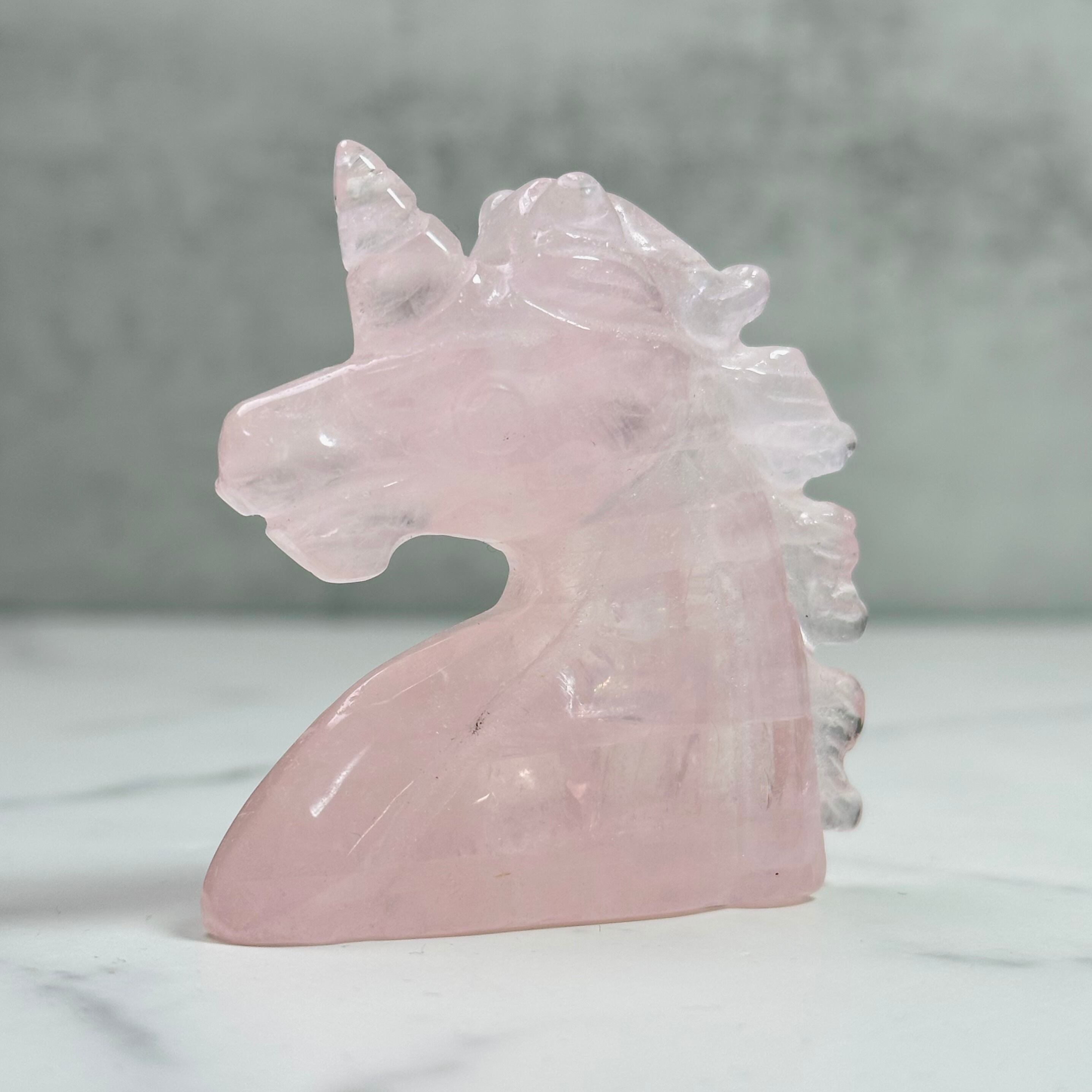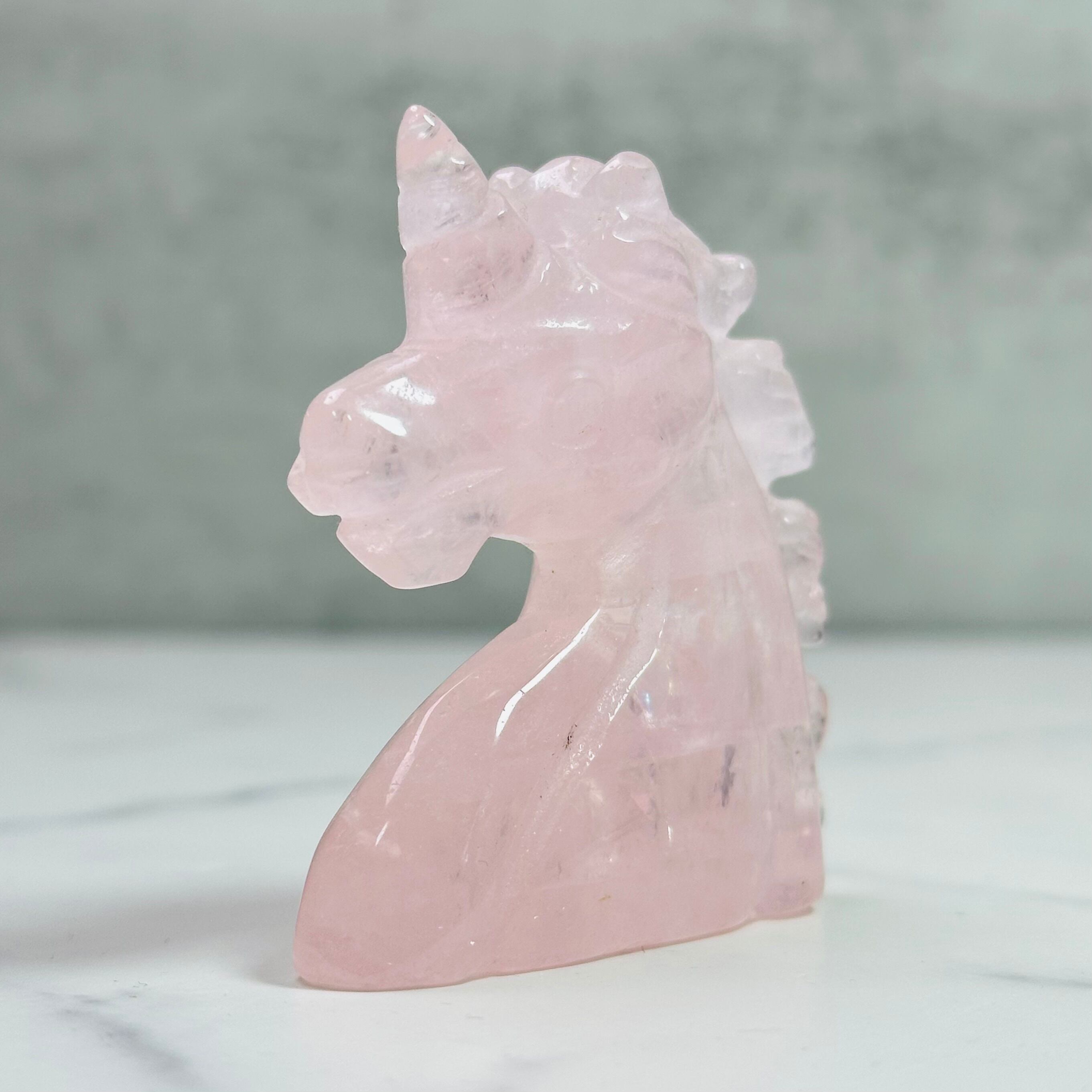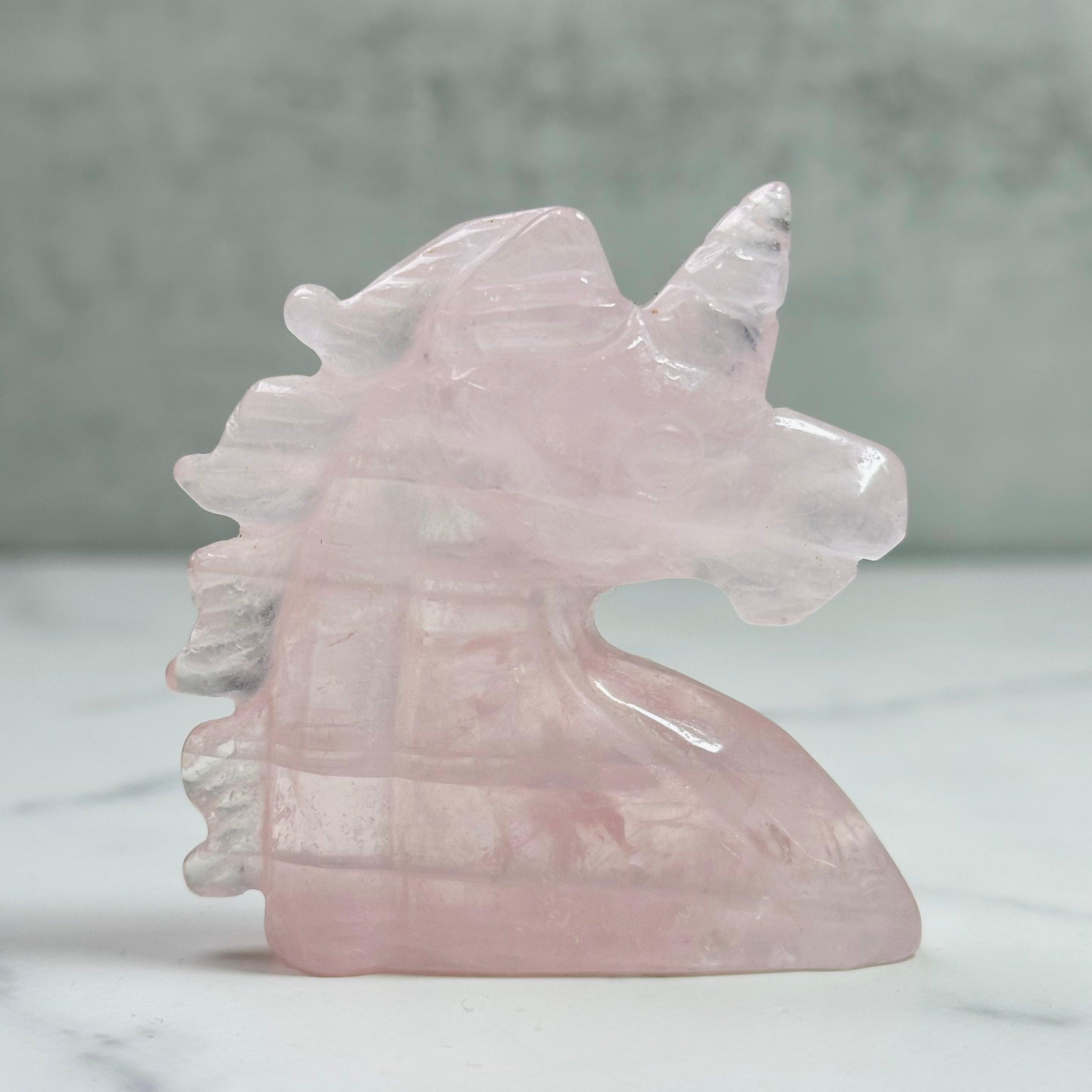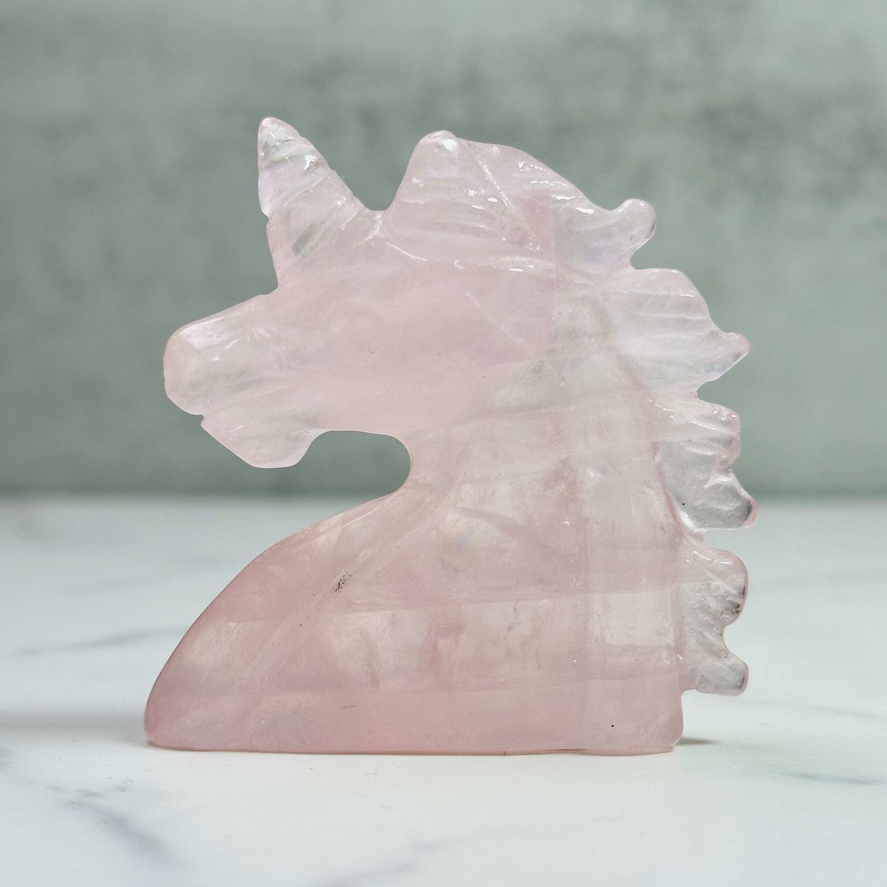 透き通ったクリアなローズクォーツのユニコーン。内部には虹をたっぷりと含みます。聡明な印象の大きな瞳と強い意志を表す太い角が凛々しく、新しい年の決意を込めるのに相応しい佇まいです。みずみずしい質感と幻想的なフォルムは日常に癒しを与えながら、空間浄化にも役立つ頼れるインテリアアイテムです。贈り物にもおすすめです。