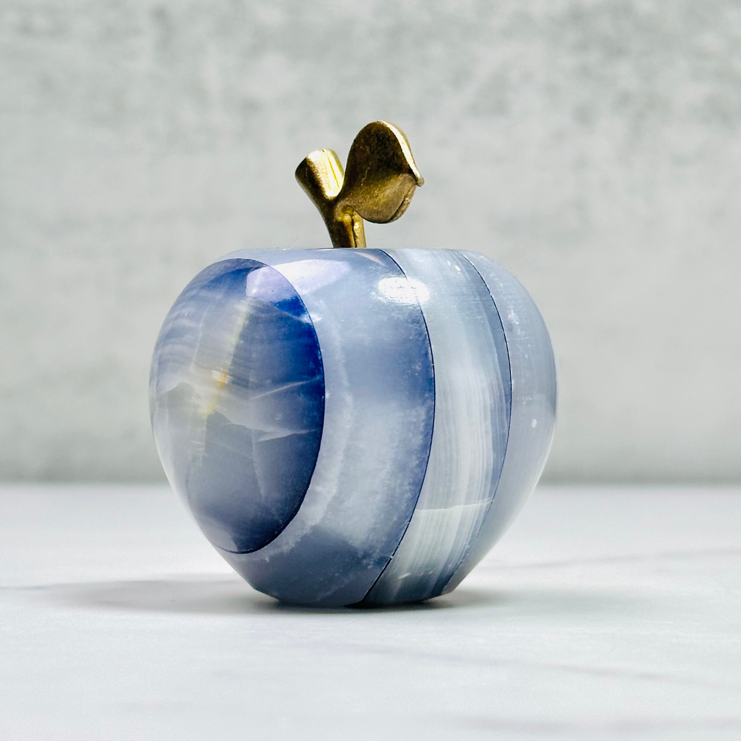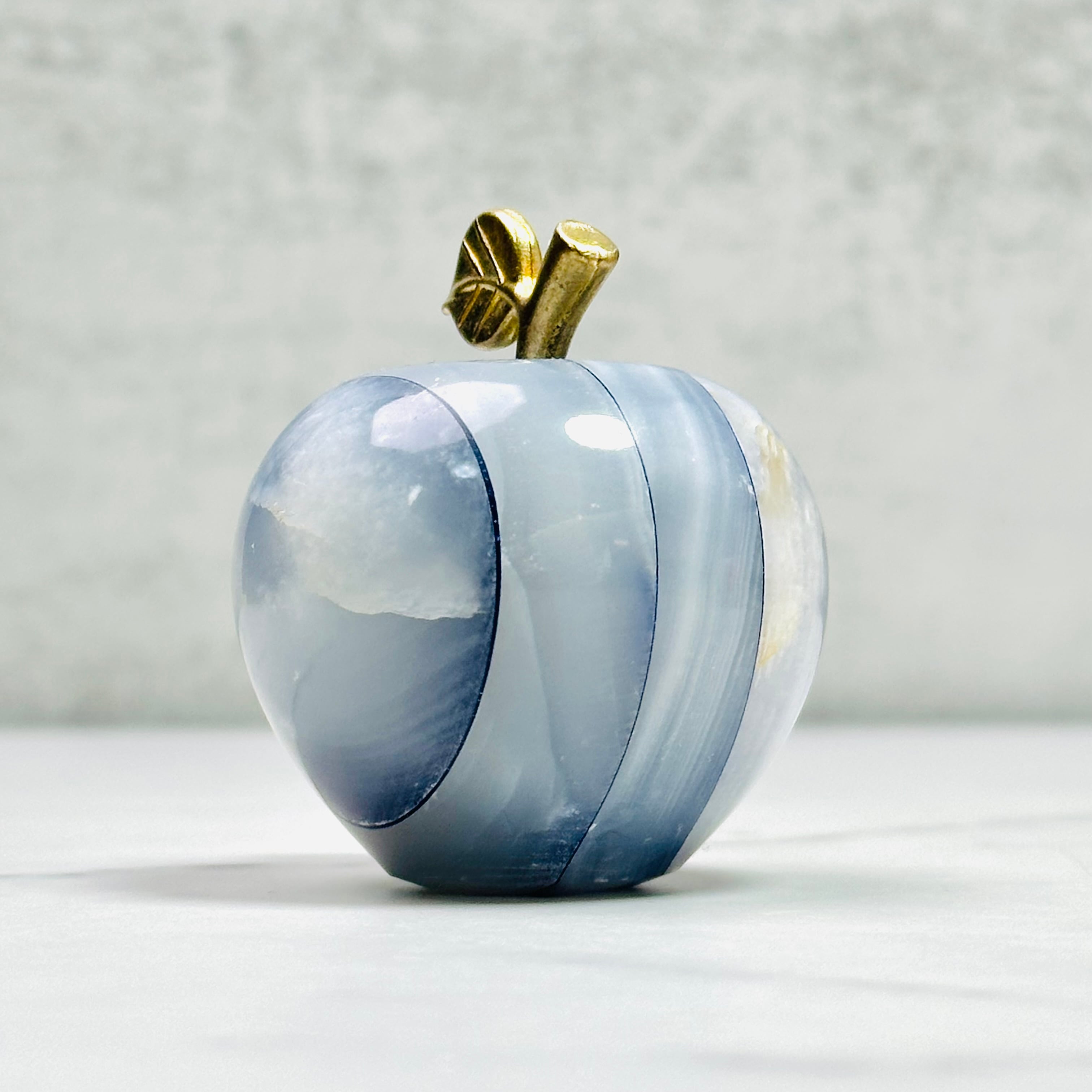 パキスタン産オニッキスを染色してスライスし、重ね合わせたものをりんごの形に整形しました。