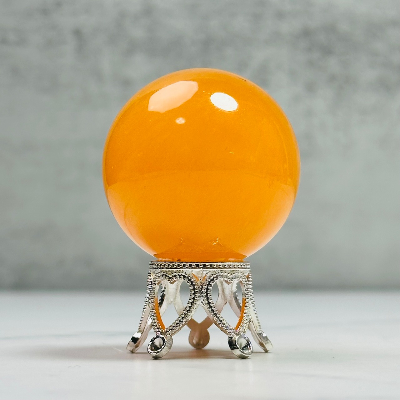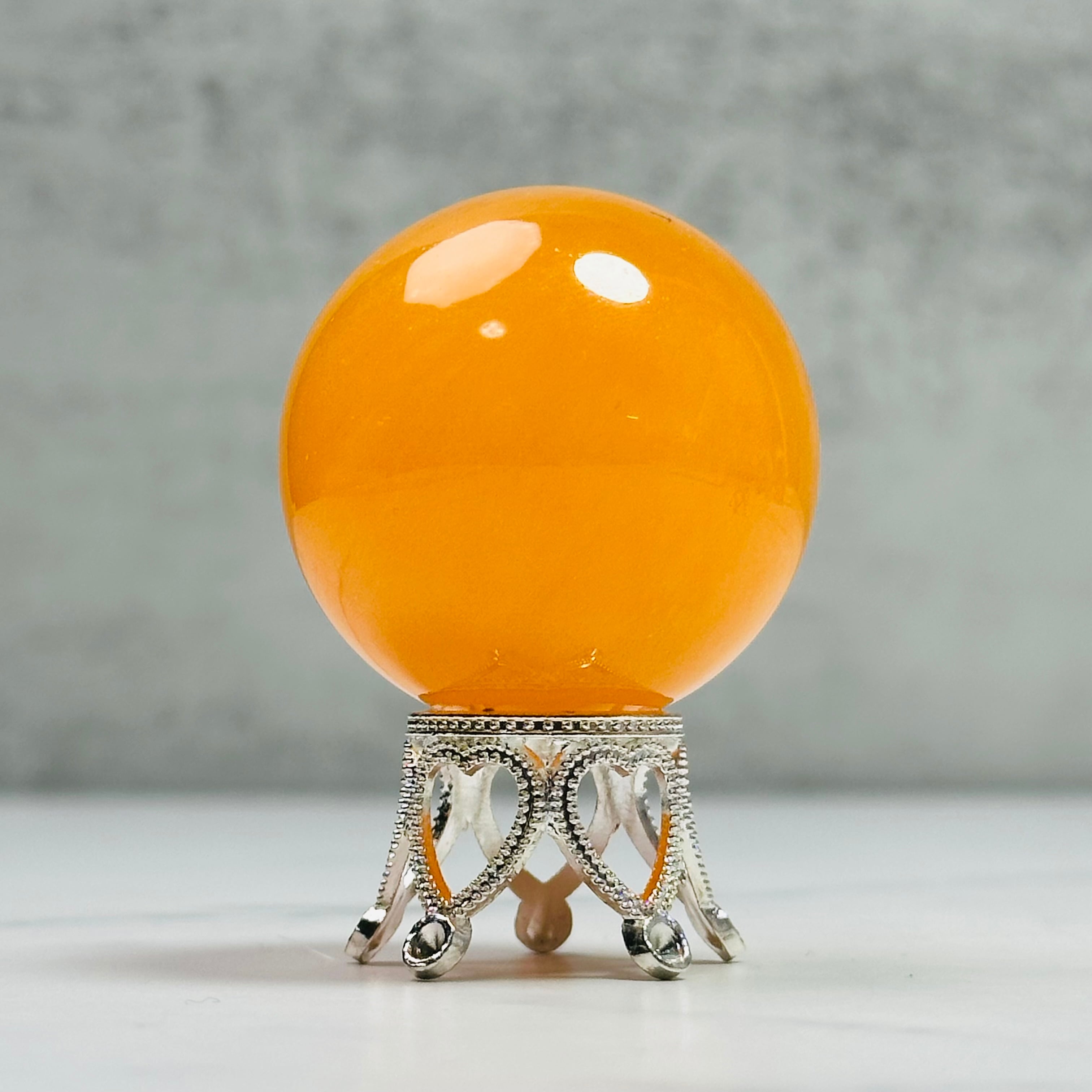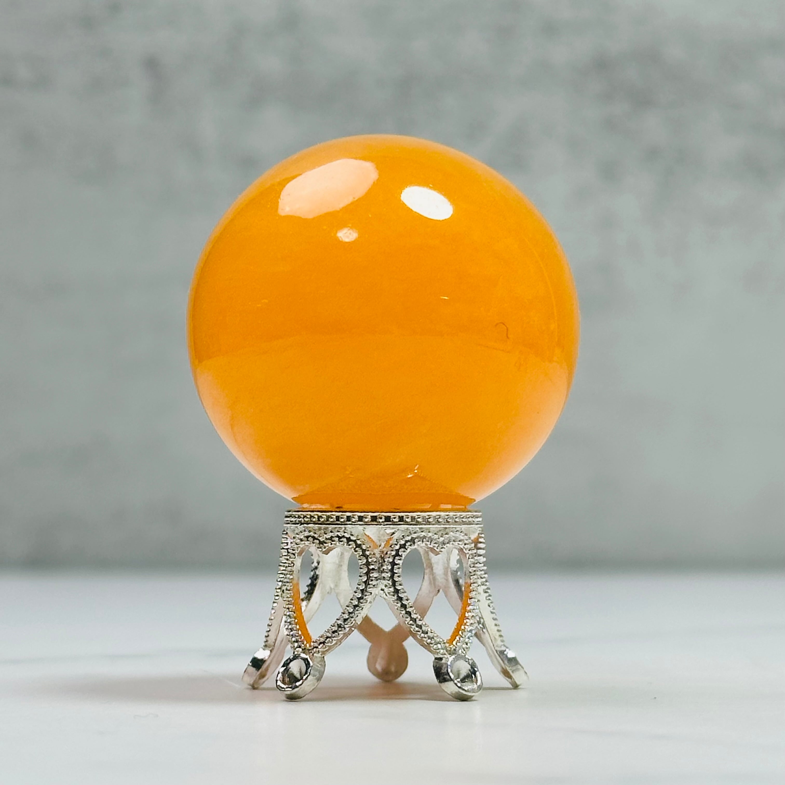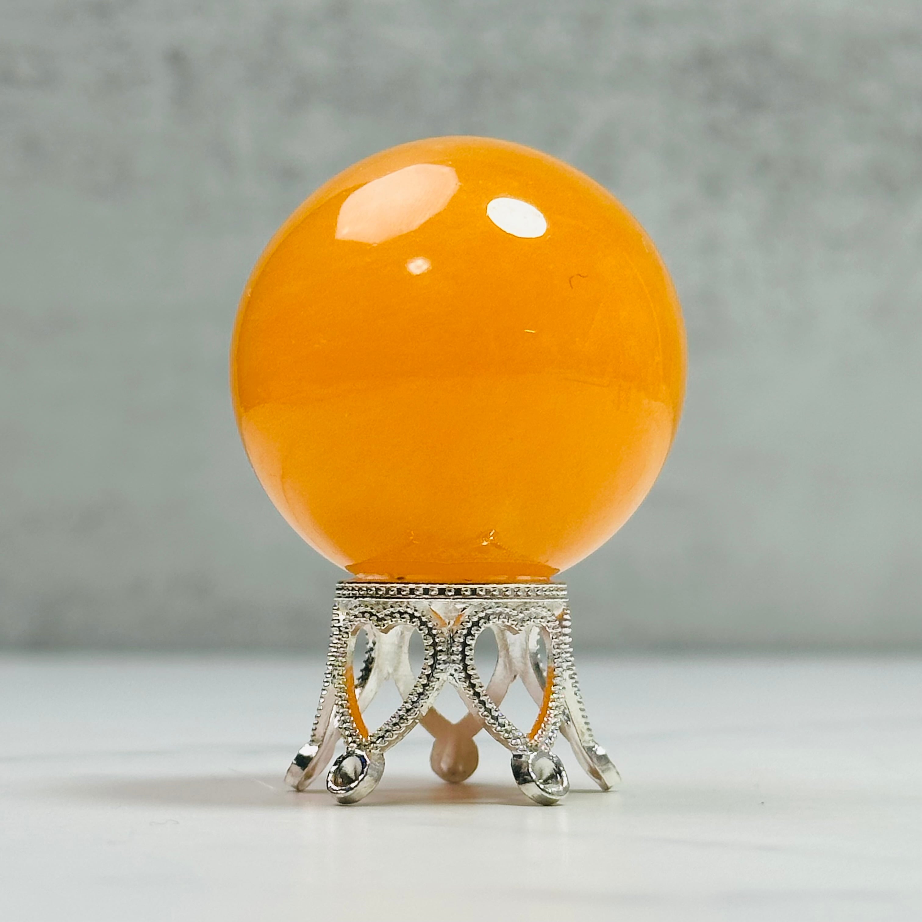 ビタミンカラーのオレンジカルサイトスフィアです。みずみずしい艶感と濁りのない明るいオレンジ色がとても綺麗な高品質なオレンジカルサイトです。オレンジゼリーのようなフレッシュでジューシィなアイテムです。