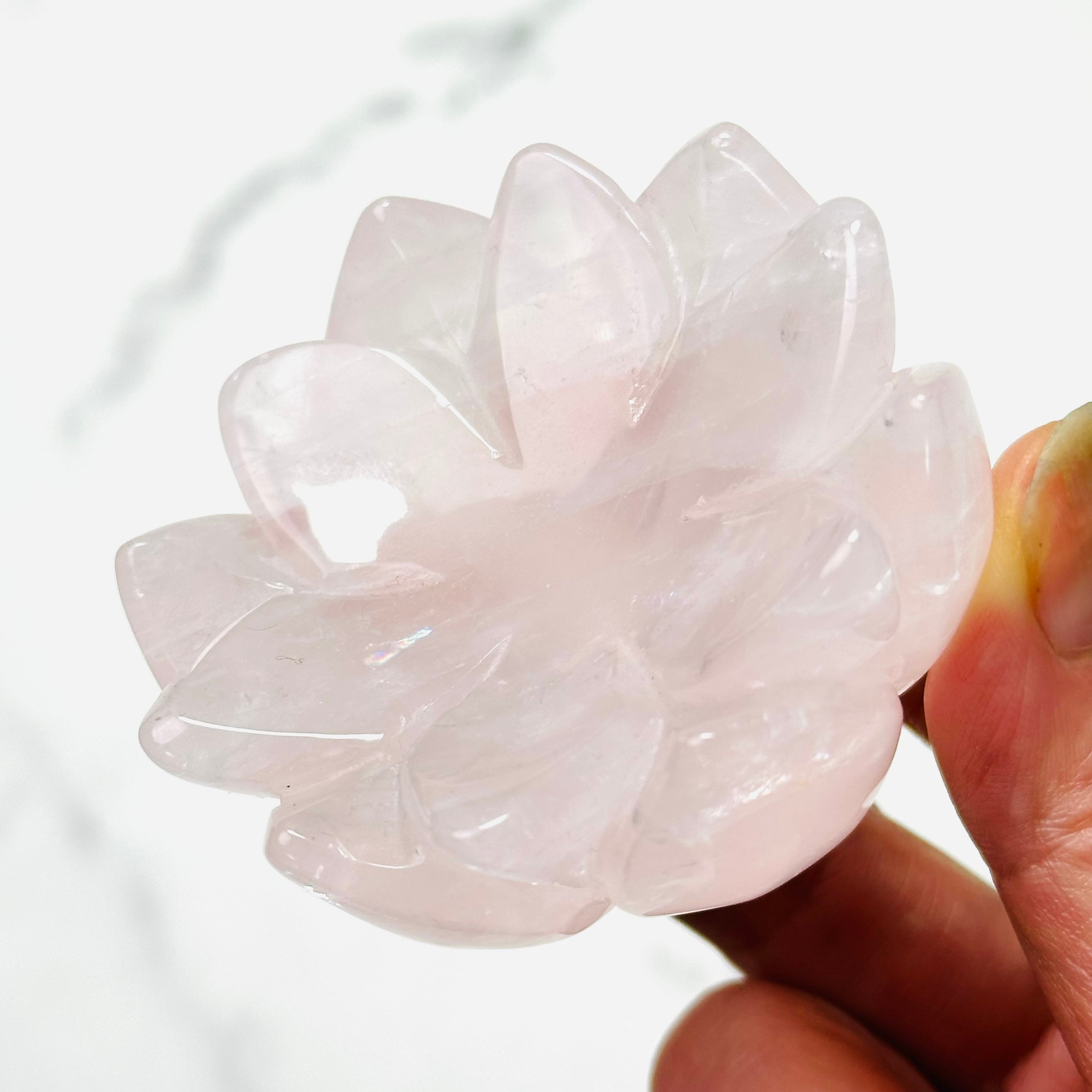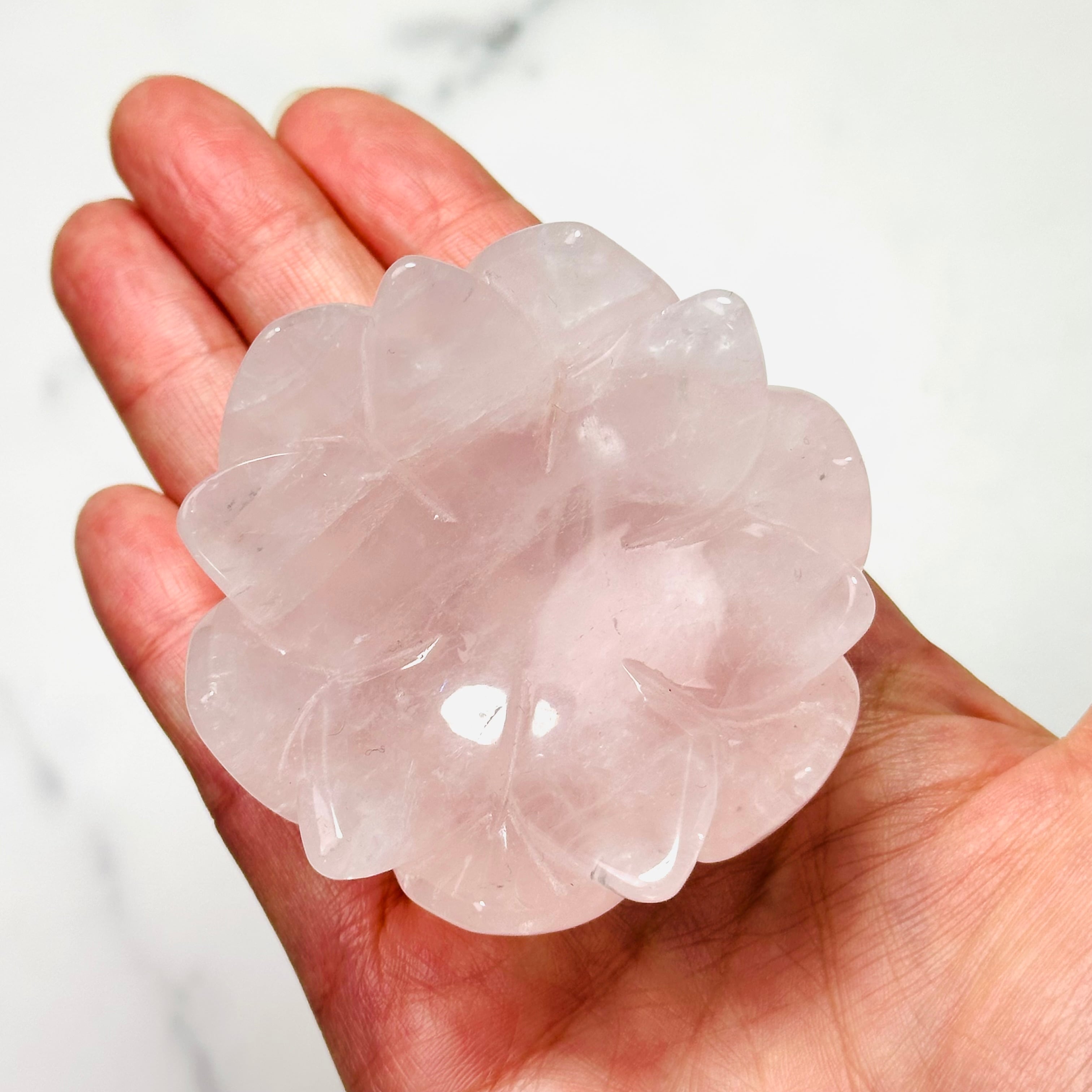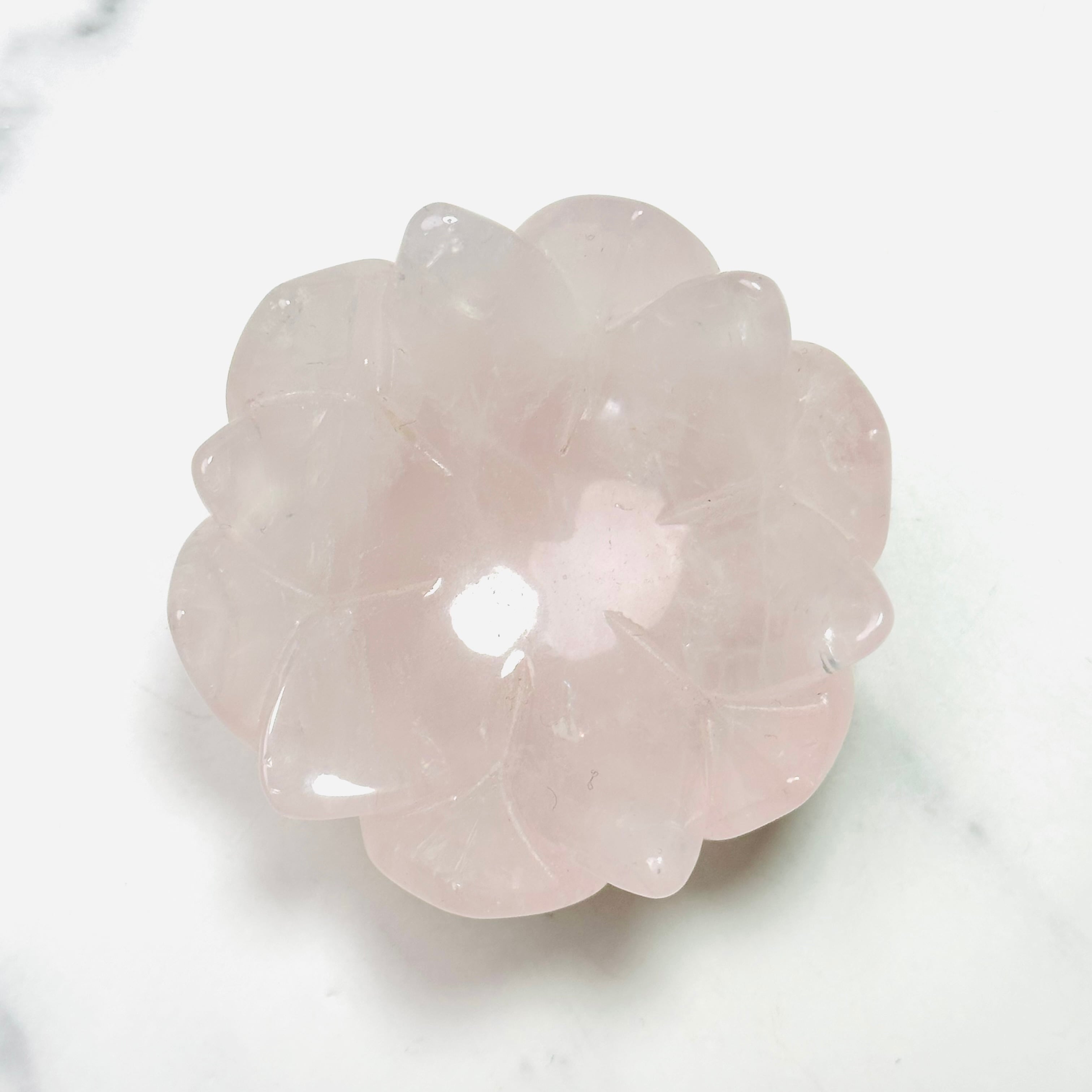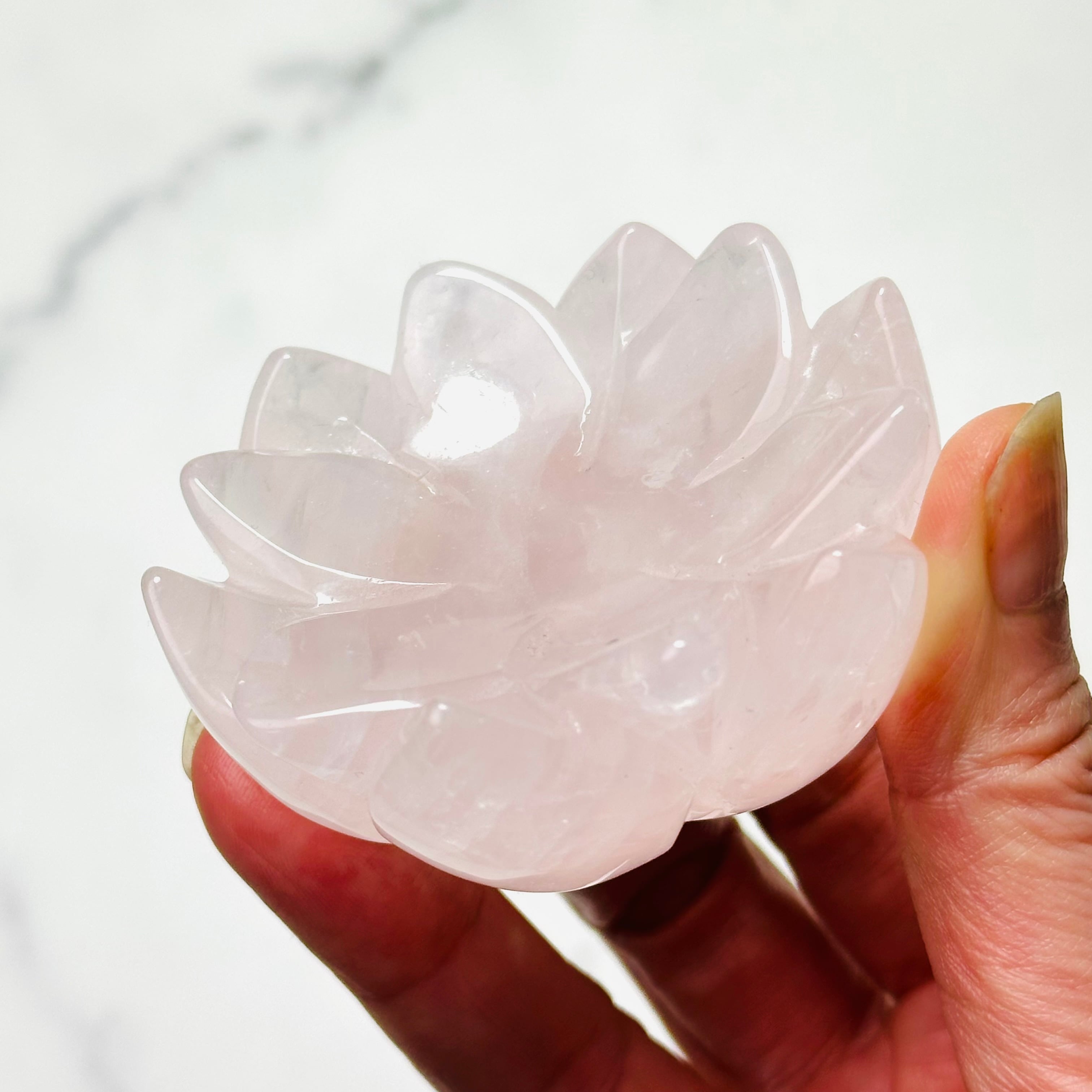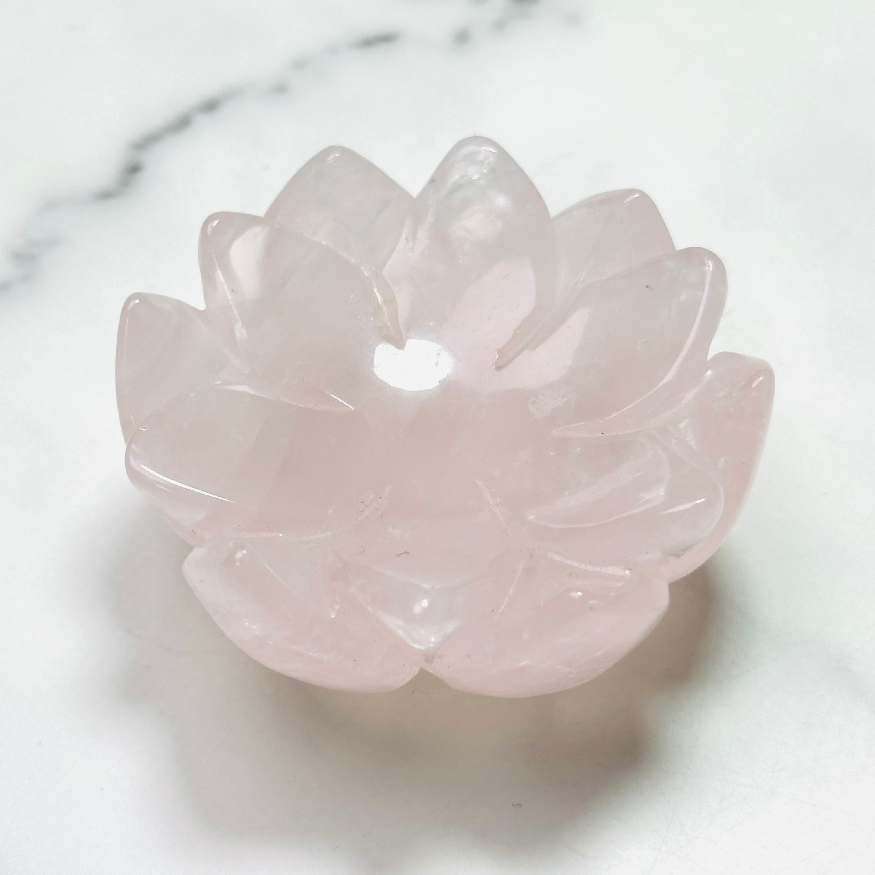 淡いピンクが優しくきらめくローズクォーツを、蓮花デザインの台座に仕立てた上品なインテリアストーンです。光を受けるとふんわりと広がる柔らかな色合いと可愛らしい虹が、お部屋に可憐で落ち着いた雰囲気を添えてくれます。透明感のあるスフィアやタンブルを載せたり、アクセサリートレイとしてもお使いいただけます。