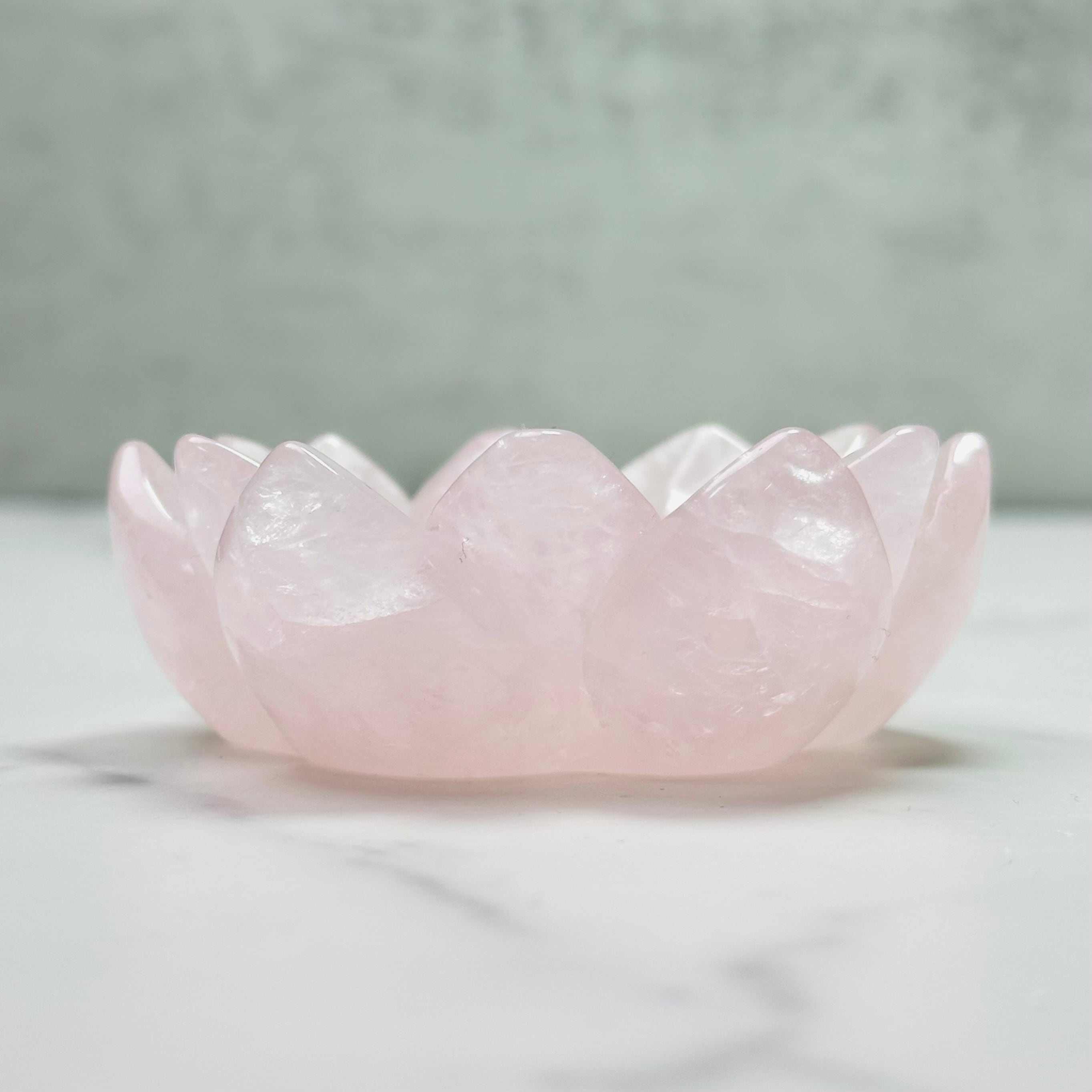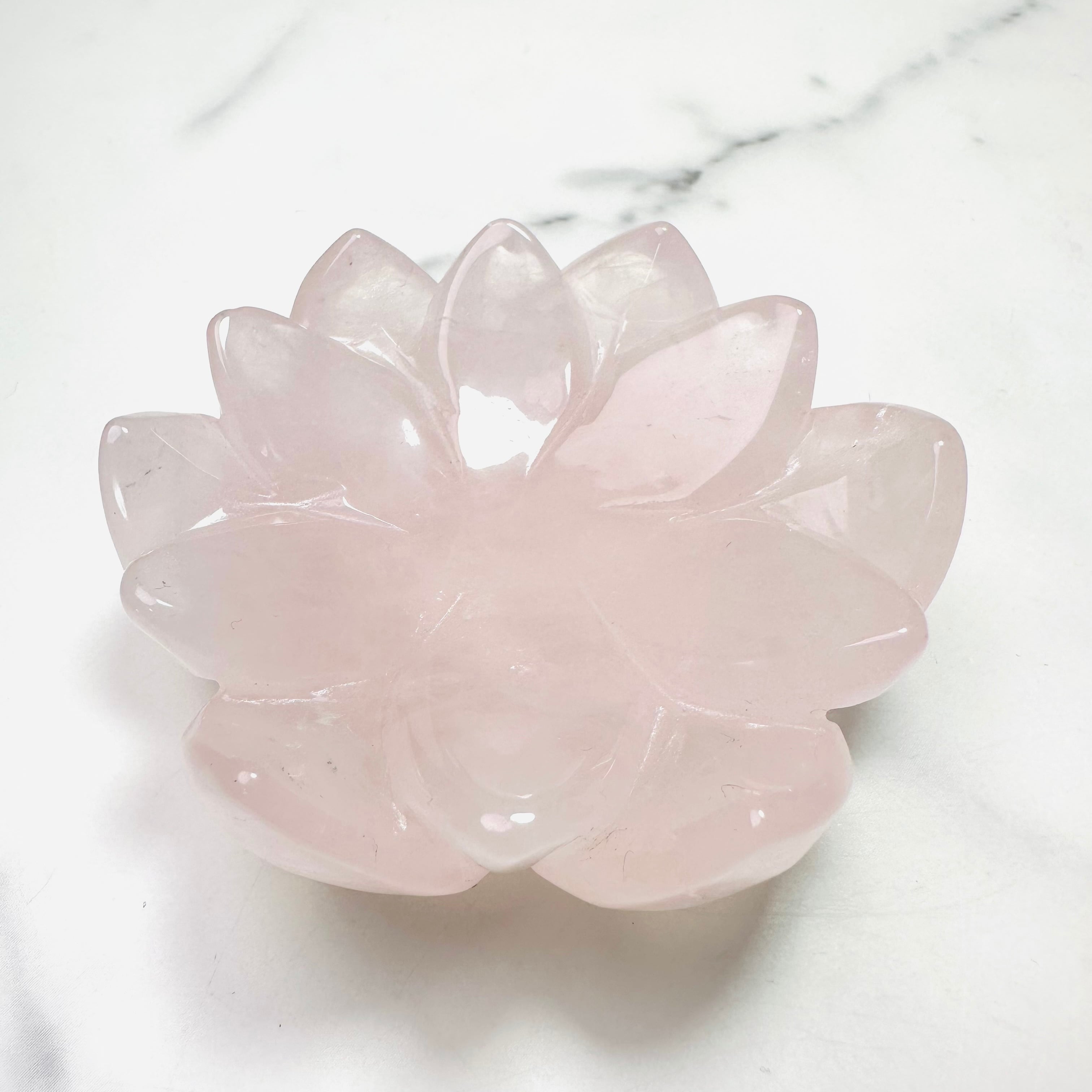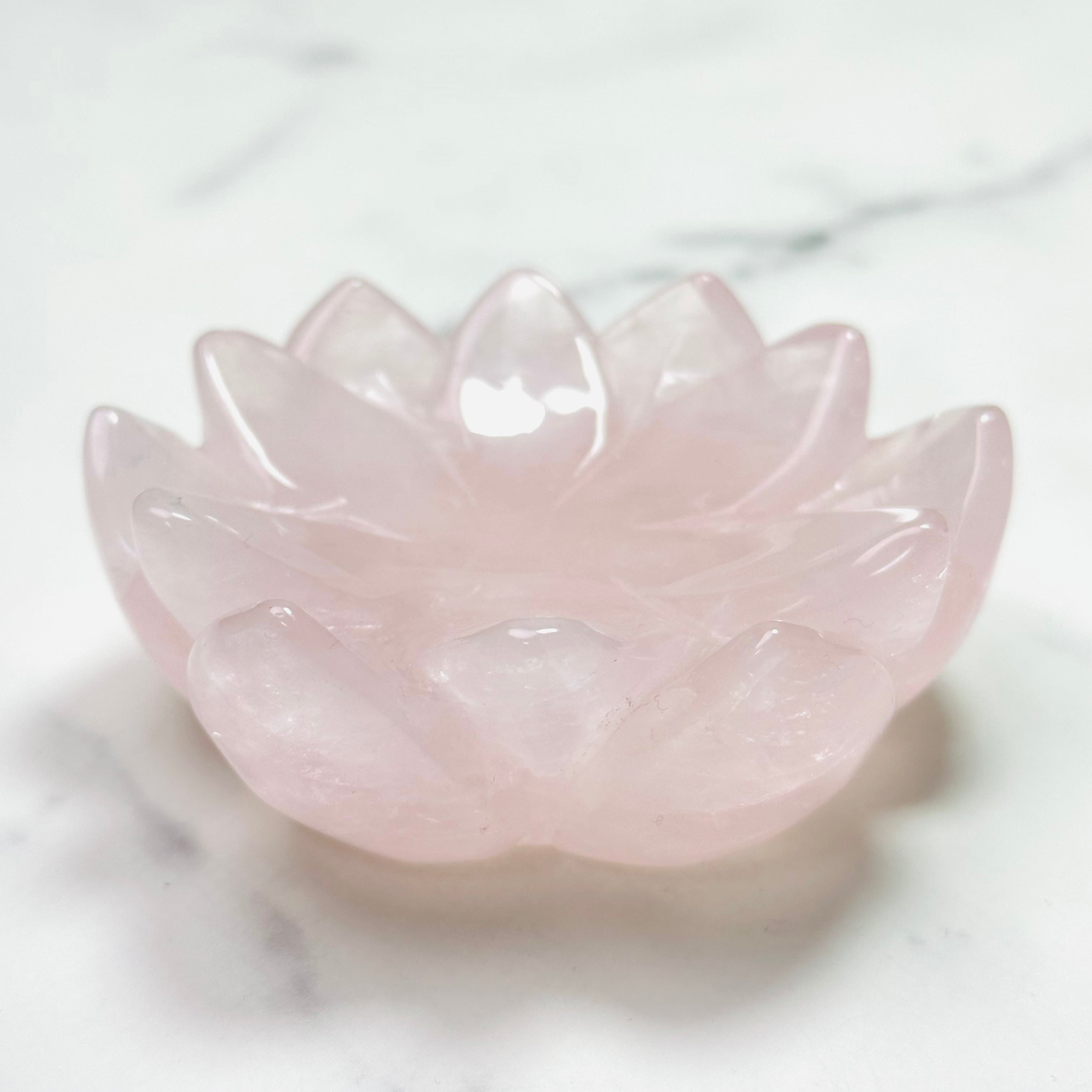 淡いピンクが優しくきらめくローズクォーツを、蓮花デザインの台座に仕立てた上品なインテリアストーンです。光を受けるとふんわりと広がる柔らかな色合いと可愛らしい虹が、お部屋に可憐で落ち着いた雰囲気を添えてくれます。透明感のあるスフィアやタンブルを載せたり、アクセサリートレイとしてもお使いいただけます。