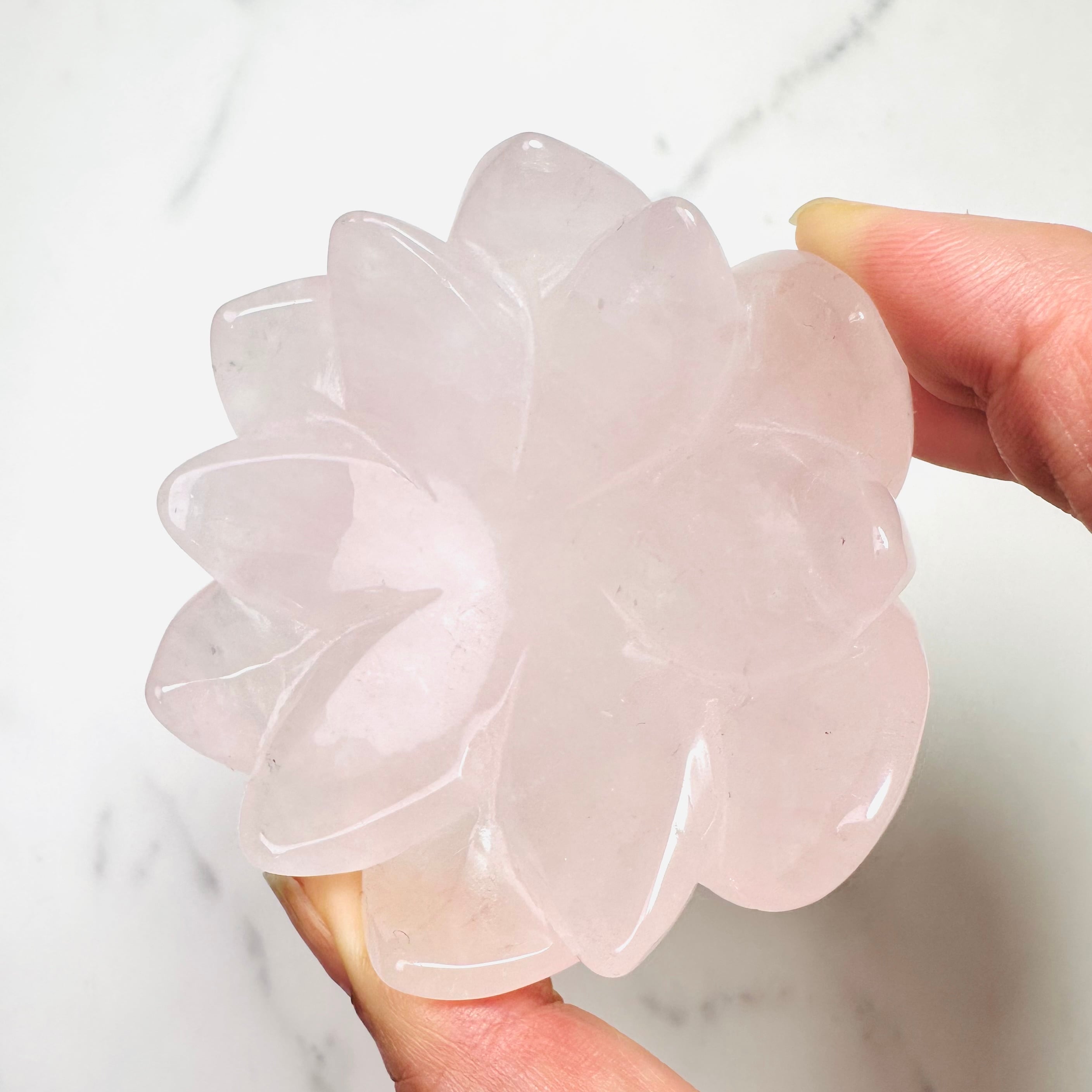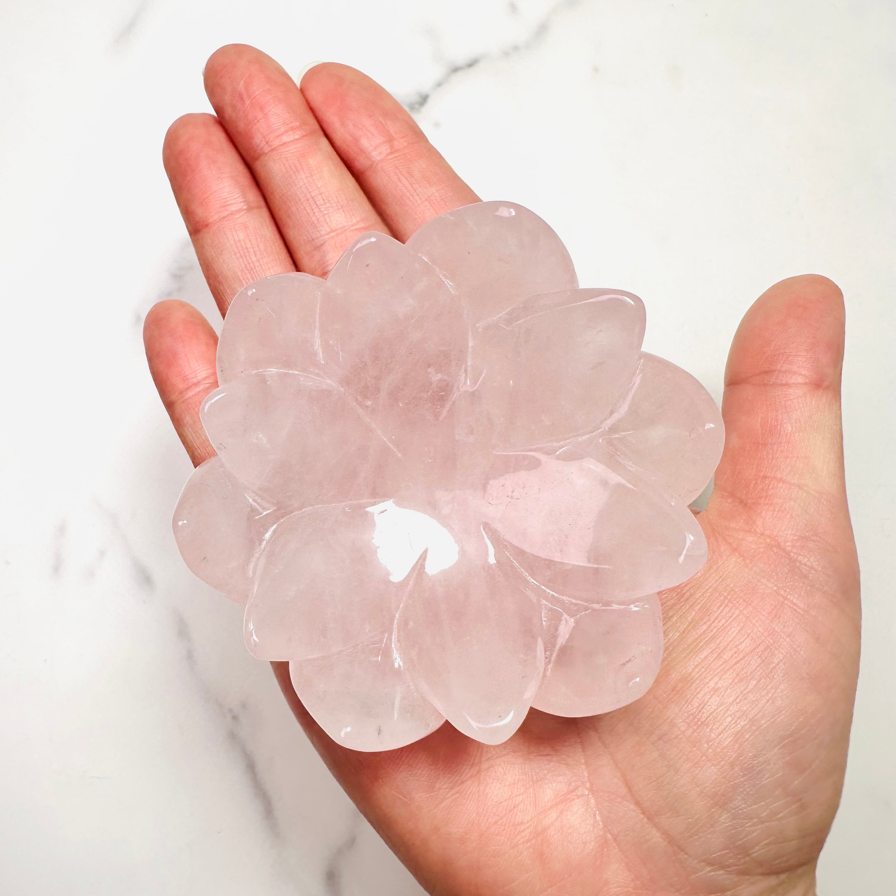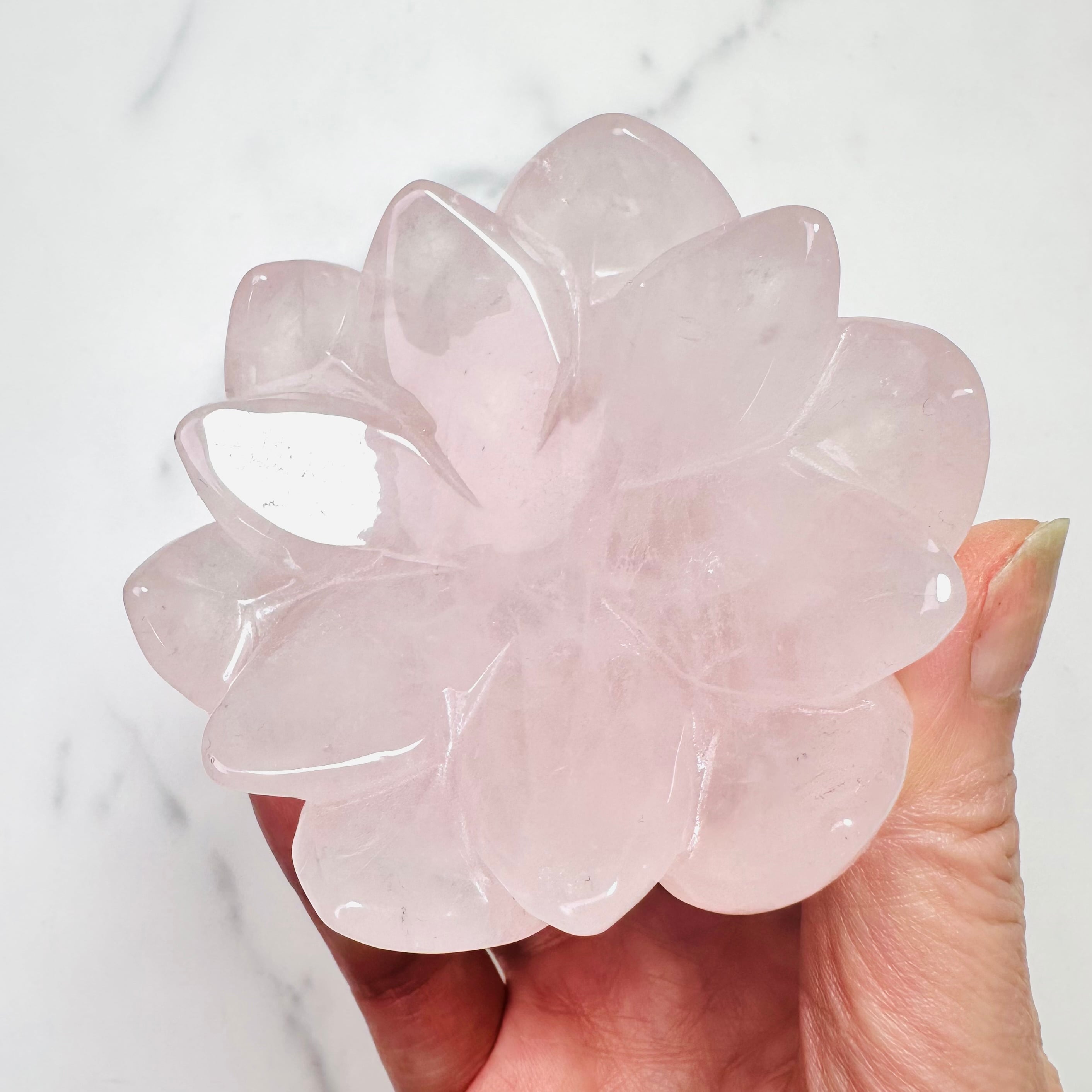 淡いピンクが優しくきらめくローズクォーツを、蓮花デザインの台座に仕立てた上品なインテリアストーンです。光を受けるとふんわりと広がる柔らかな色合いと可愛らしい虹が、お部屋に可憐で落ち着いた雰囲気を添えてくれます。透明感のあるスフィアやタンブルを載せたり、アクセサリートレイとしてもお使いいただけます。