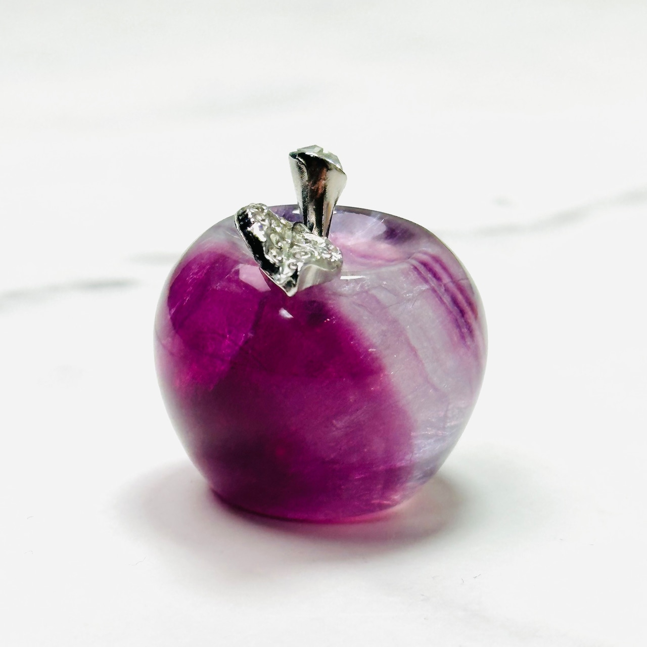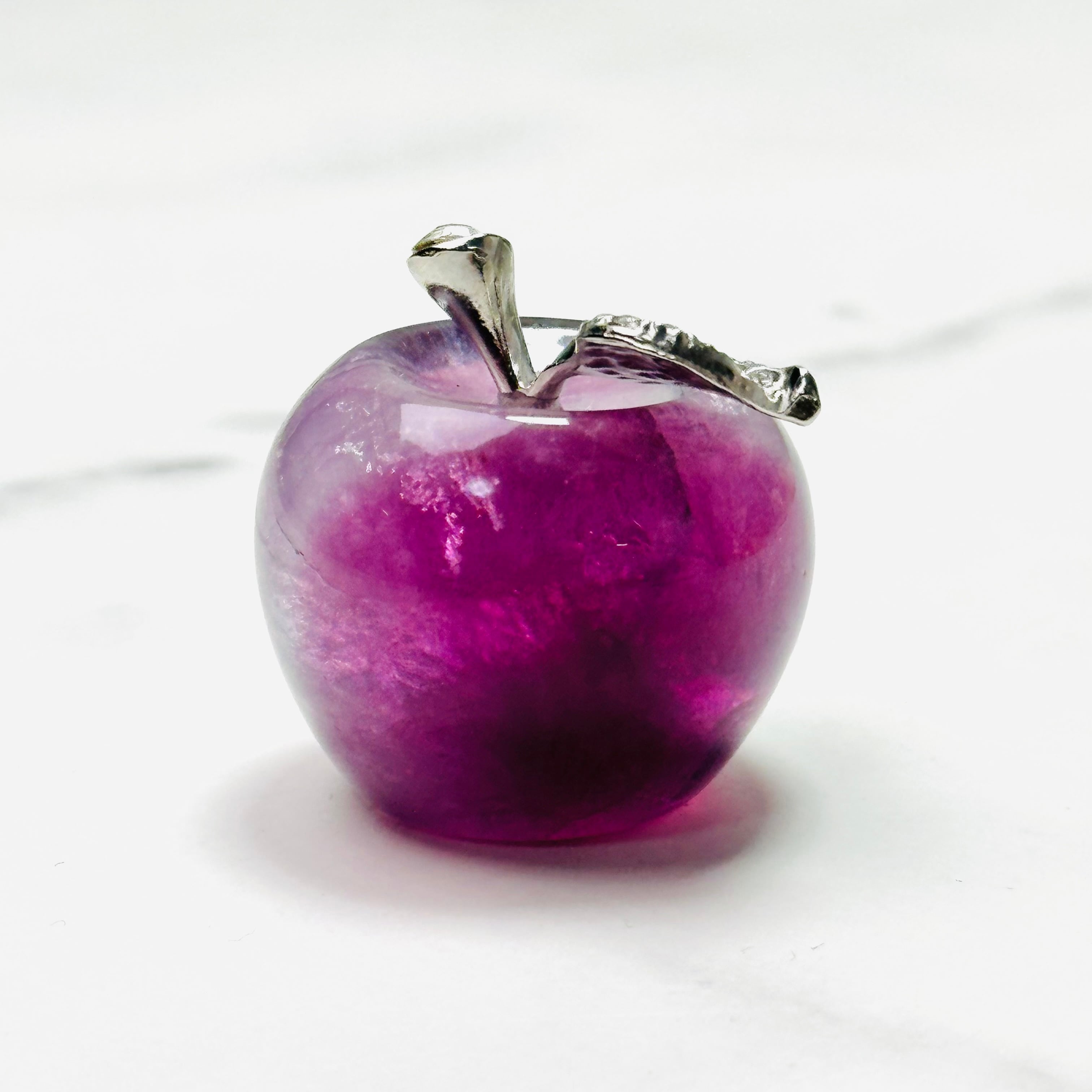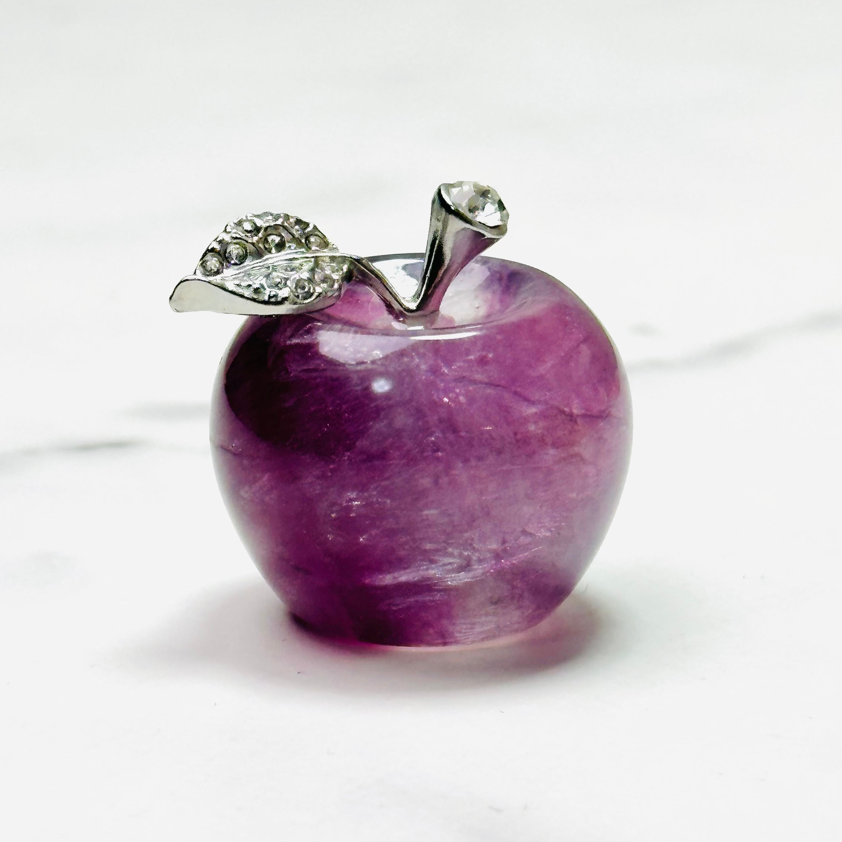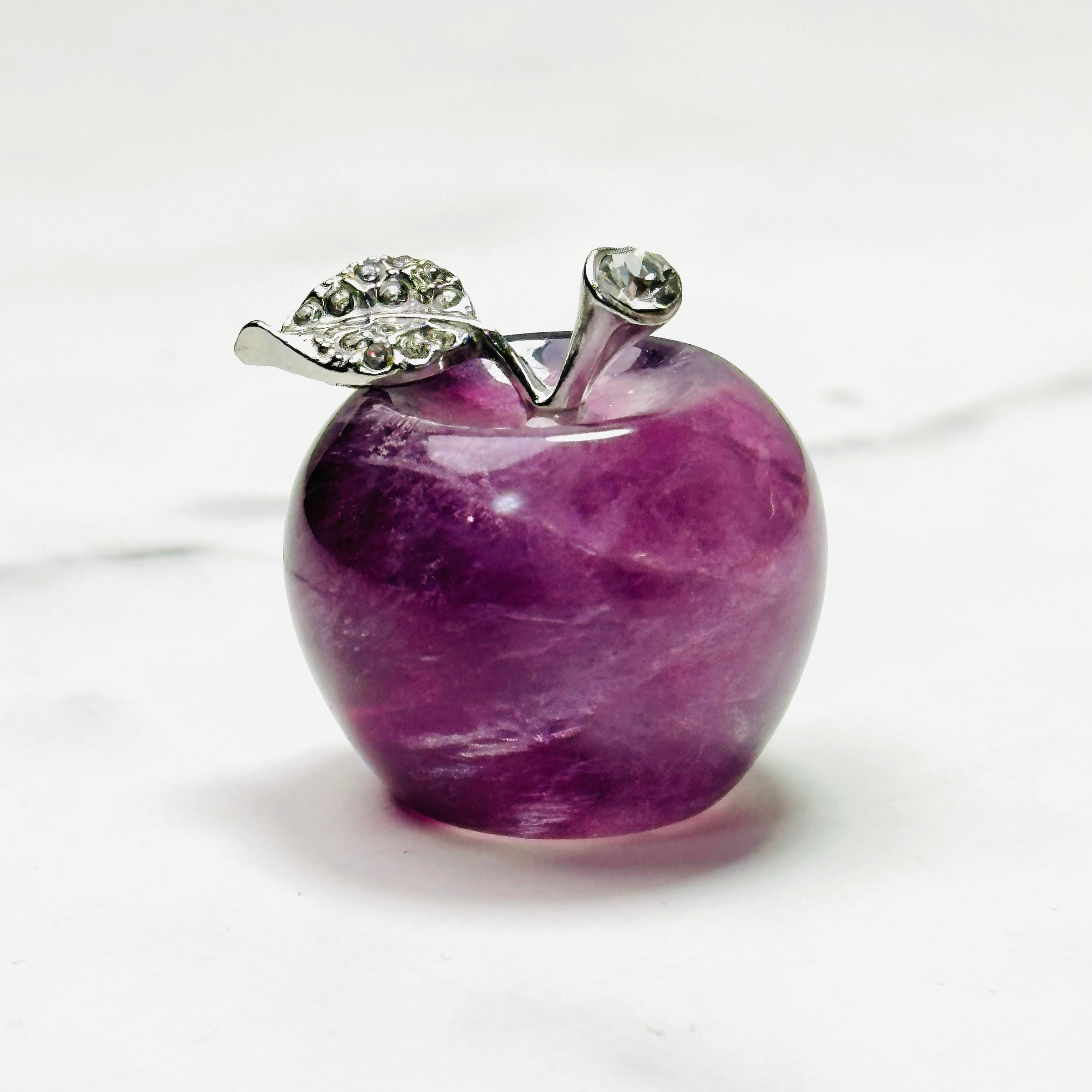 ころんとしたフォルムが愛らしい天然石フローライトのりんご。美しい色合いで光の当たり方や角度によって表情が変わります。お部屋のお気に入りスペースに飾ったり、ペーパーウエイトとしてお使いください。大切な方へのギフトにもぴったりです。ナチュラルで上品な雰囲気が、大人の可愛らしさを引き立てます。