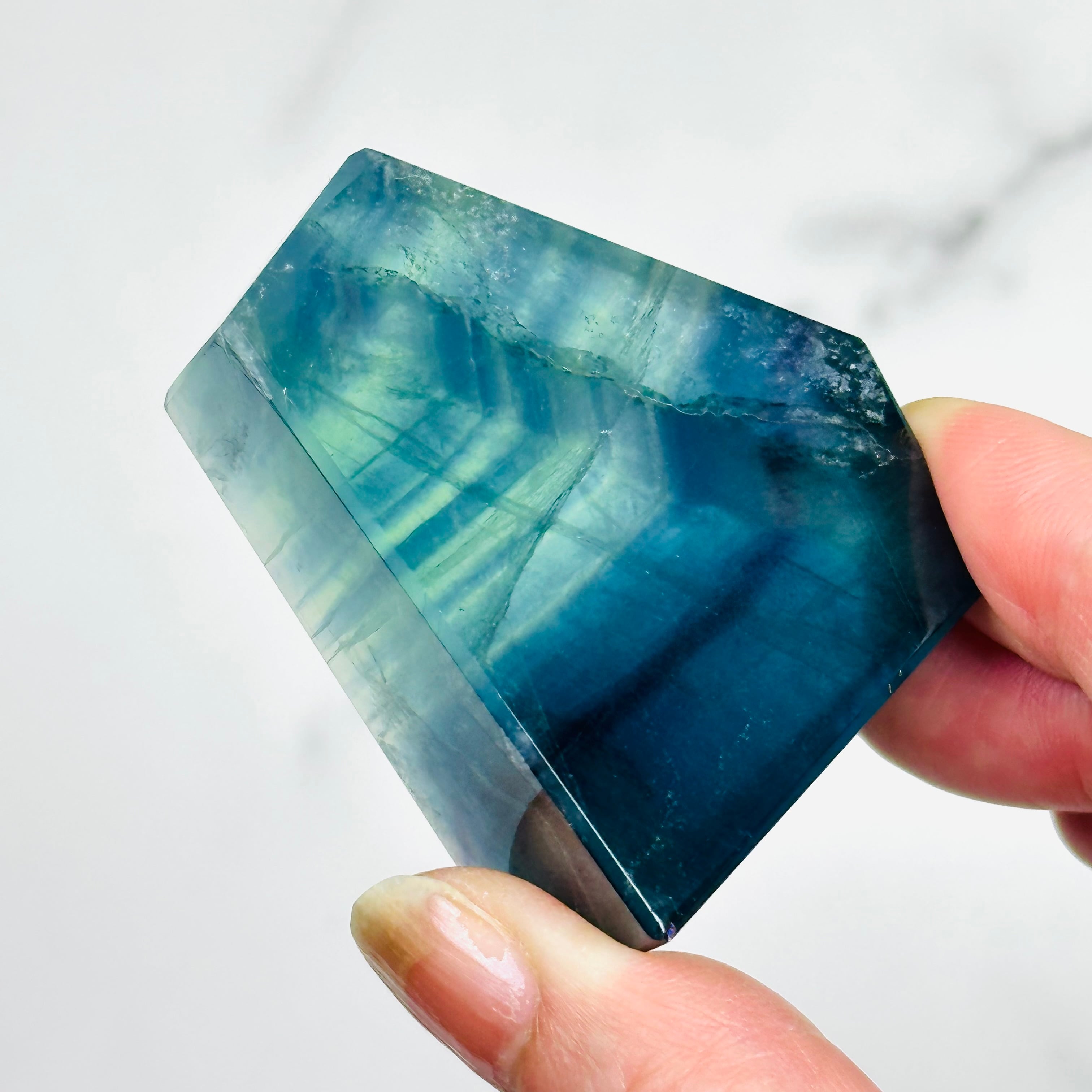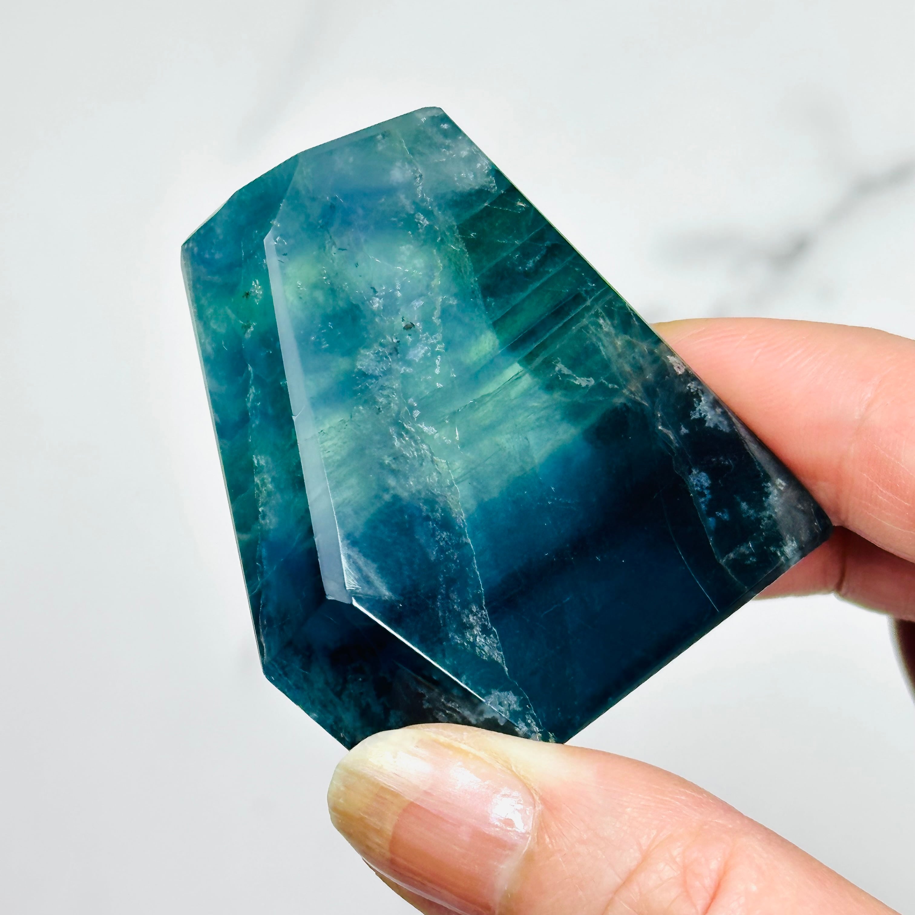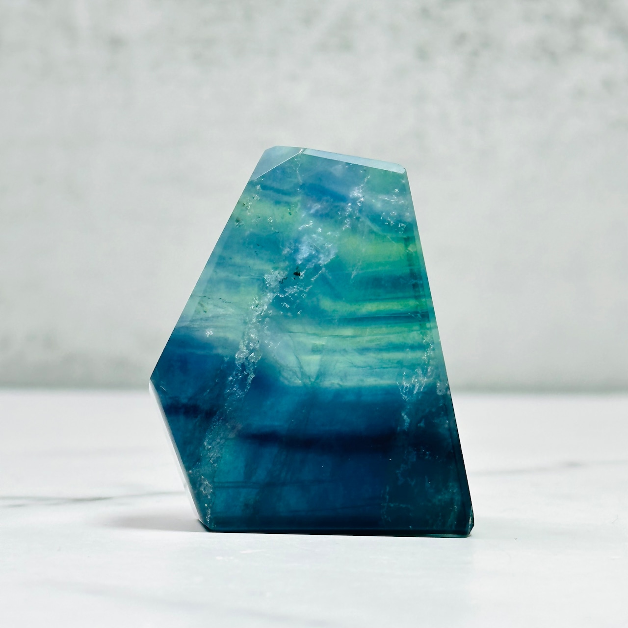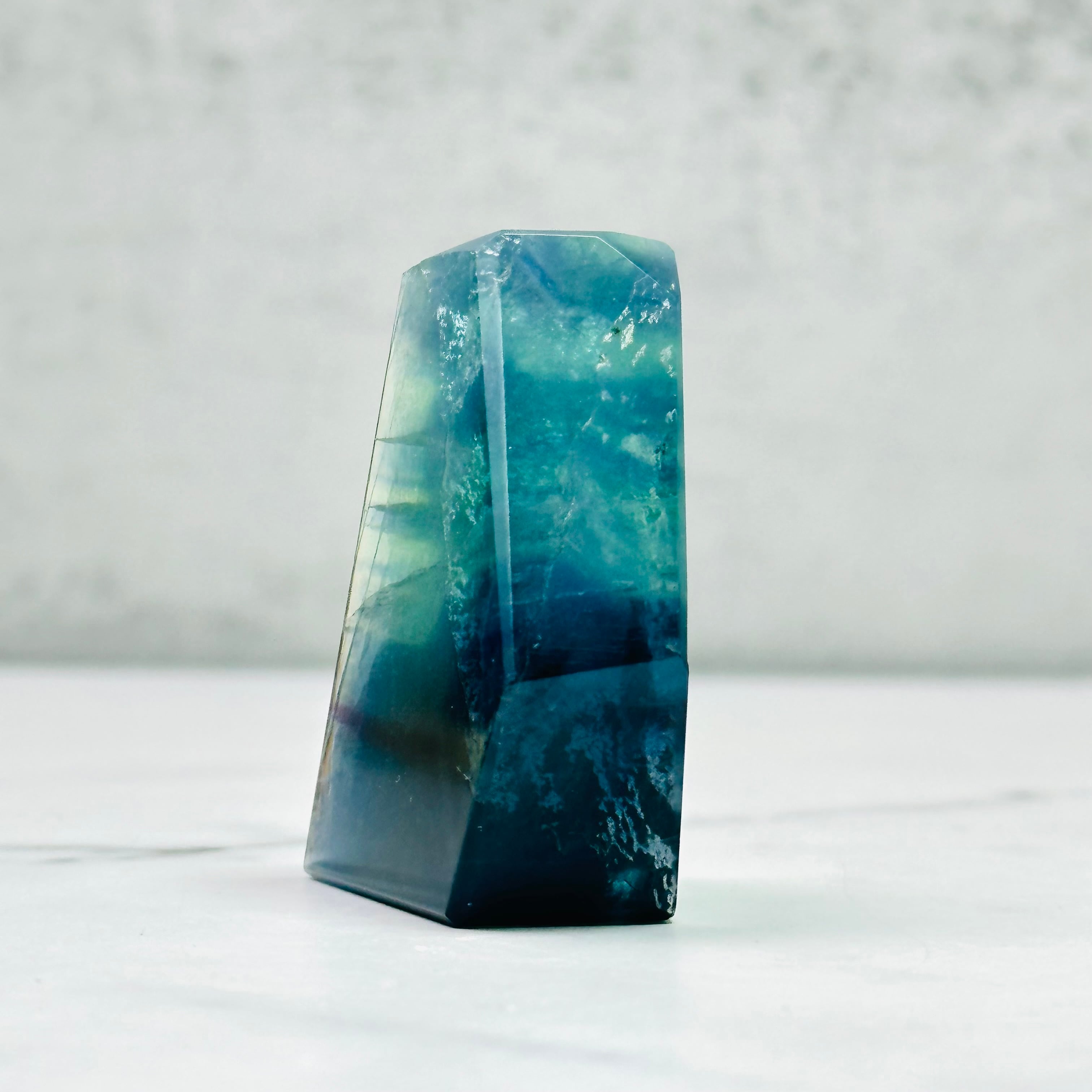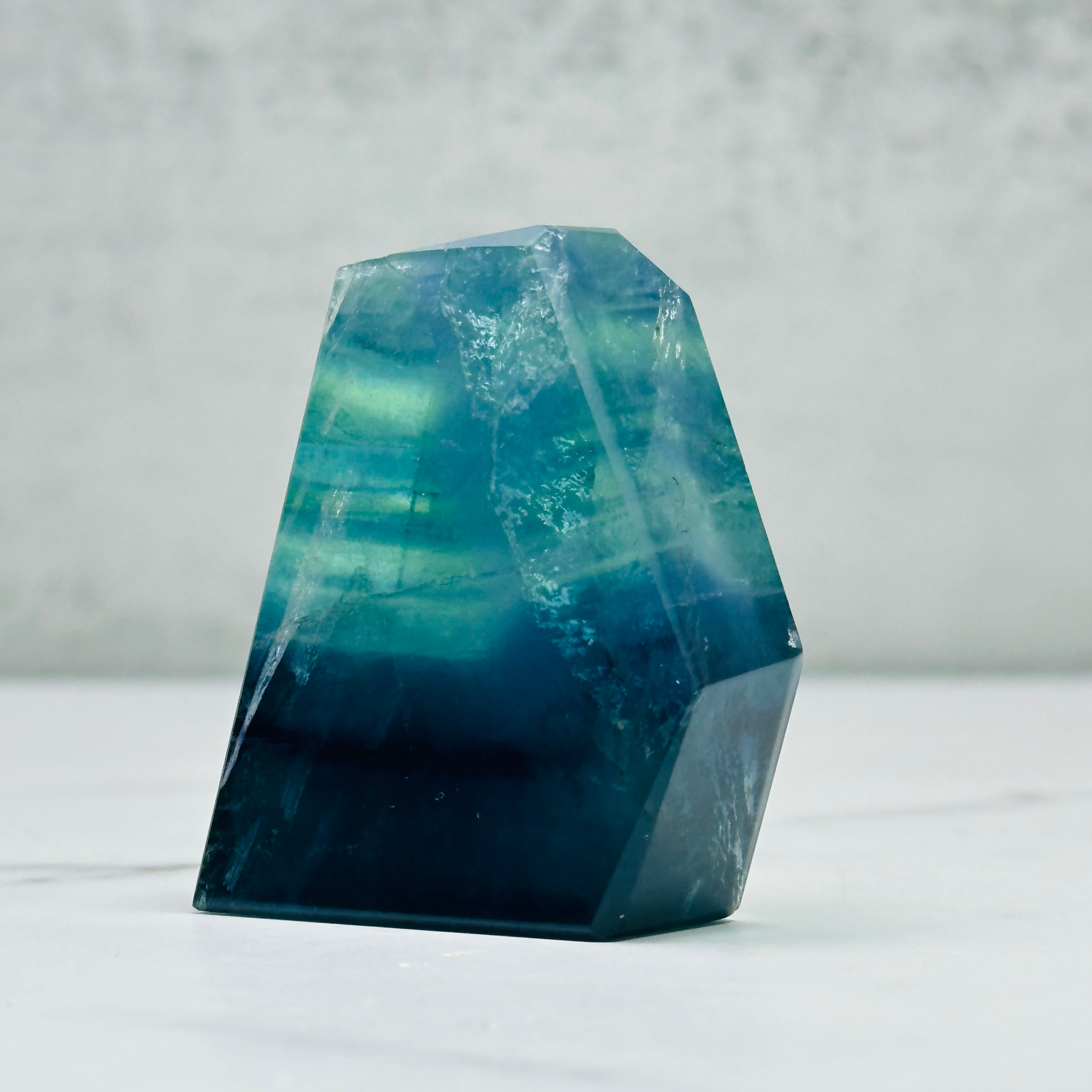 神秘的な色合いが美しいブルーフローライトのフリーフォーム。光の角度や背景によって色の濃淡や輝きが変わり、手に取るたびに違った表情を見せてくれます。飽きずにずっと眺めていられるアイテムです。