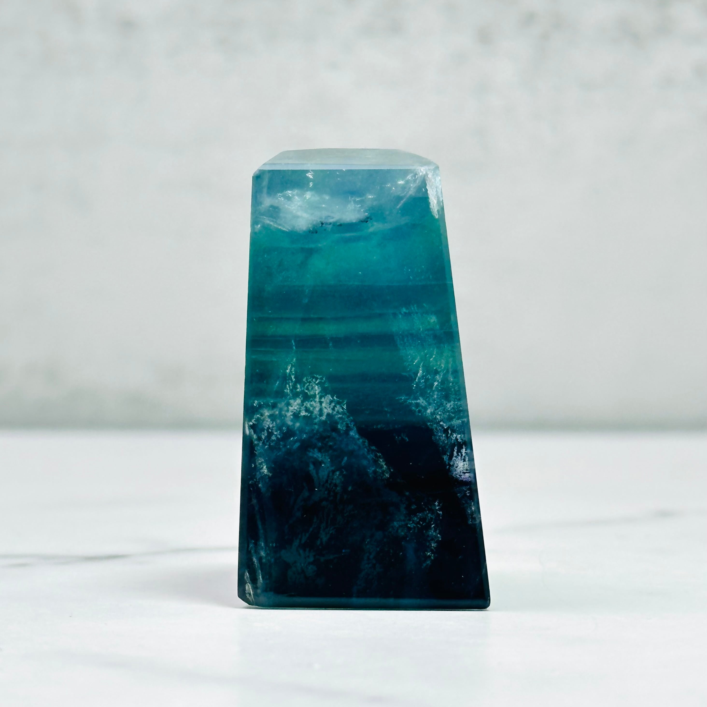 フローライトは「天才の石」とも呼ばれ、集中力や思考の明晰さを高めるとされる天然石です。多彩な色合いと透明感が魅力で、緑・青・紫・無色など、ひとつとして同じ模様や色の組み合わせがありません。現代では癒しやインスピレーションを与えるインテリアストーンとしても人気があります。
