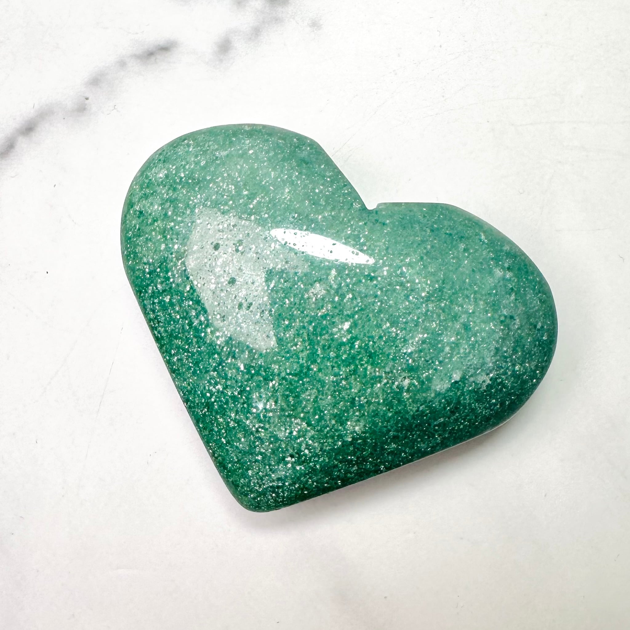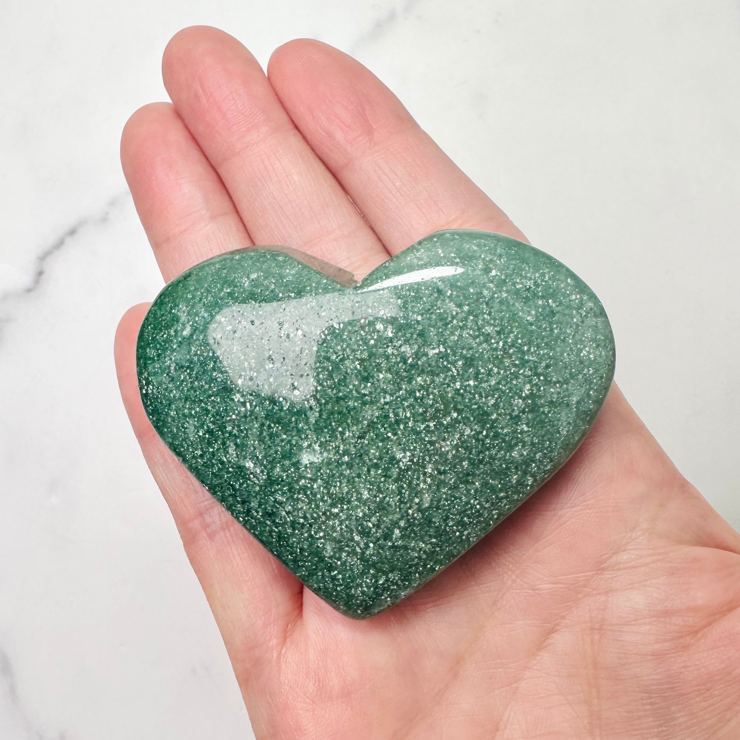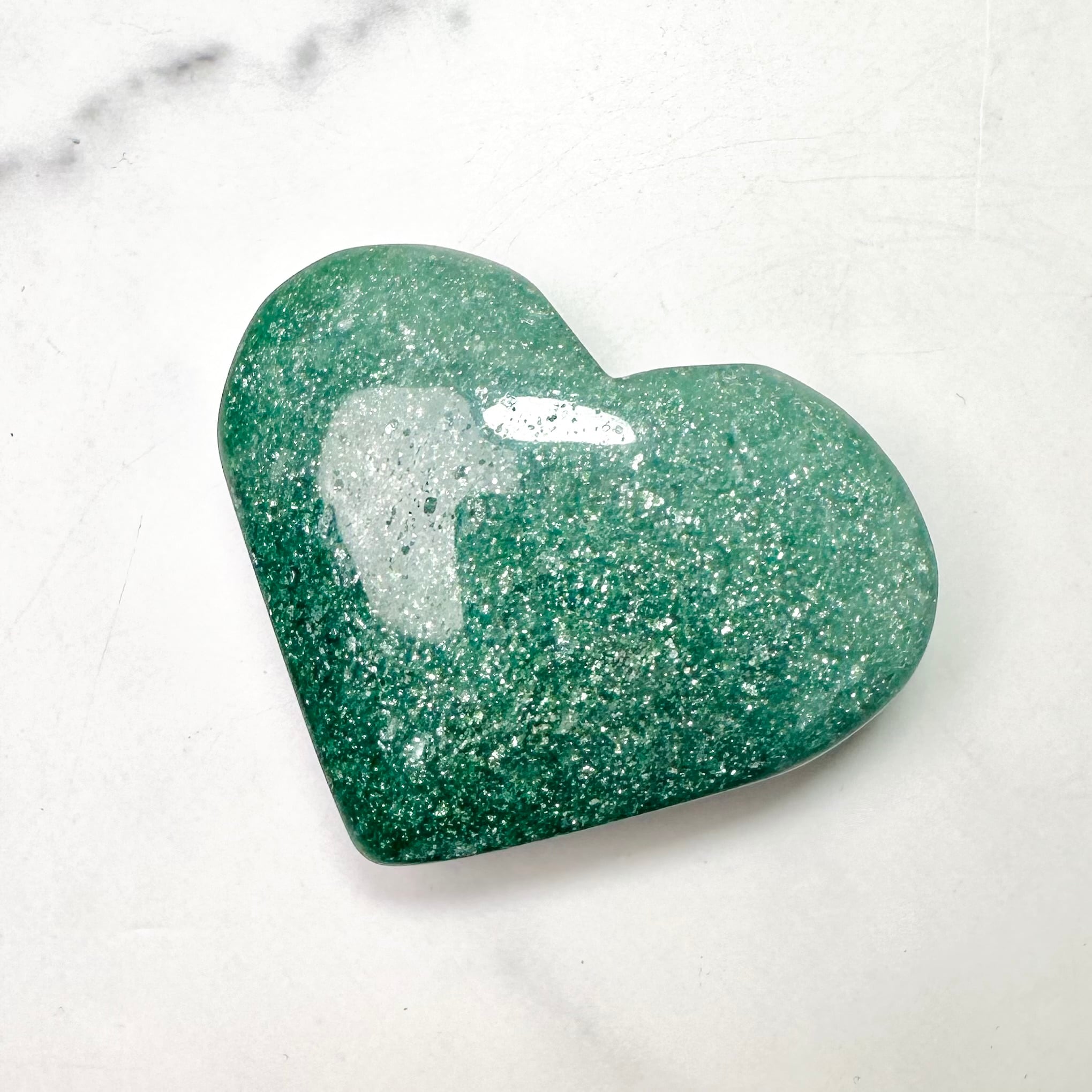 蓬餅のような緑のグリーンストロベリーのハート型ストーン。手のひらに乗せるとじんわりと穏やかな癒しが身体に染み込んでくるようです。無数のラメの煌めきは、吸い込まれるような美しさ。優しさと華やかさが共存する不思議な雰囲気を持つ石です。