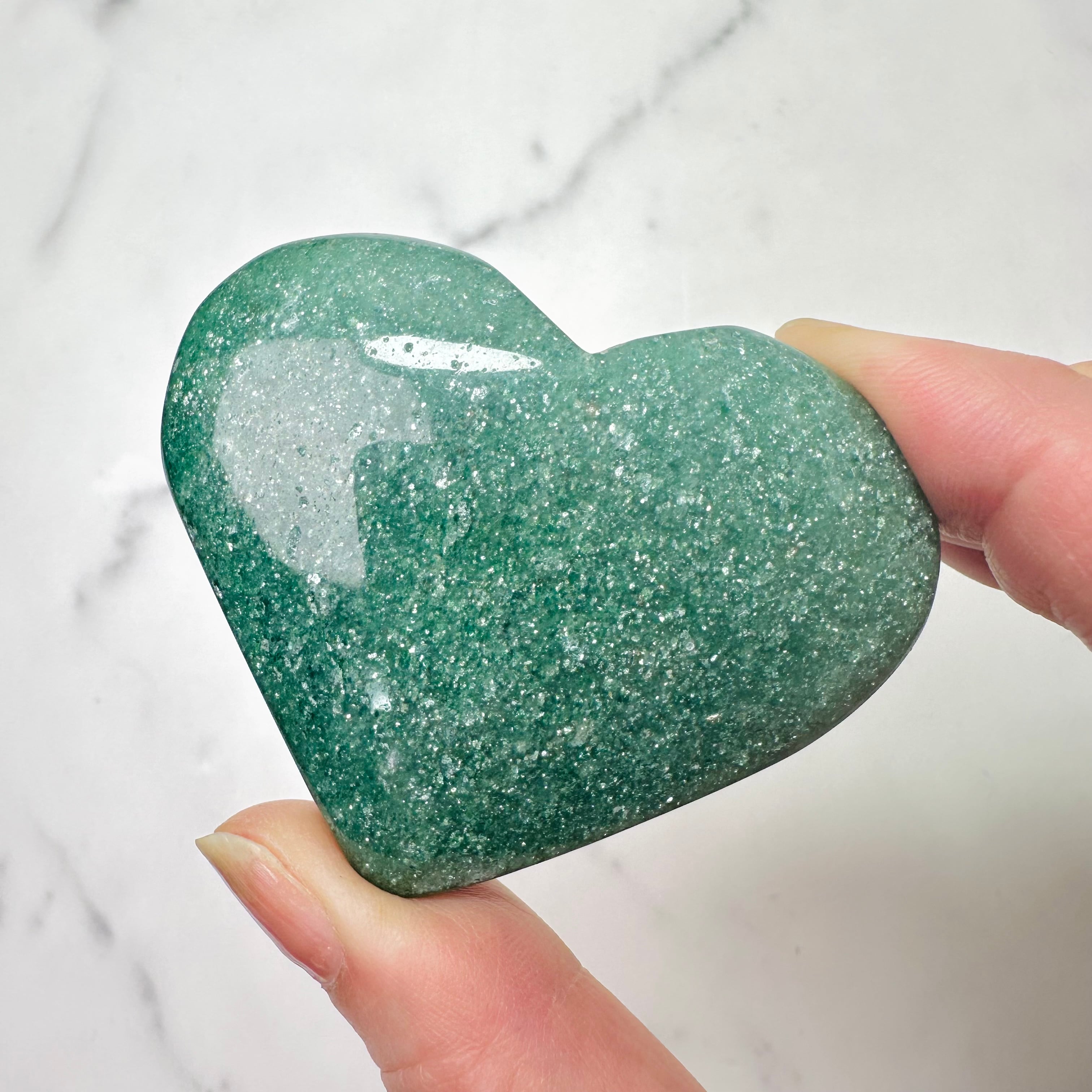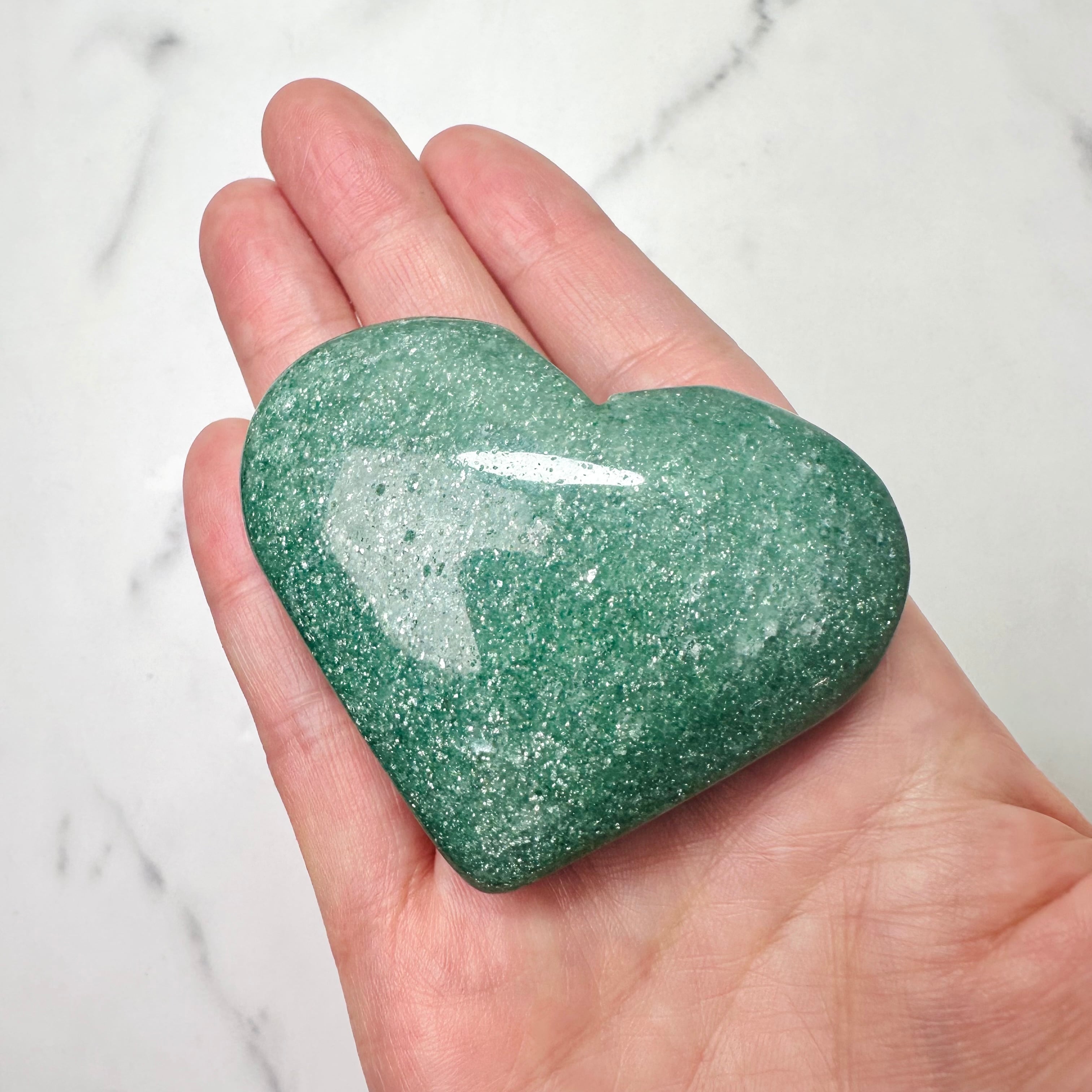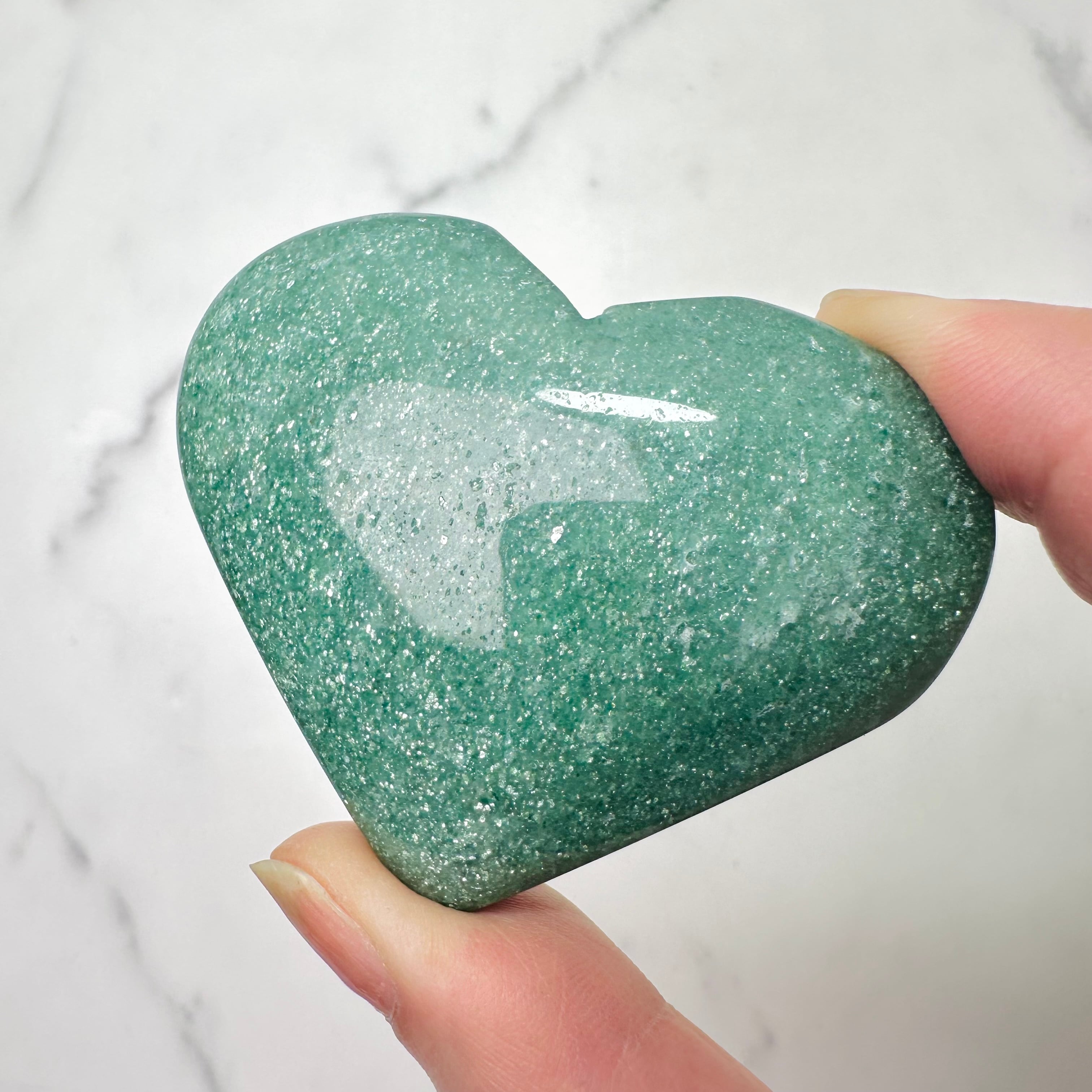 蓬餅のような緑のグリーンストロベリーのハート型ストーン。手のひらに乗せるとじんわりと穏やかな癒しが身体に染み込んでくるようです。無数のラメの煌めきは、吸い込まれるような美しさ。優しさと華やかさが共存する不思議な雰囲気を持つ石です。