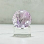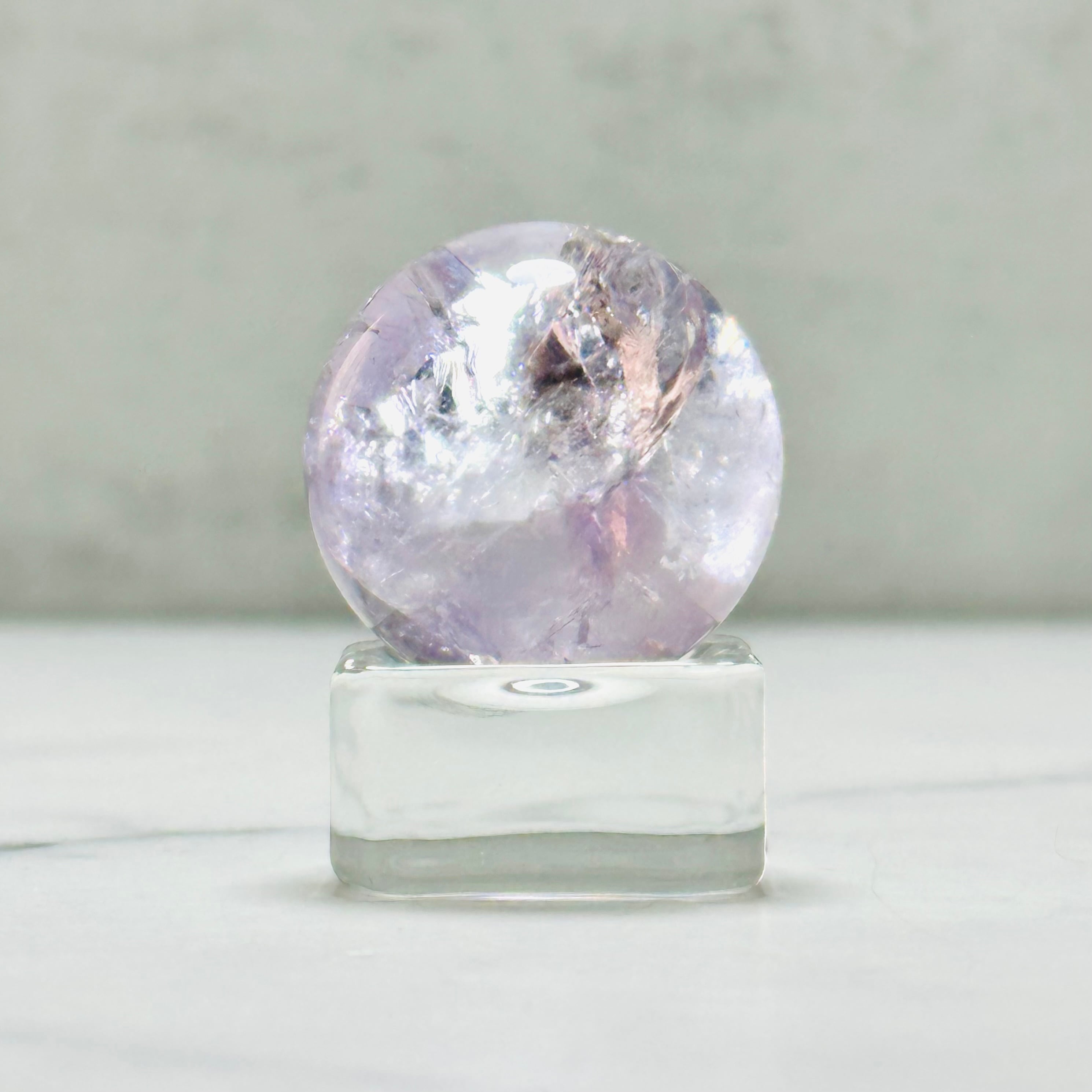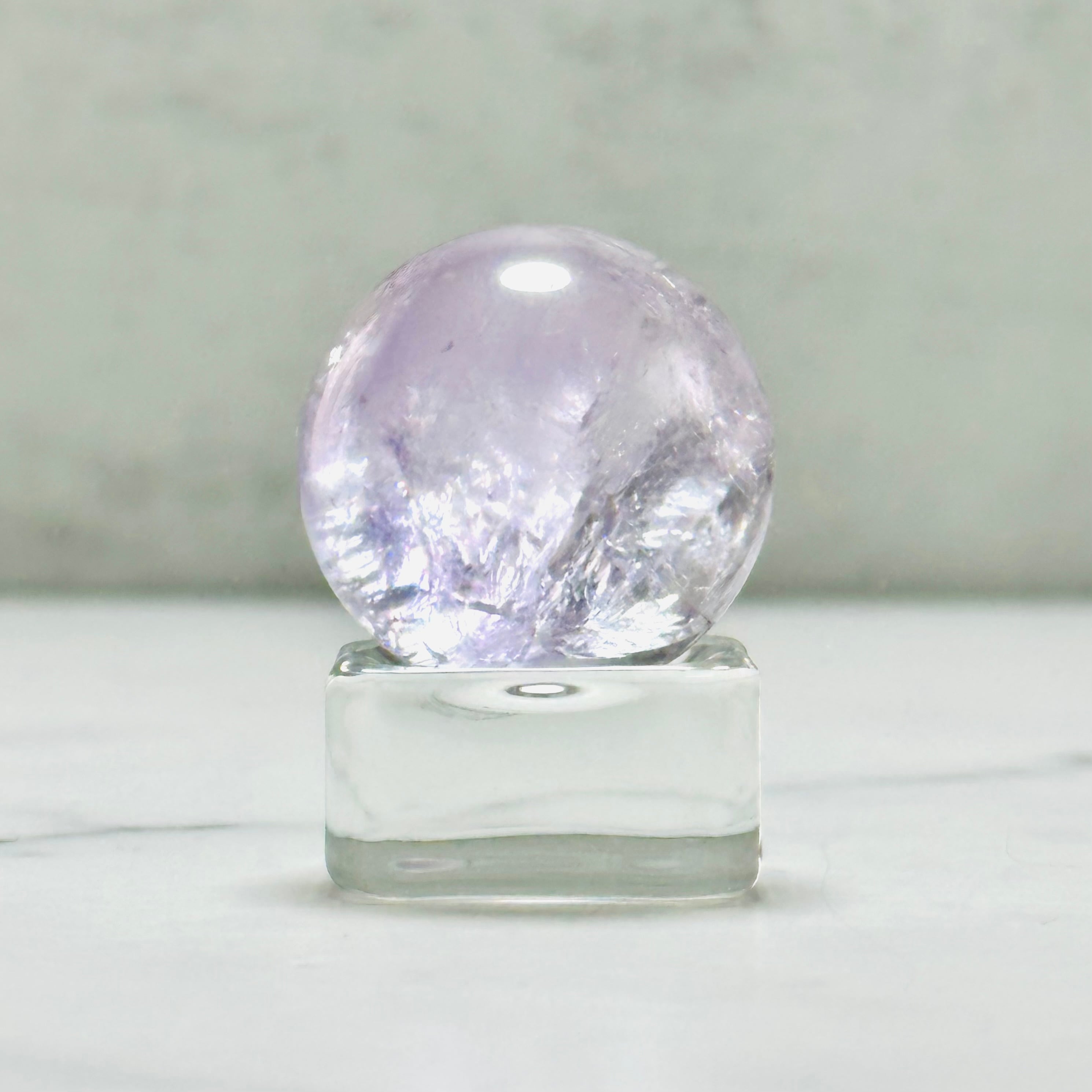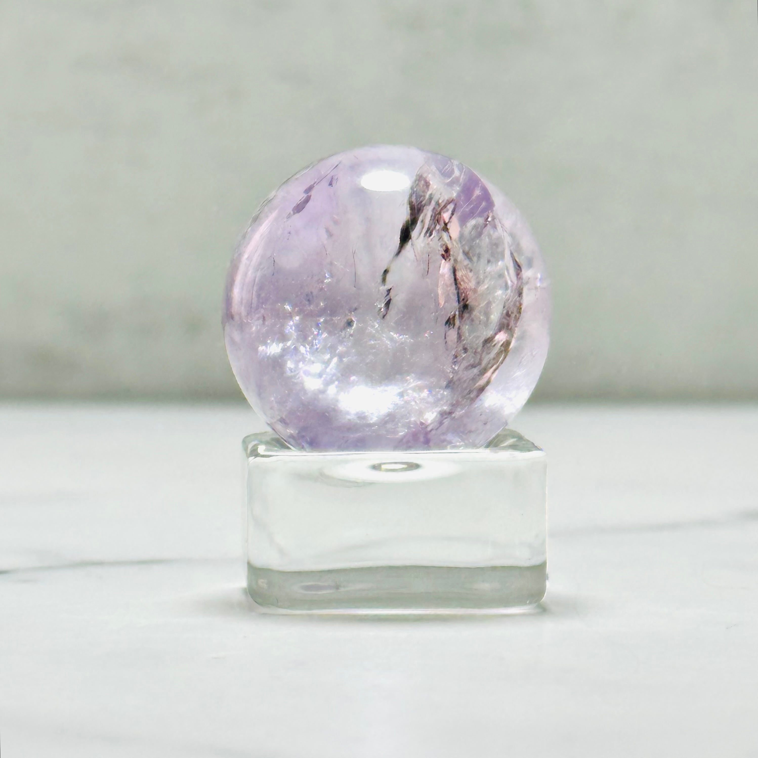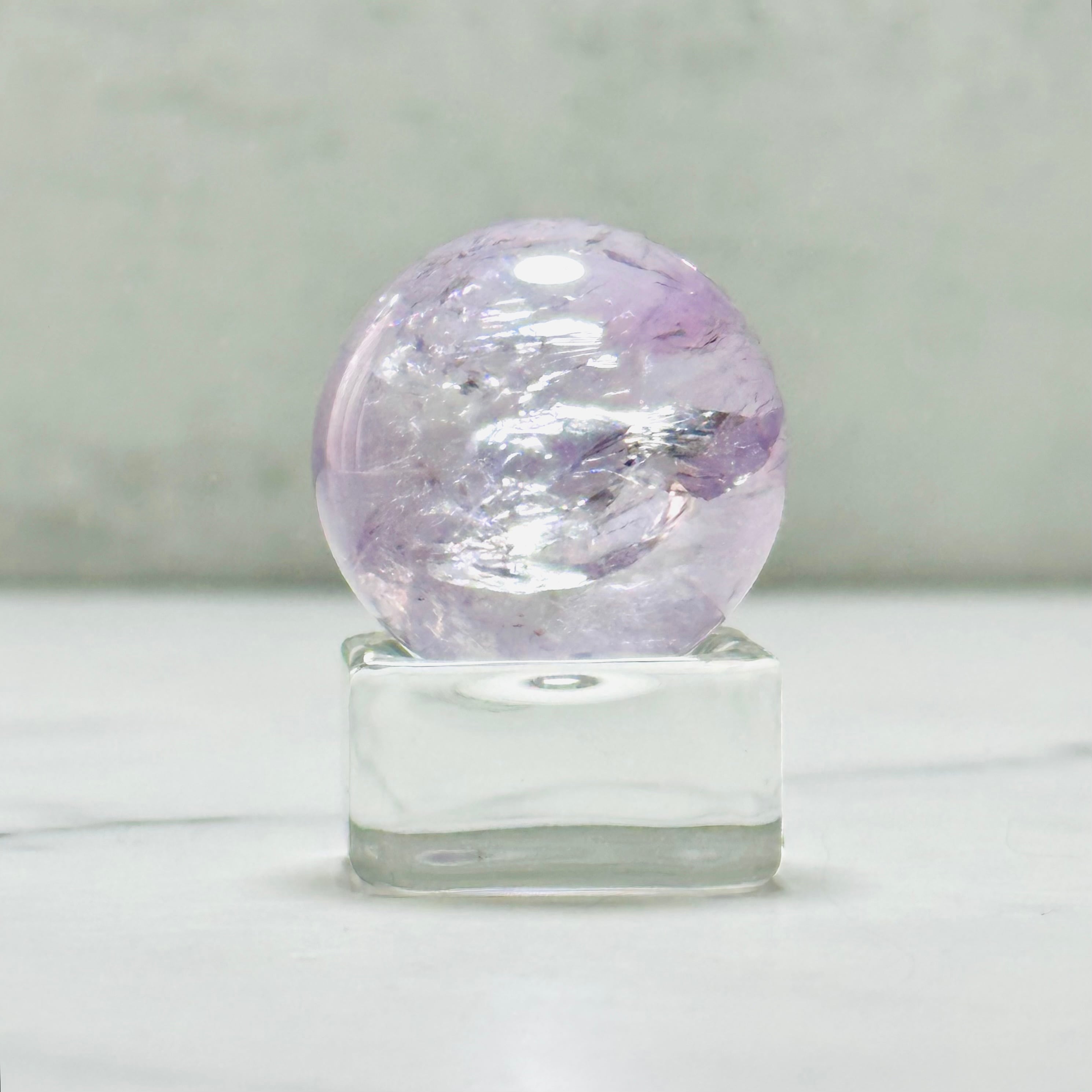 淡い紫がやさしく輝くラベンダーアメジストのミニスフィア。キラキラの虹とやわらかな色合いは、光に透けるとより一層美しく、お部屋を優しい雰囲気に包み込みます。