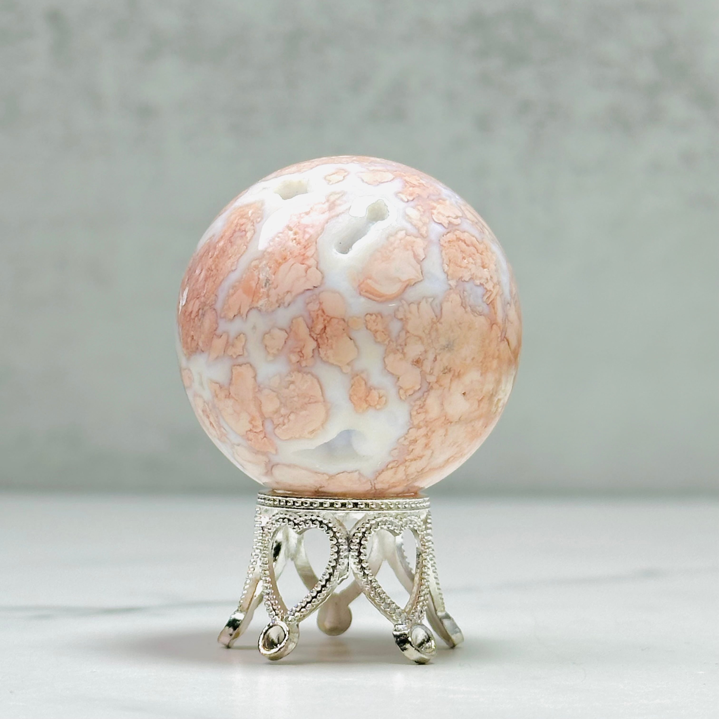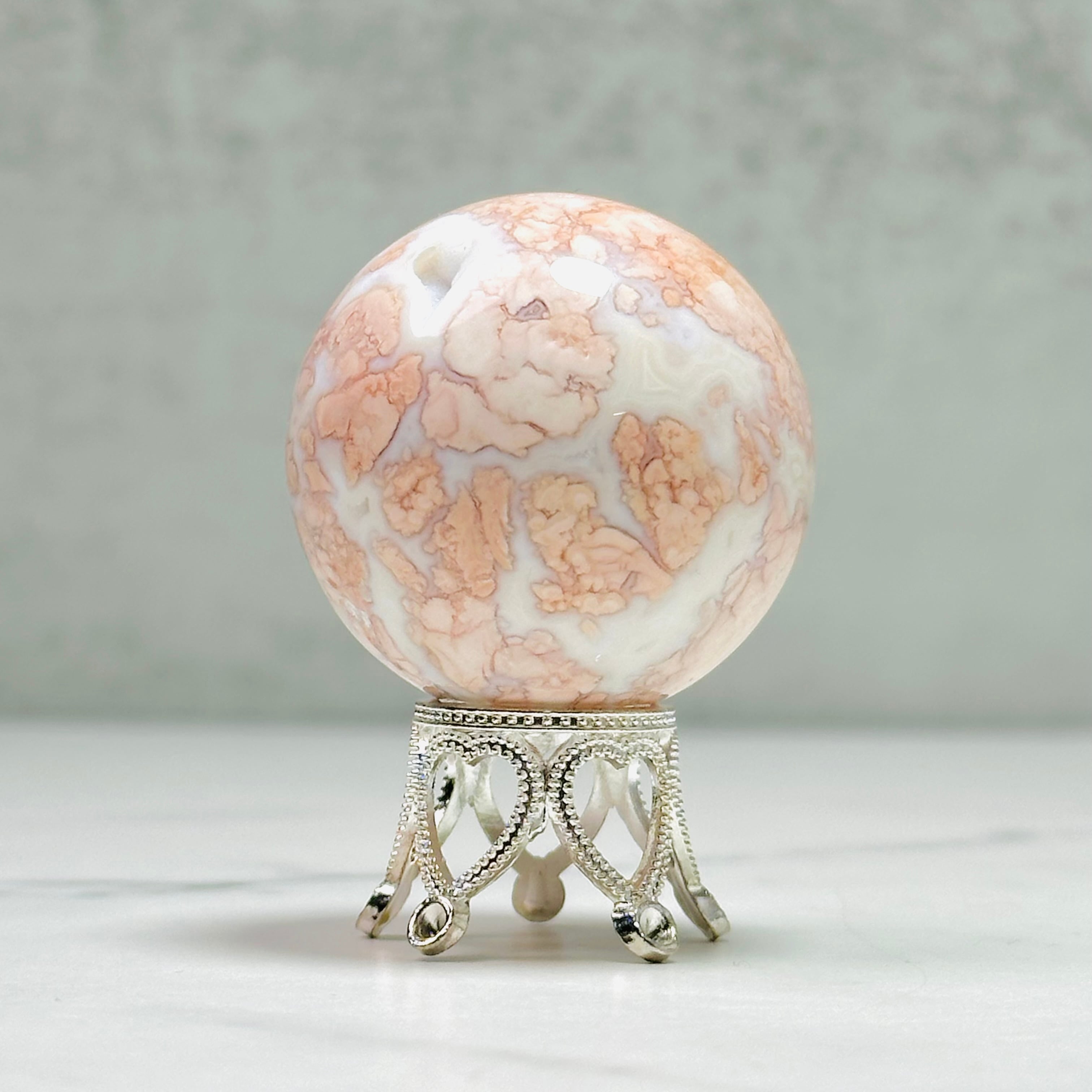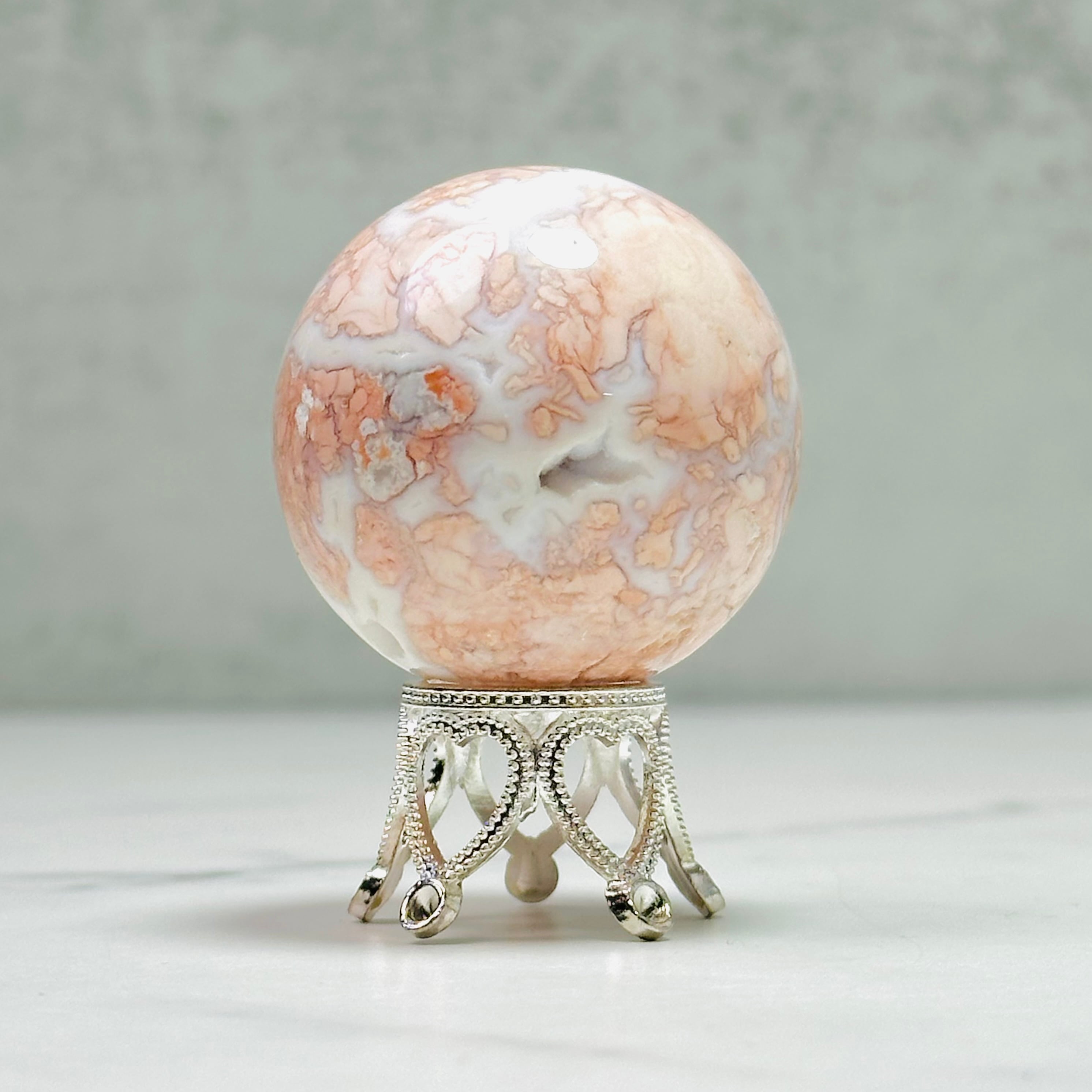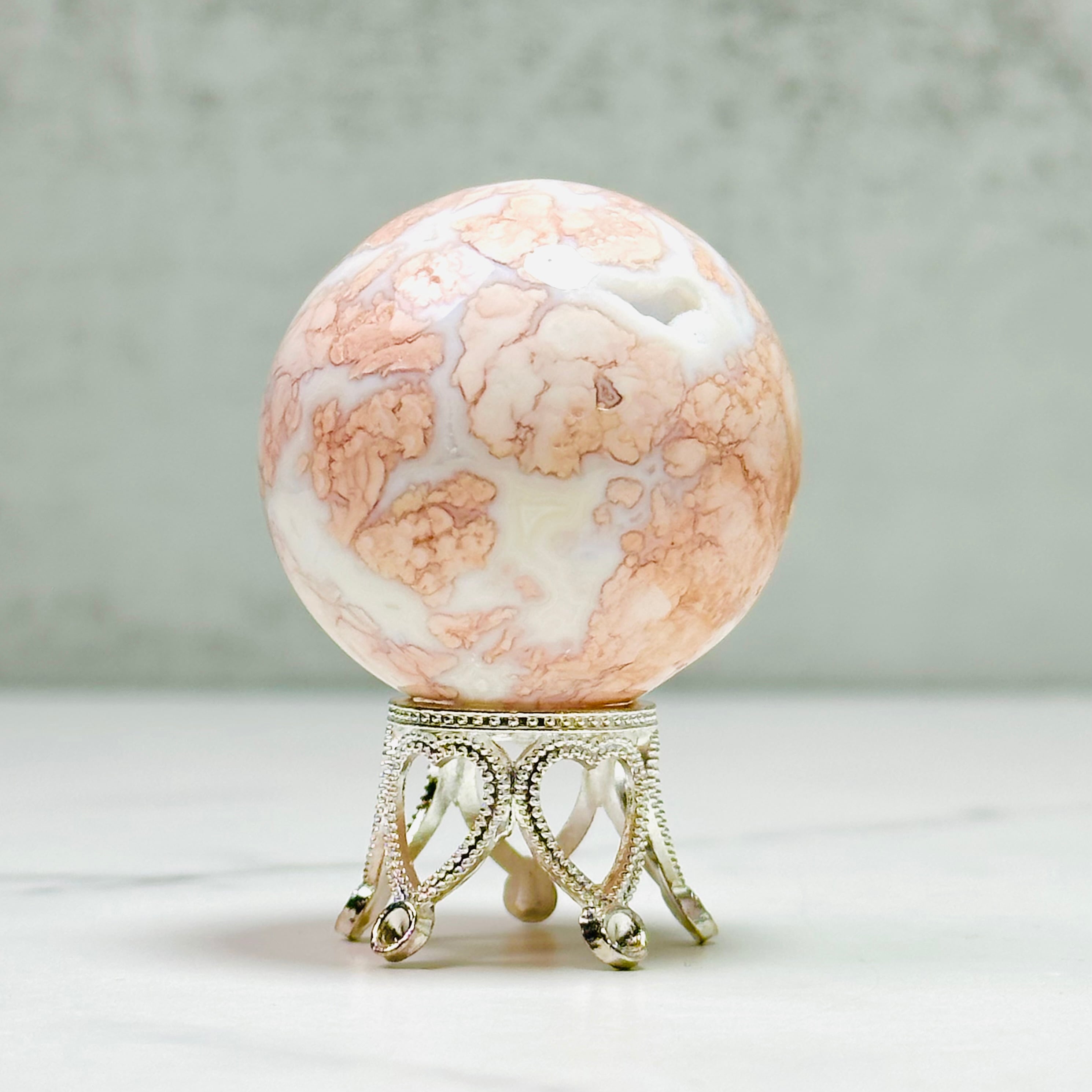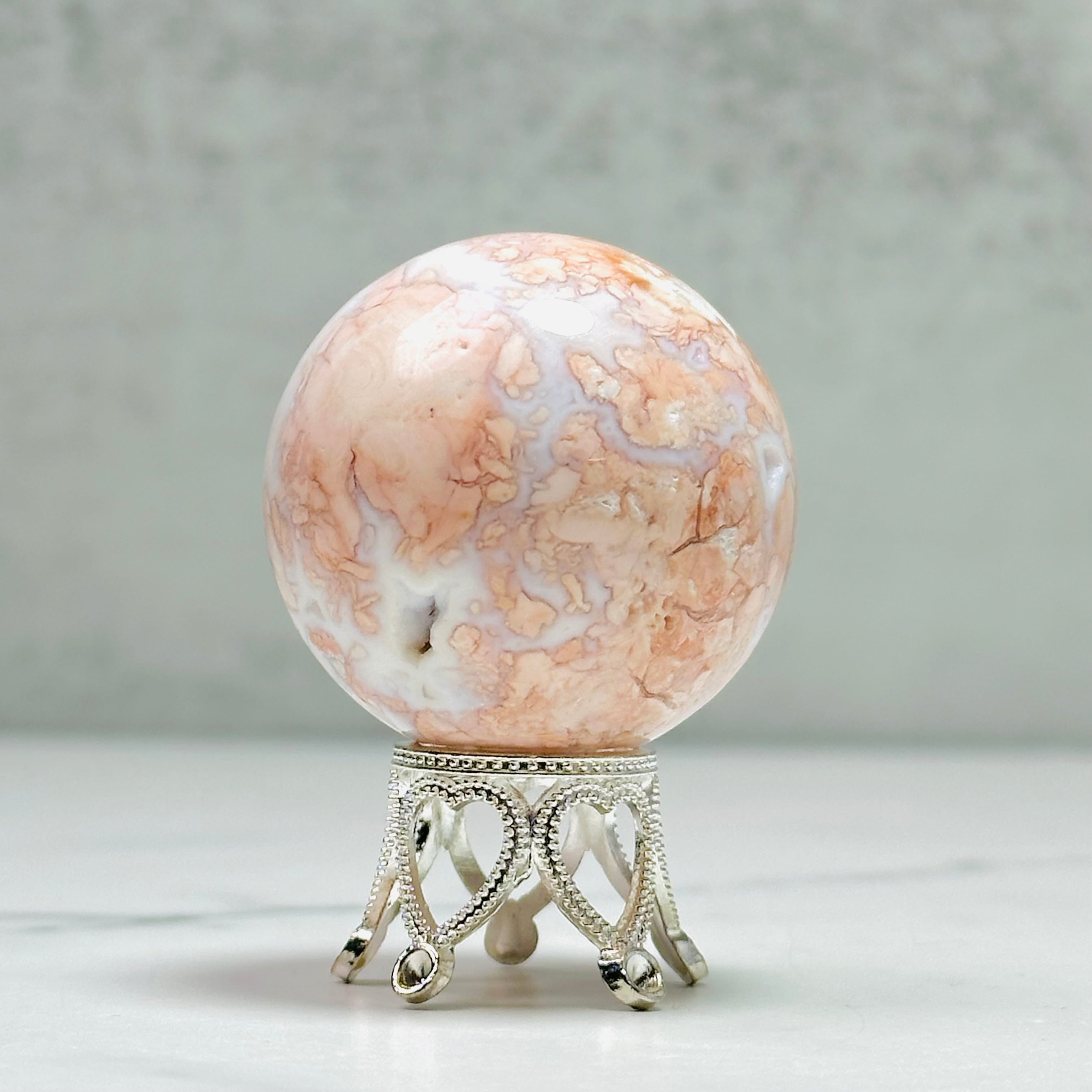 優しいピンクカラーがインテリアを華やかに彩る天然石ピンクアゲートのスフィア。ミルキーな白とピンクの可愛い色合いで、お部屋をふんわりと癒しの空間に変えてくれます。玄関やリビングに置くだけで、毎日の暮らしにほっとするひとときをプラス。大切な方へのギフトにもおすすめです。