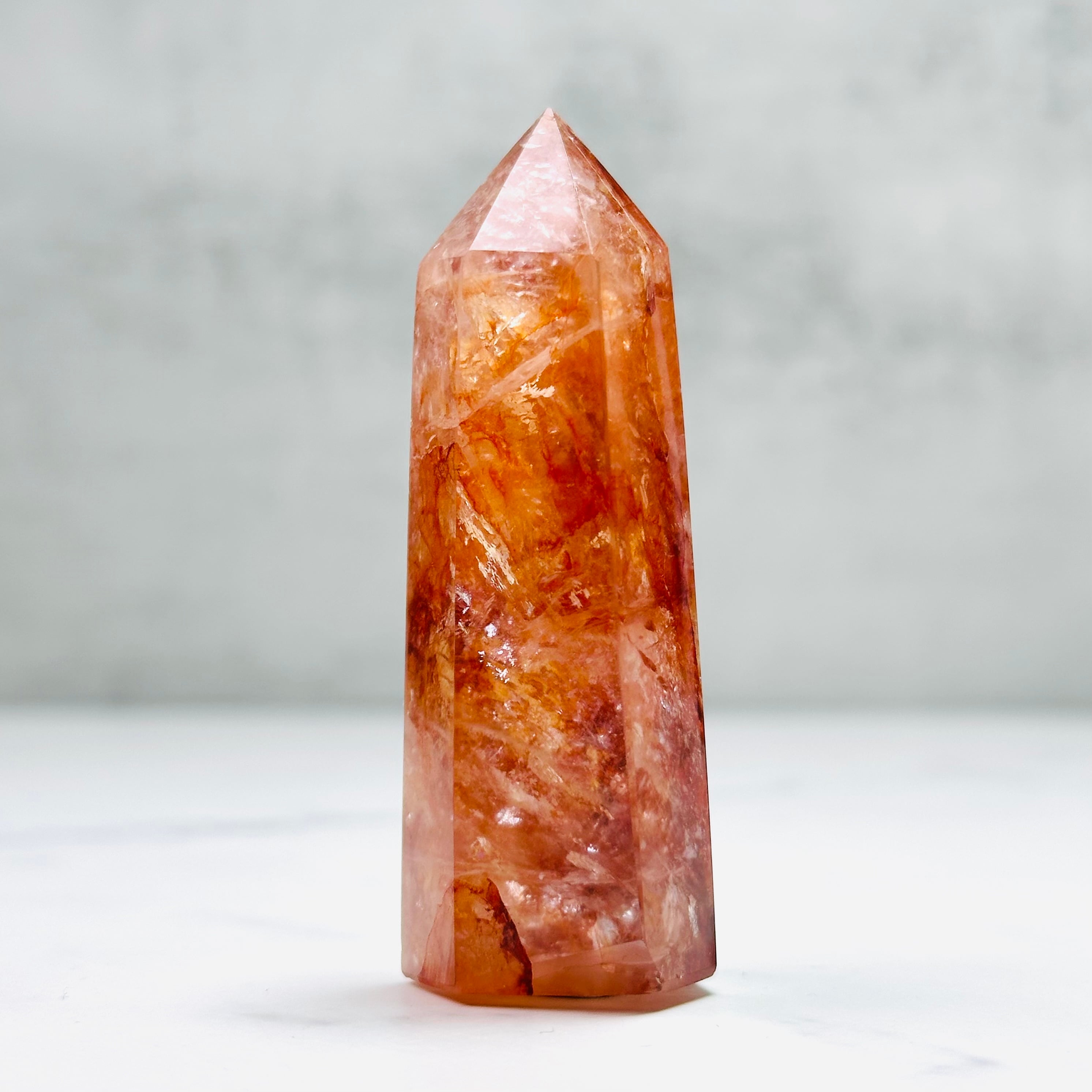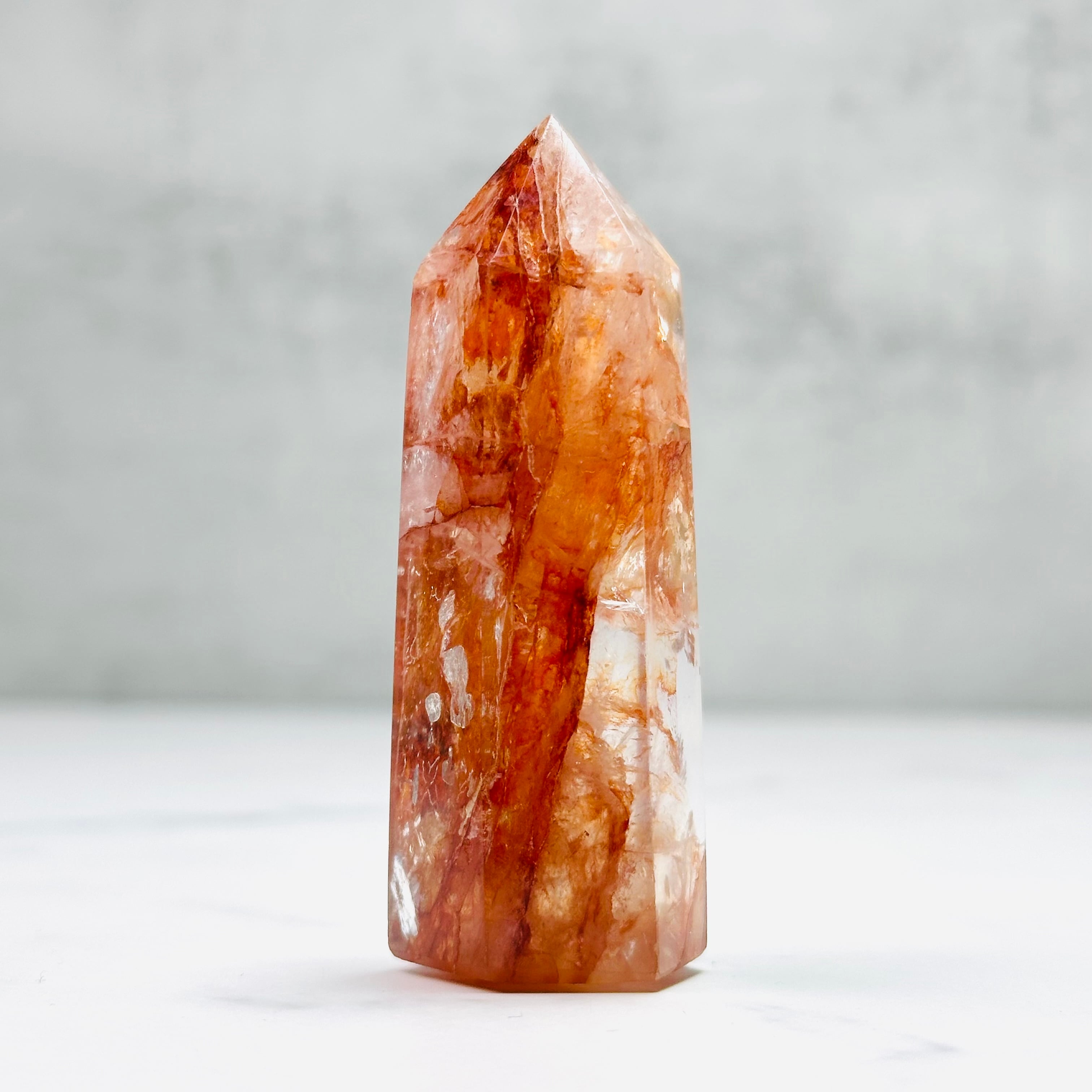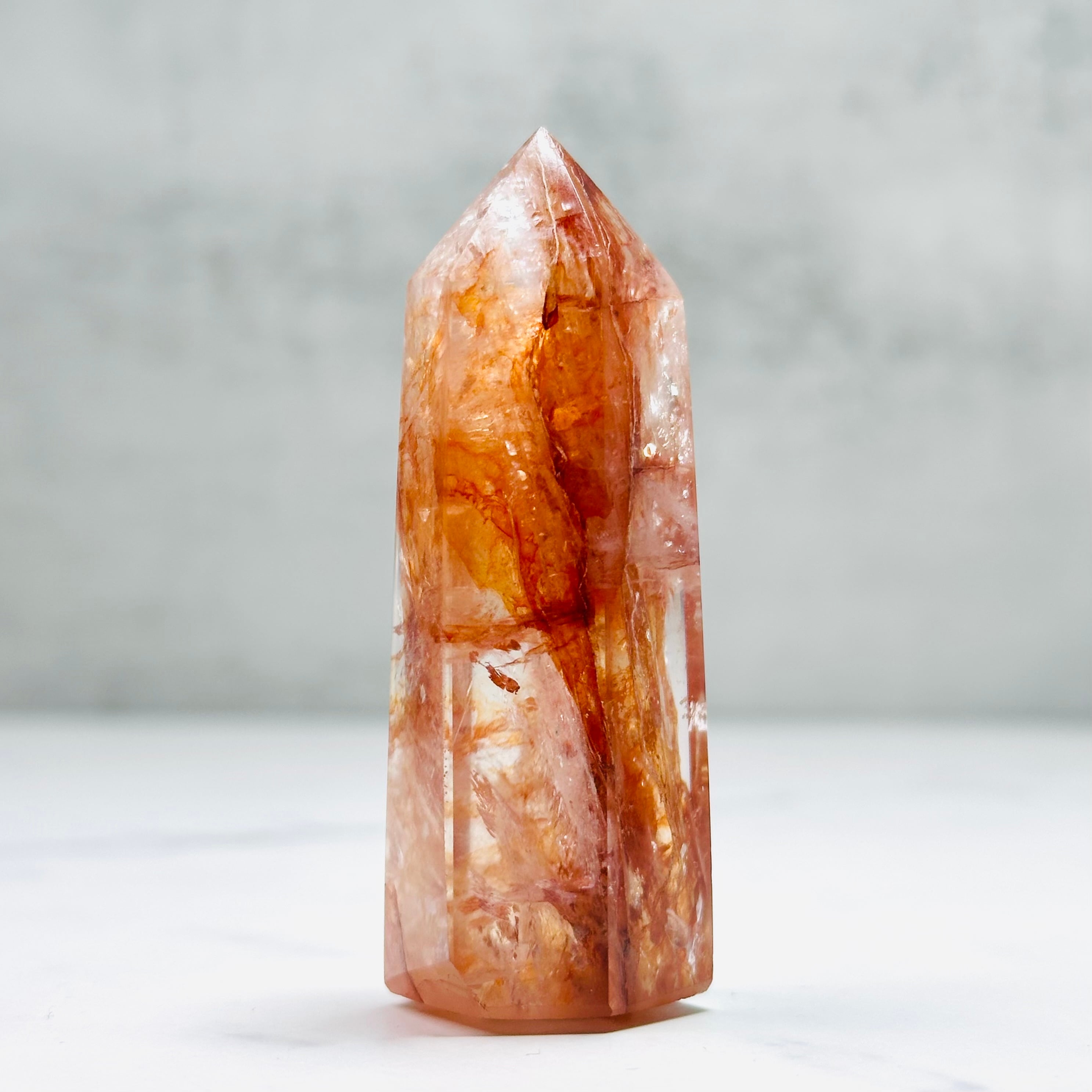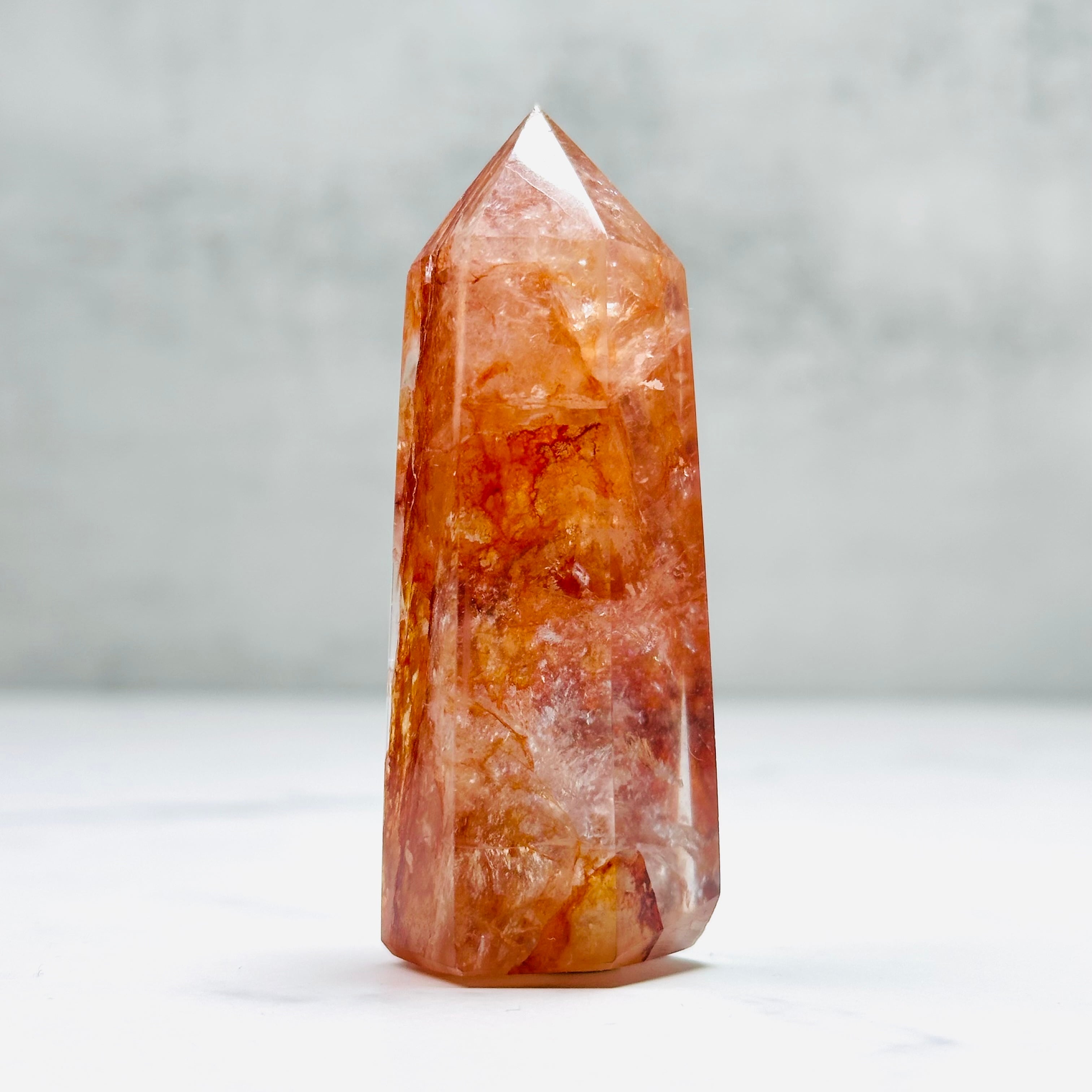 透明な水晶の中に、燃えるような赤やオレンジのインクルージョンが幻想的に広がるファイヤークォーツのタワー。まるで夕焼けを閉じ込めたかのような表情は、一点ものならではの魅力です。見るたびに元気をもらえる、存在感あるインテリアアイテムです。