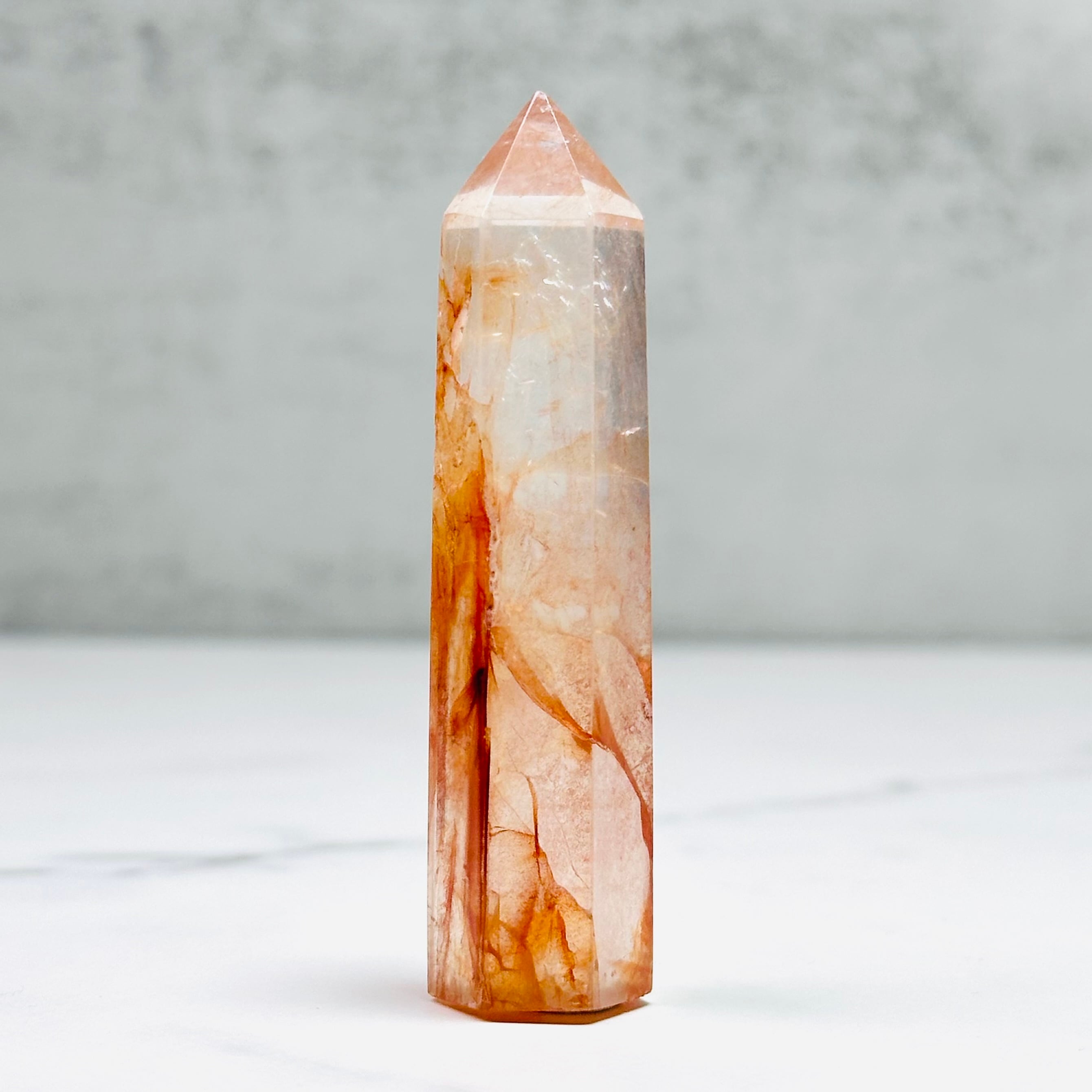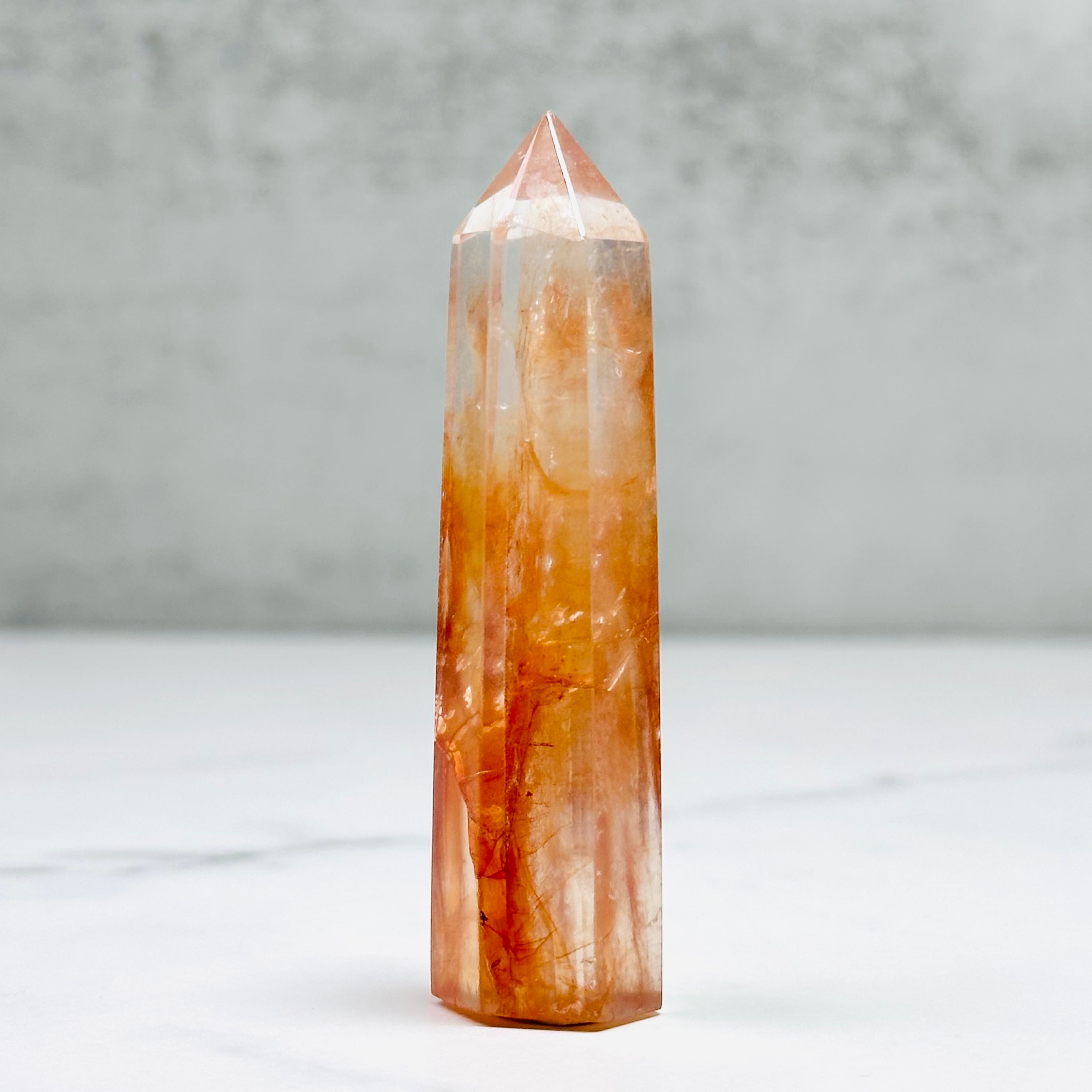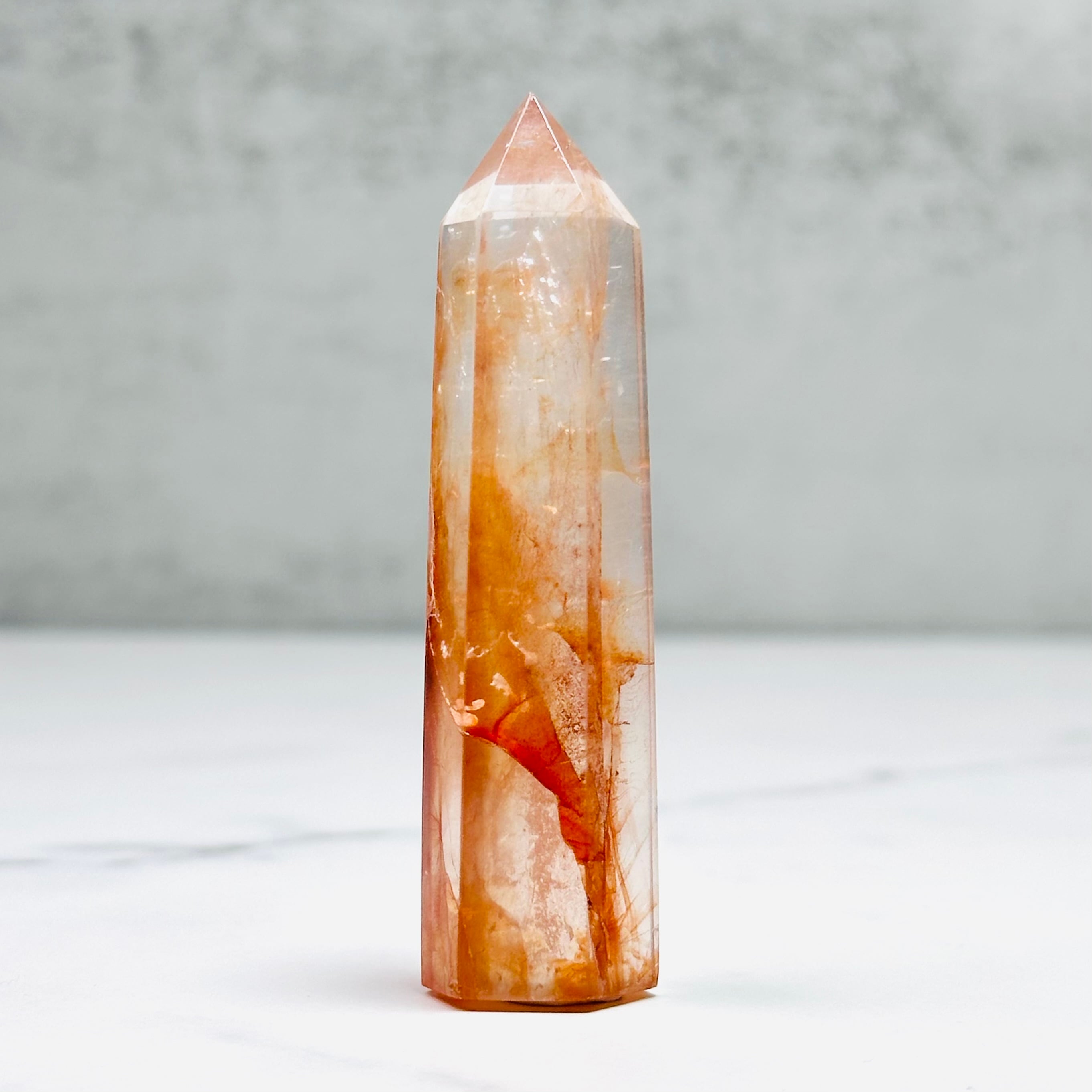 透明な水晶の中に、燃えるような赤やオレンジのインクルージョンが幻想的に広がるファイヤークォーツのタワー。まるで夕焼けを閉じ込めたかのような表情は、一点ものならではの魅力です。見るたびに元気をもらえる、存在感あるインテリアアイテムです。