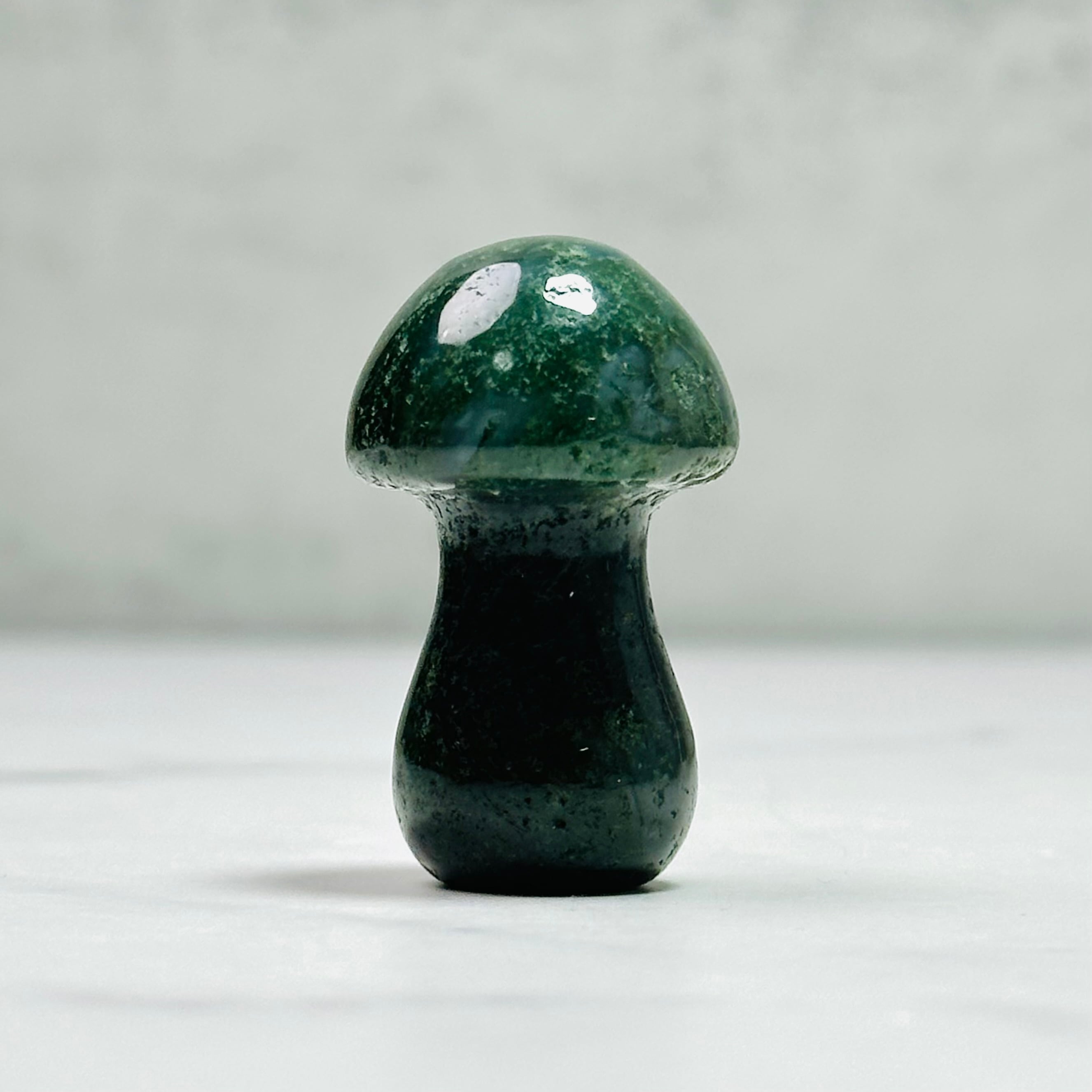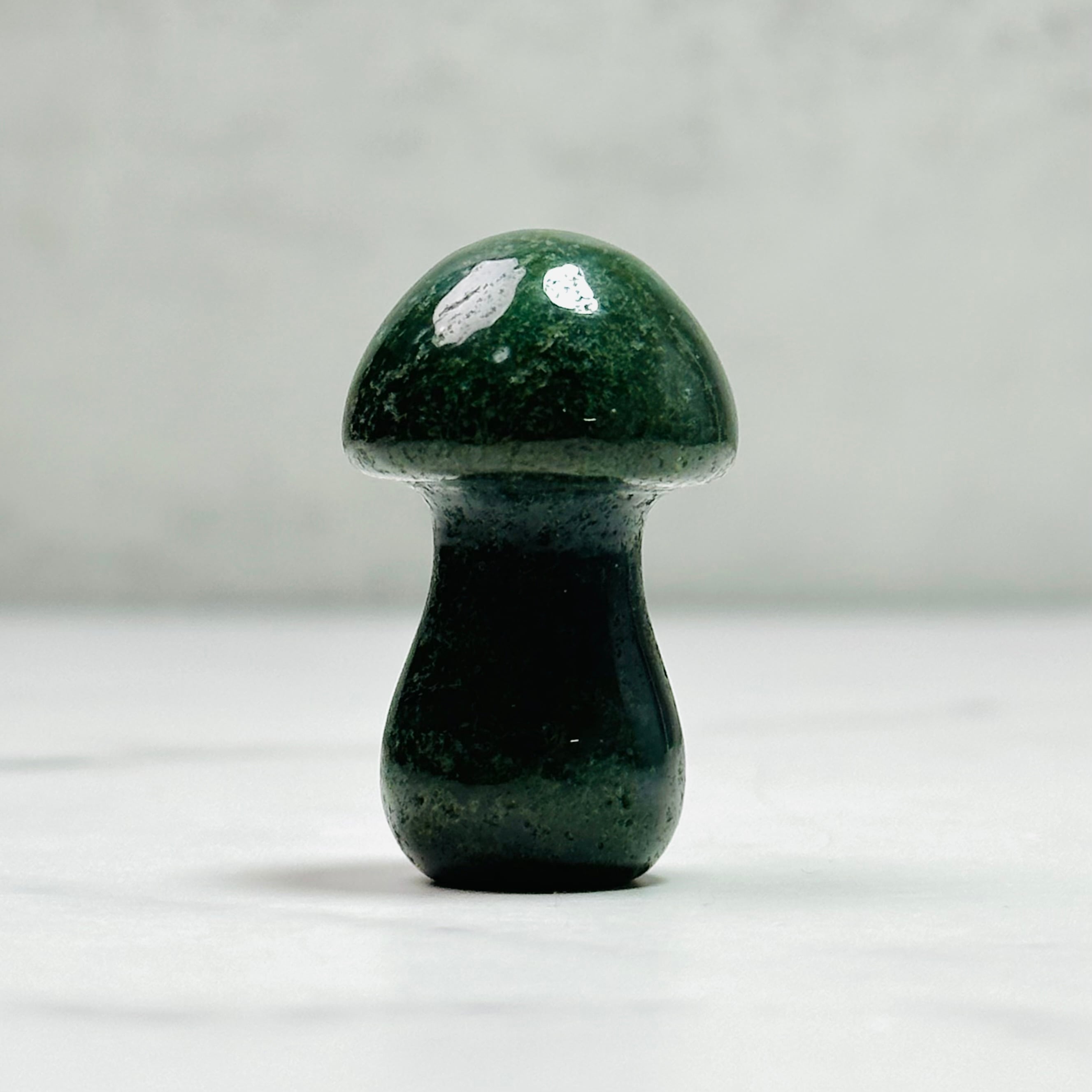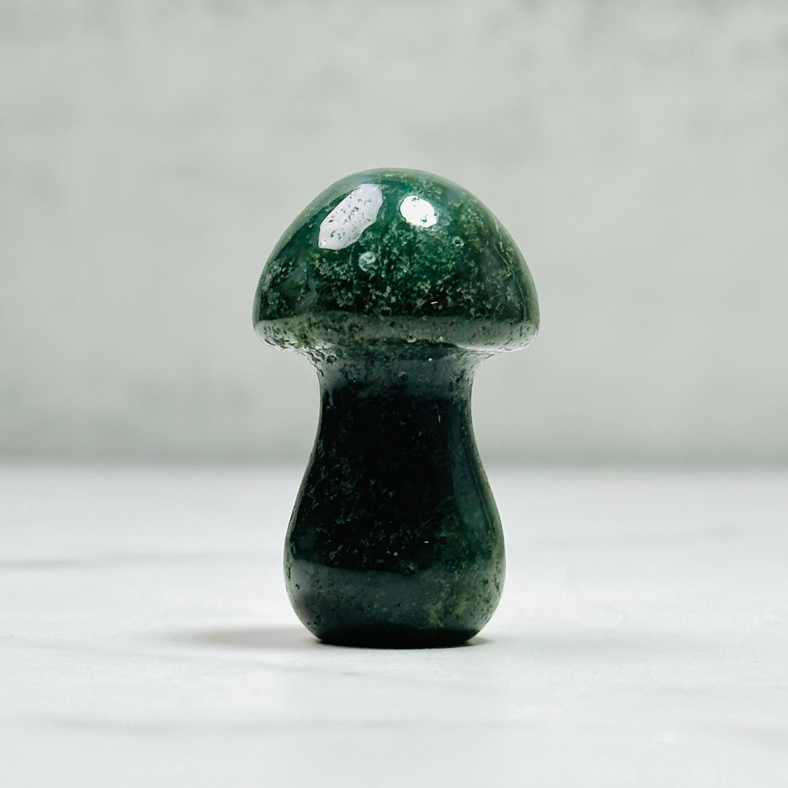 深みのあるモスグリーンの色合いが優しい癒しを届けてくれるモスアゲートのマッシュルーム。動物のカーヴィングやペトリと共に飾ると自然を感じられるナチュラルなインテリアになり、空間をおしゃれに演出します。