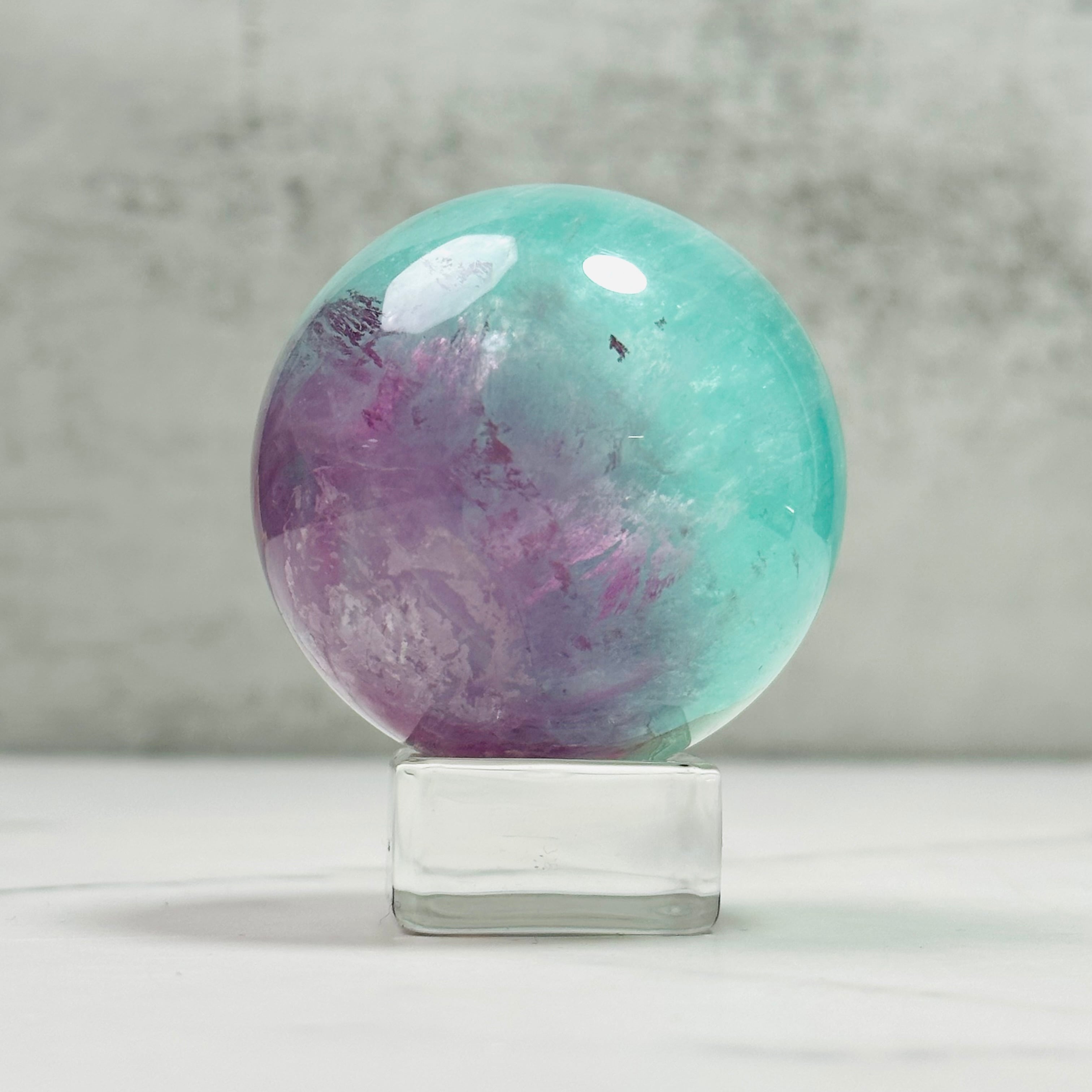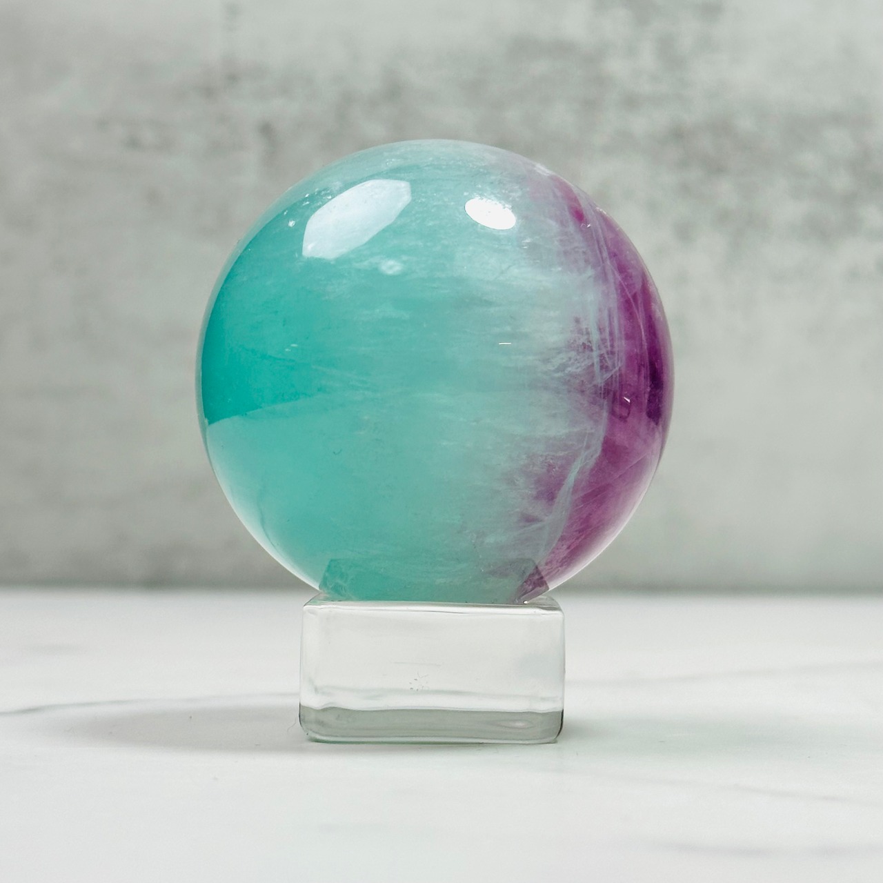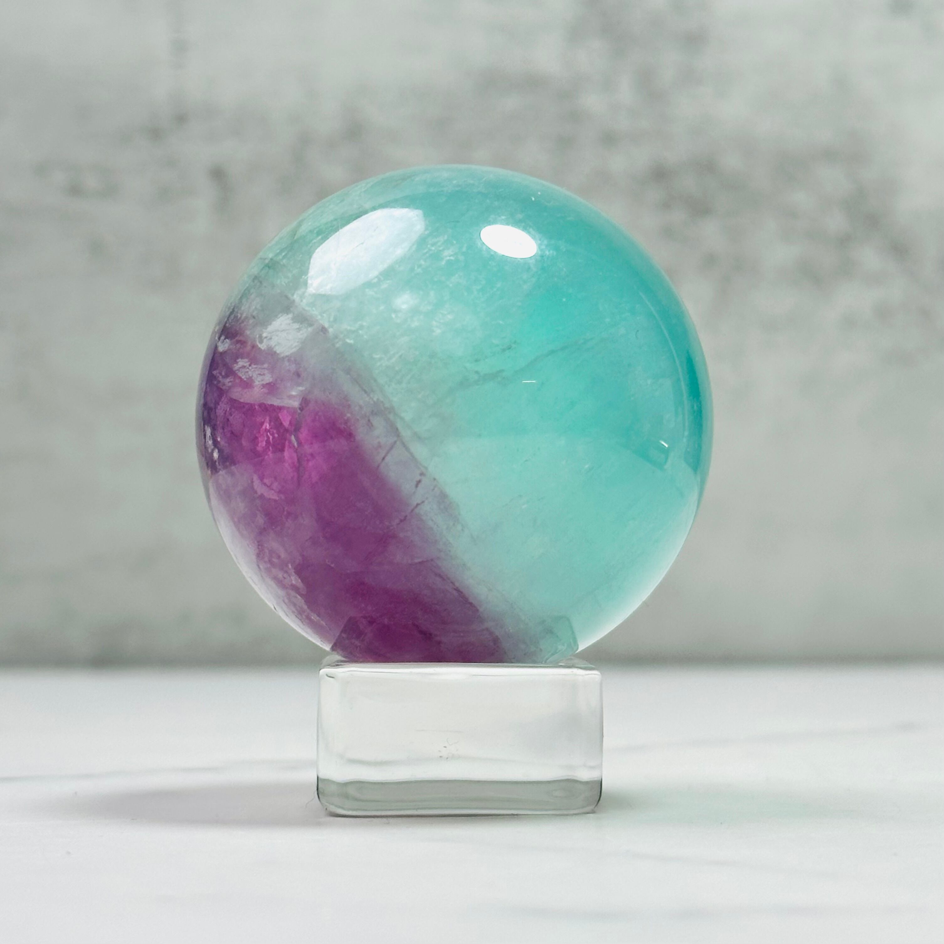 グリーンとパープルのバイカラーが綺麗なウォーターメロンフローライトのスフィアです。ウォーターメロンは英語でスイカのこと。優しい色合いが綺麗で、時間を忘れて見惚れてしまいます。
