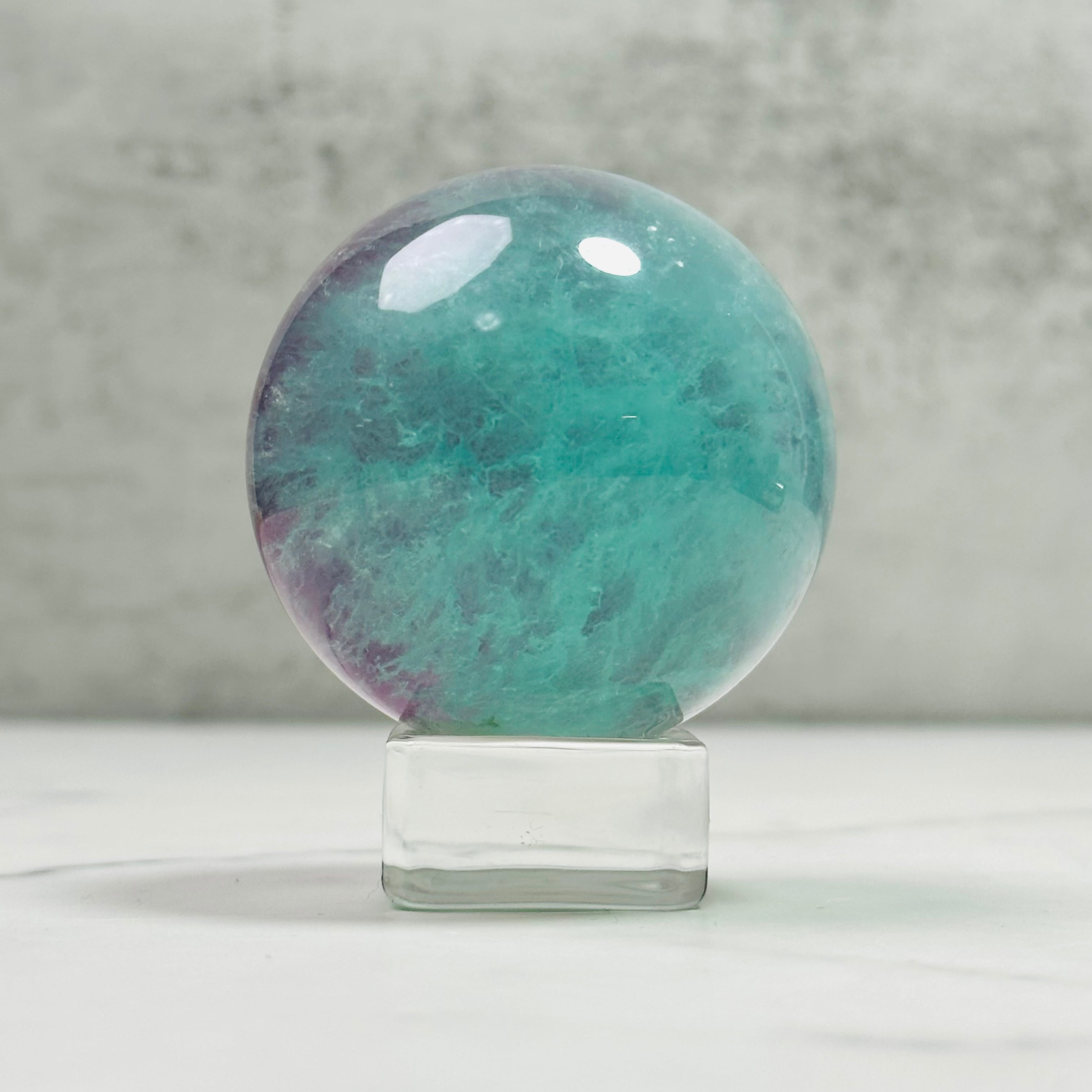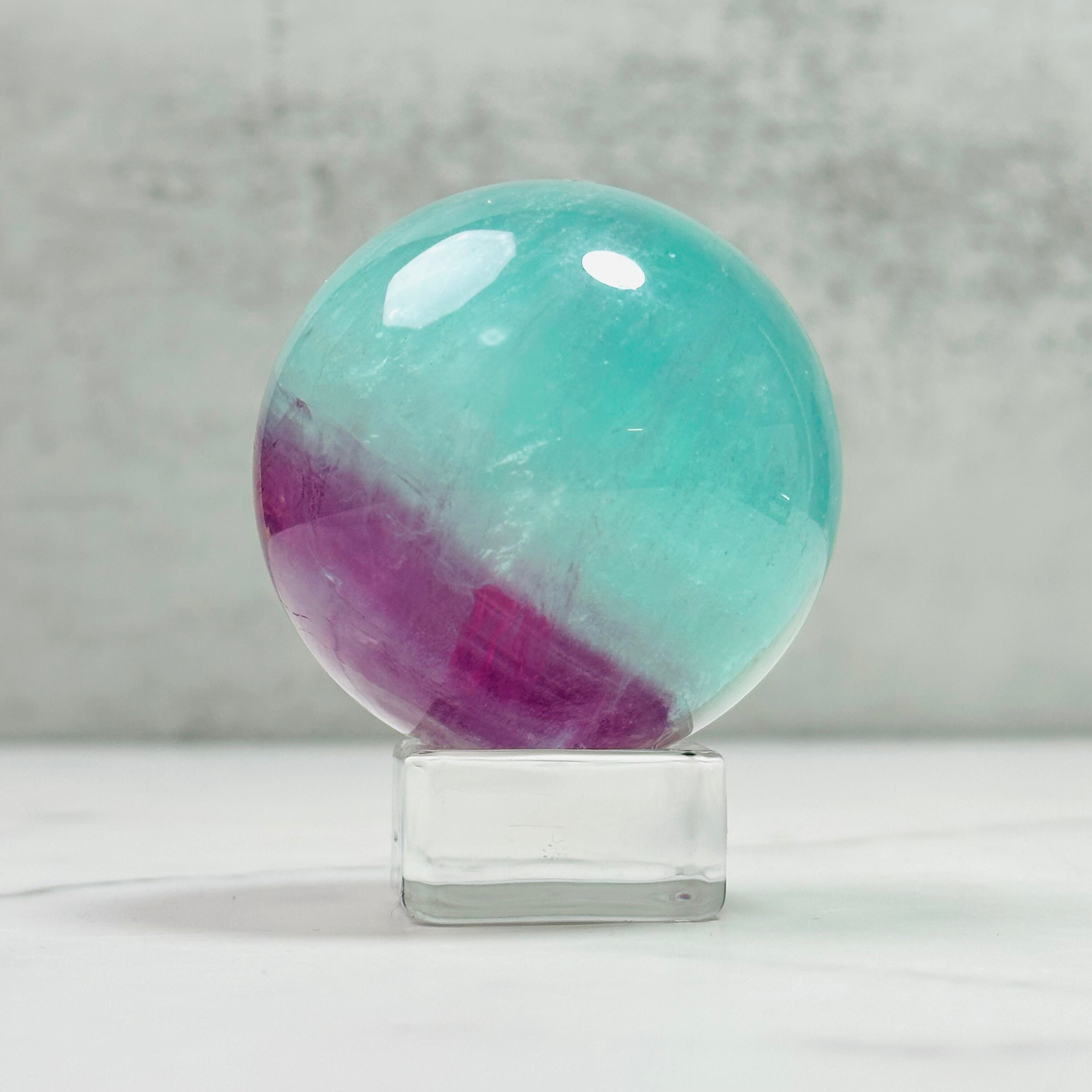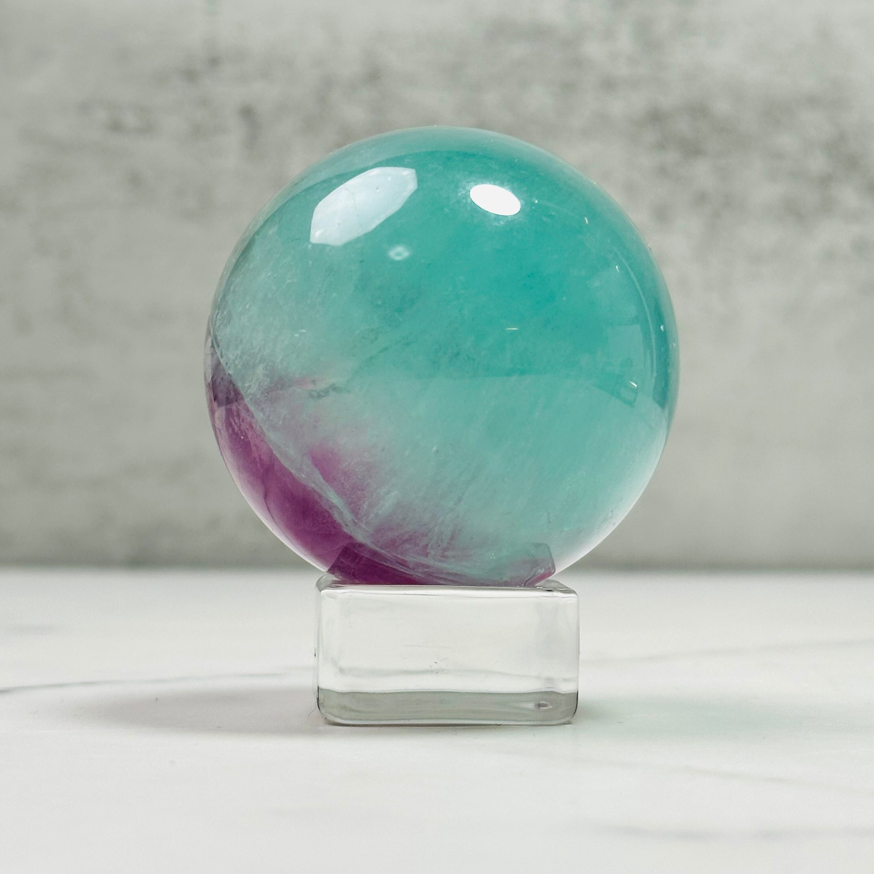 グリーンとパープルのバイカラーが綺麗なウォーターメロンフローライトのスフィアです。ウォーターメロンは英語でスイカのこと。優しい色合いが綺麗で、時間を忘れて見惚れてしまいます。