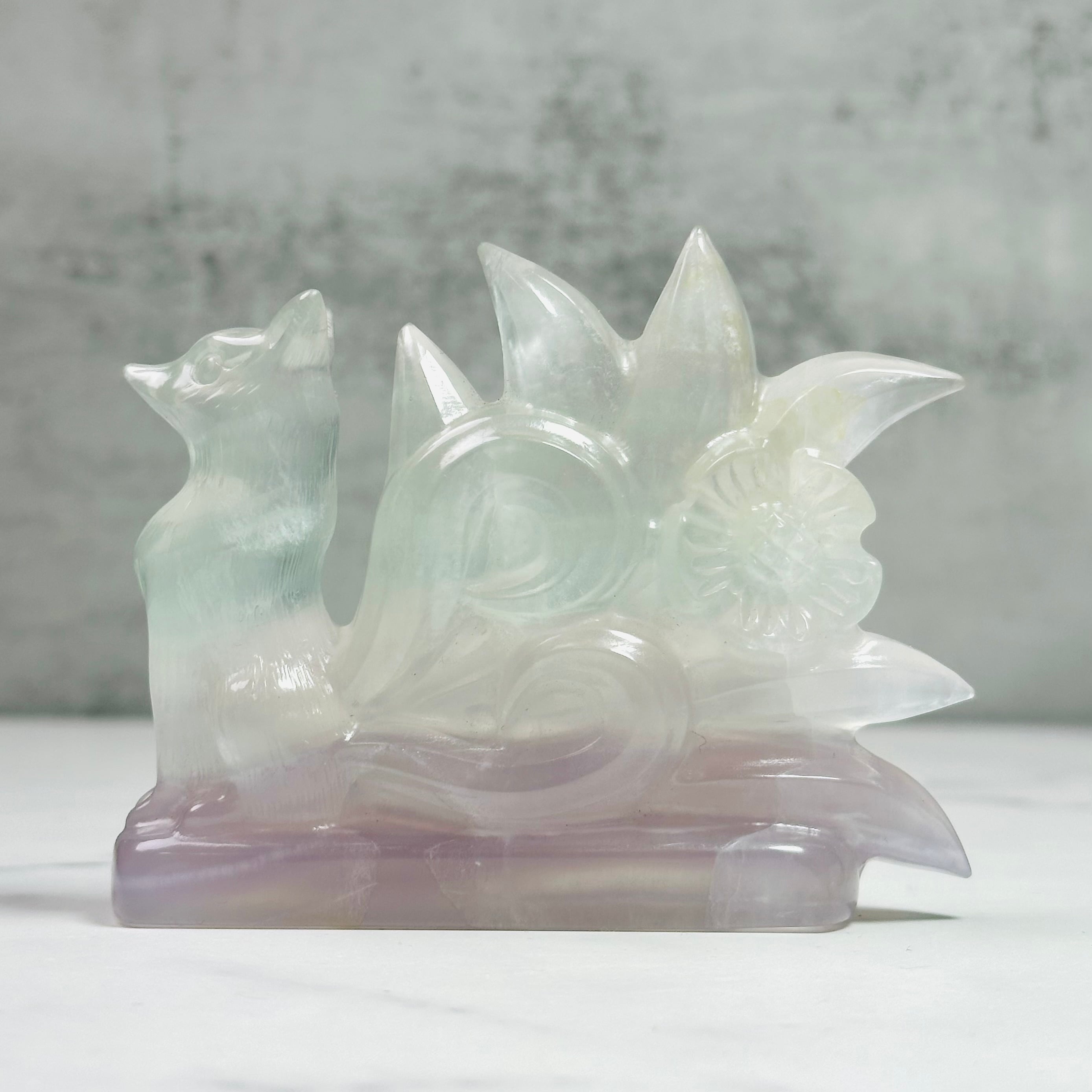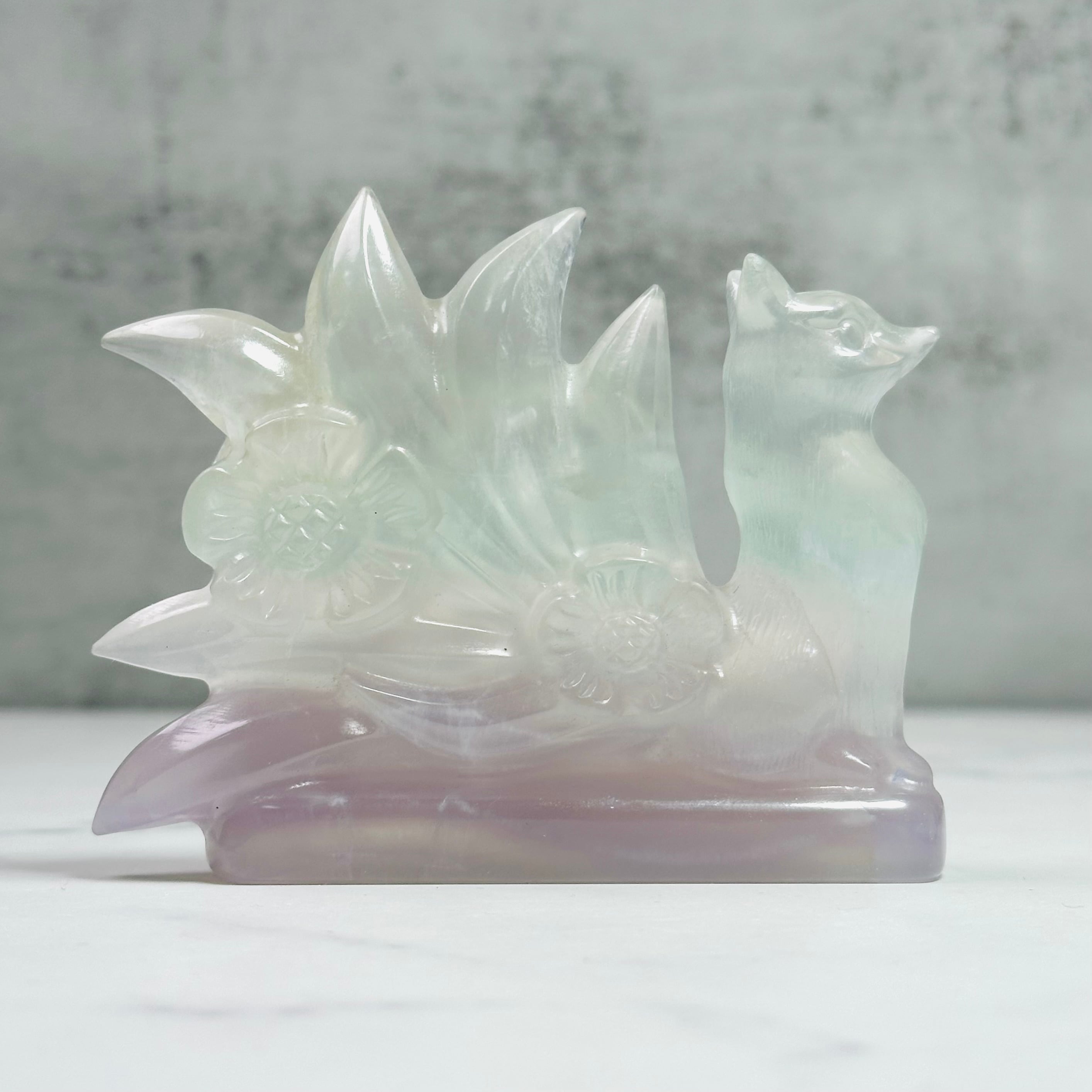 優しいパステルカラーのイットリウムフローライト九尾の狐。ボリュームたっぷりの尻尾がマイナスの気を流し、空間を浄化して良いエネルギーを呼び込みます。デスクや玄関などちょっとしたスペースに飾って癒しの空間にしてください。