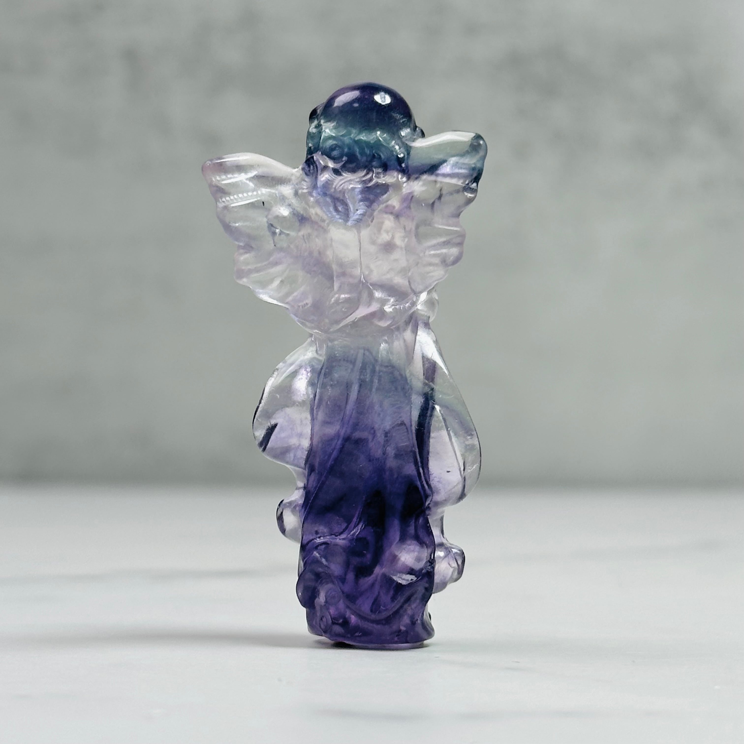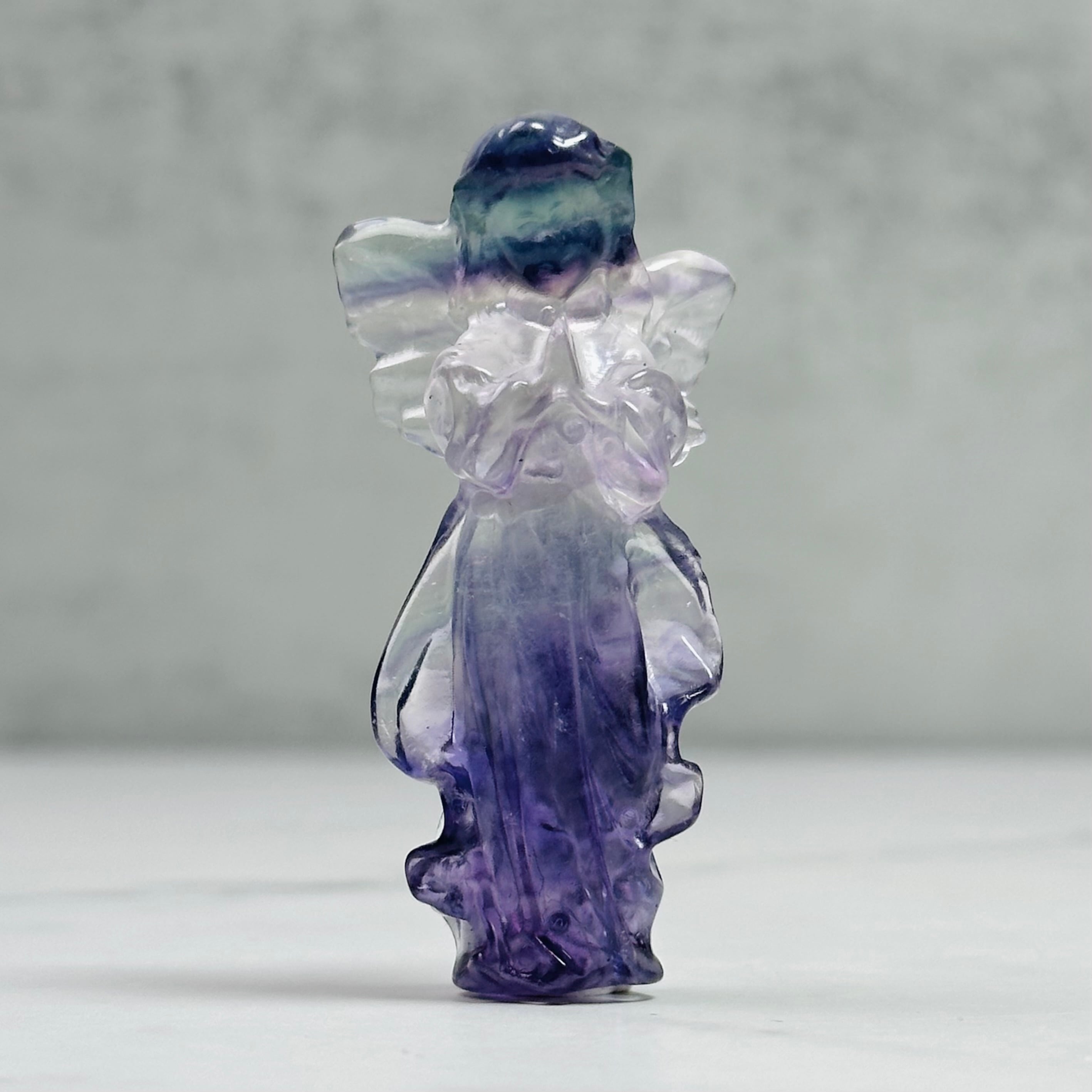 繊細な羽根とやわらかなフォルムが印象的なフローライトエンジェル。透明感のあるグリーンやパープルが美しく重なり合い、光を受けてやさしく見守ります。