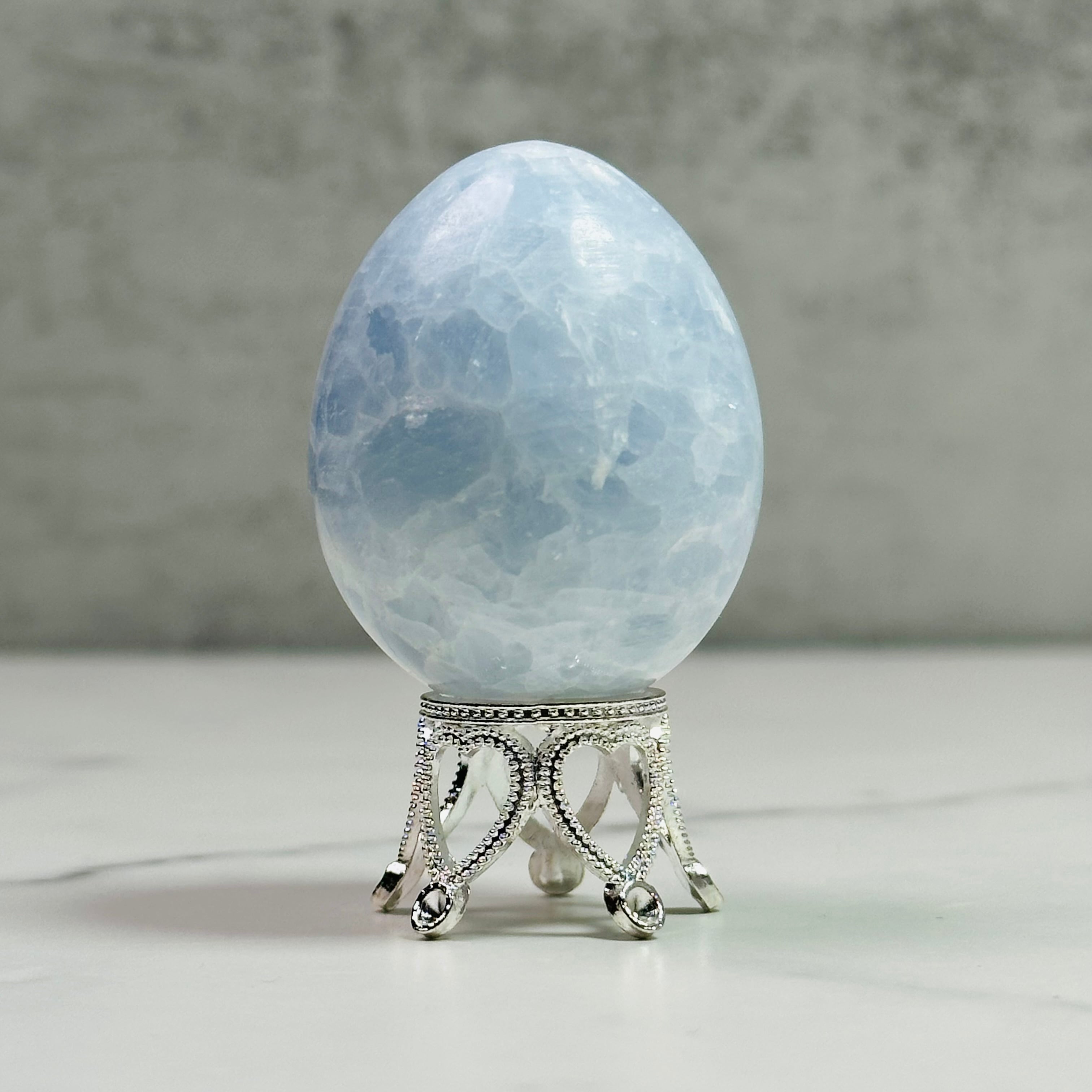 淡い空色が美しいセレスタイトを磨き上げたエッグ。爽やかなブルーは空や雲を閉じ込めたようです。丸みのある卵型で、手に取ると優しい雰囲気に包まれるような癒しを感じます。可愛らしい虹も見られ、お部屋を清らかな空間へと導いてくれます。