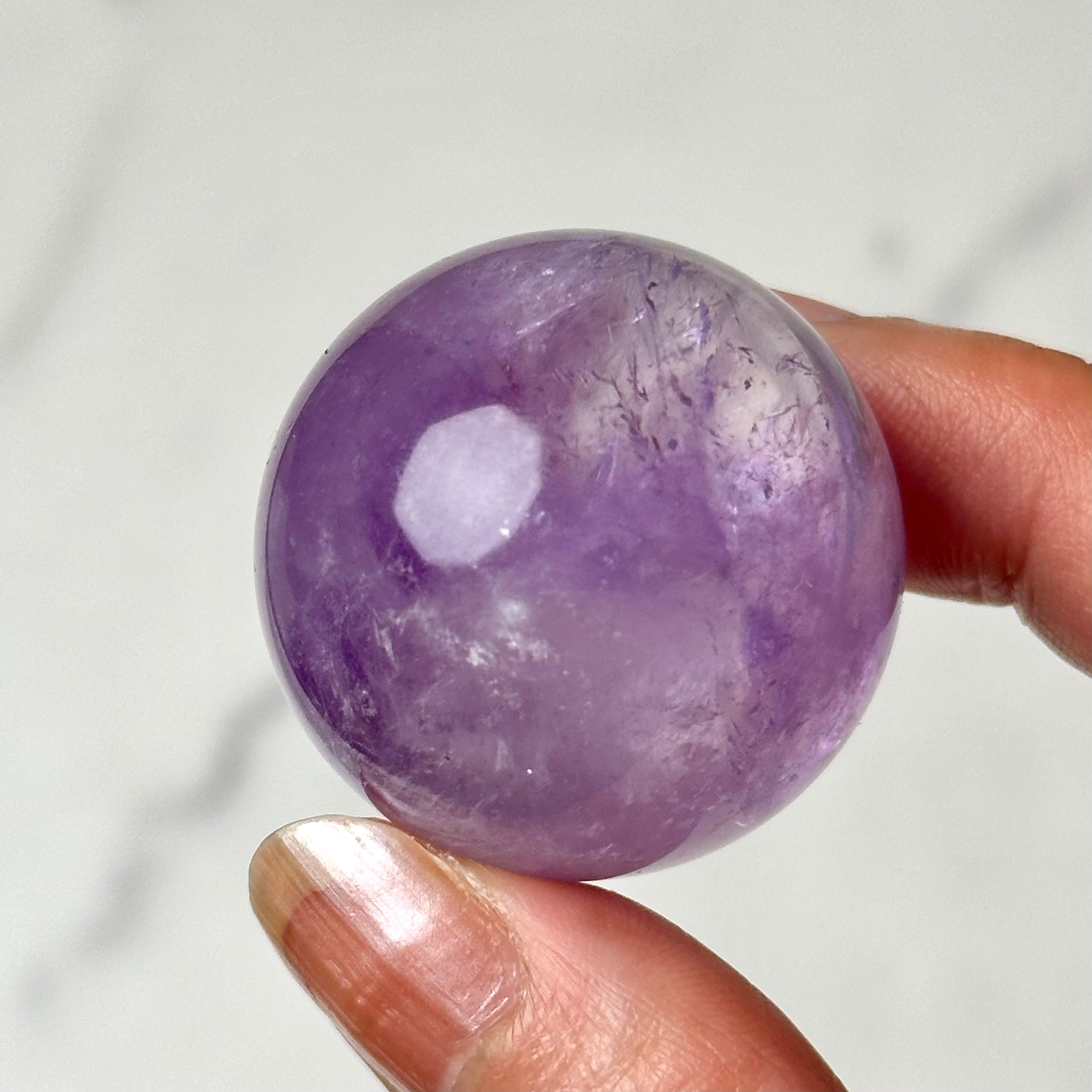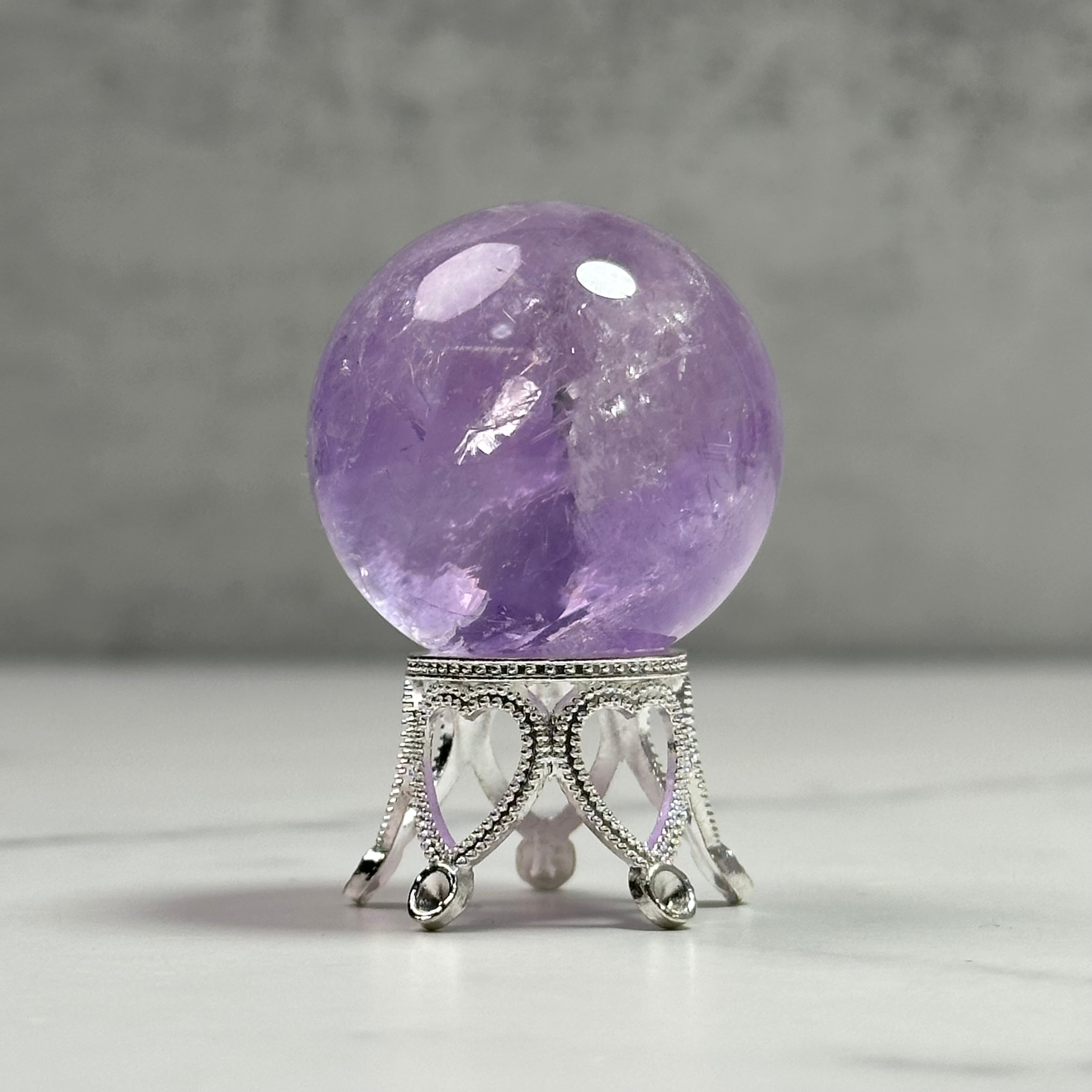 透明感あるラベンダーカラーが美しいアメジストスフィア。美しい虹を内包し、丸みのあるフォルムが穏やかに空間を整えます。